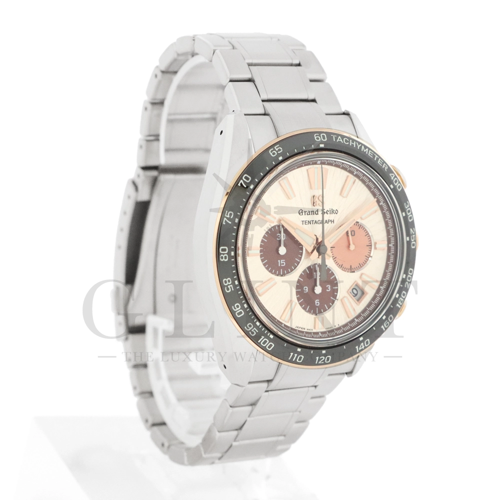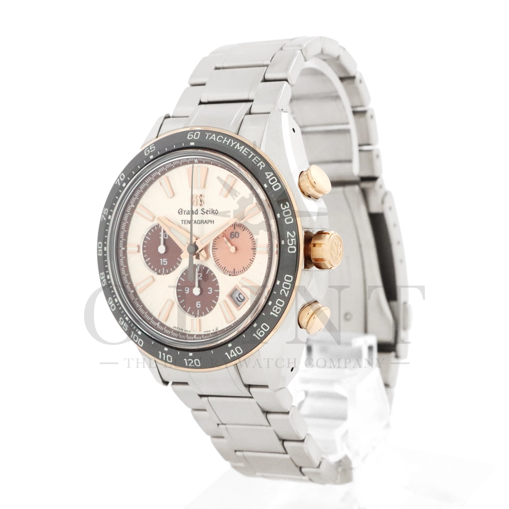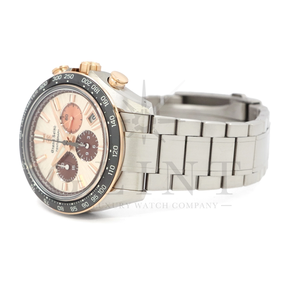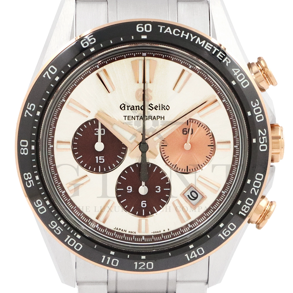 こちらはグランドセイコー エボリューション9 コレクション テンタグラフ 300本限定モデルです。グランドセイコーの新世代クロノグラフ テンタグラフ SLGC006は、ブランドの美学と精密技術を極限まで融合したメカニカルウォッチです。エボリューション9スタイルを採用し、日本の美意識とグランドセイコーの時計製造技術を高い次元で融合させています。文字盤には、グランドセイコーの製造拠点である「グランドセイコースタジオ 雫石」から望む岩手山の尾根筋をモチーフとした立体的な型打ち模様を。カッパーピンクの文字盤カラーは 朝日を浴びて輝く岩手山を想起させ、堂々とした佇まいを演出します。テンタグラフ(Tentagraph) の名称は“TEN beat(10振動/秒)”、“Three days(約3日間パワーリザーブ)”、“Automatic(自動巻)”、“ChronoGRAPH(クロノグラフ)”の4つの特徴から命名。毎秒10振動のハイビートムーブメントは安定した精度と優れた動作を実現し、フル巻上げで 約72時間(約3日間) の駆動が可能です。エボリューション9スタイルの高い視認性を実現するため、針とインデックスの間隔が最適化されており、多彩な情報を瞬時に読み取ることができます。日付表示は4〜5 時位置に配置し、サブダイヤルとの干渉を避けつつ12箇所のインデックスを確保。 裏ぶたには “LIMITED EDITION” の刻印と シリアルナンバー が入っています。SLGC006は、岩手山の自然美とグランドセイコーの高度なものづくりを結集した 世界限定のハイエンドメカニカルクロノグラフ です。着用するだけで日本の風景と技術哲学を感じられる一本であり、コレクターズピースとしても非常に魅力的なモデルと言えるでしょう。