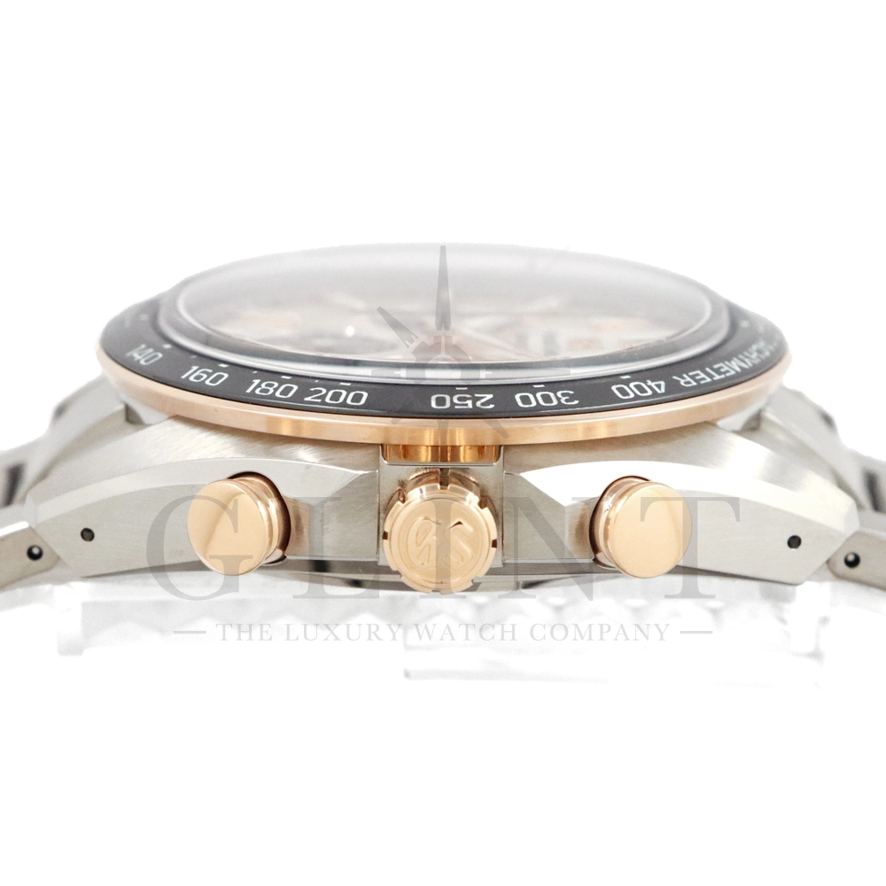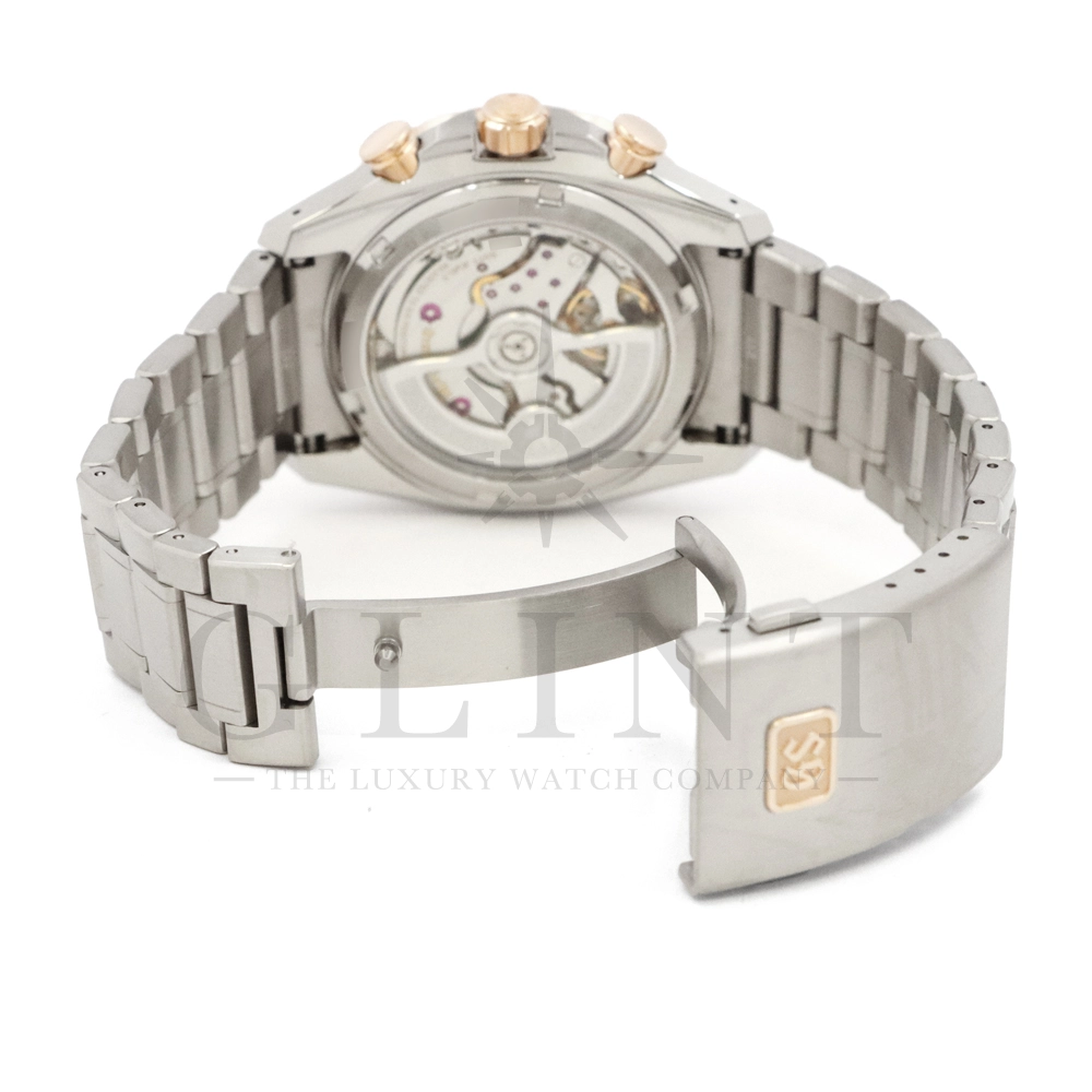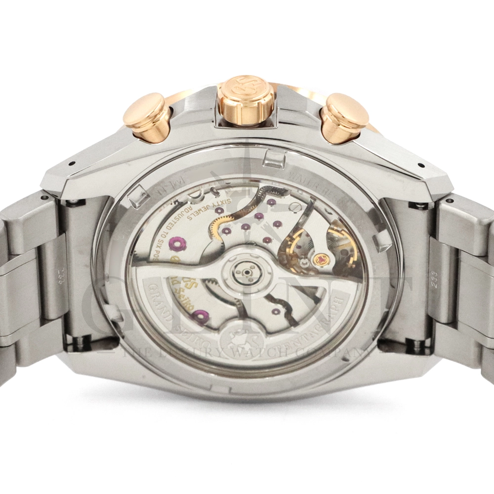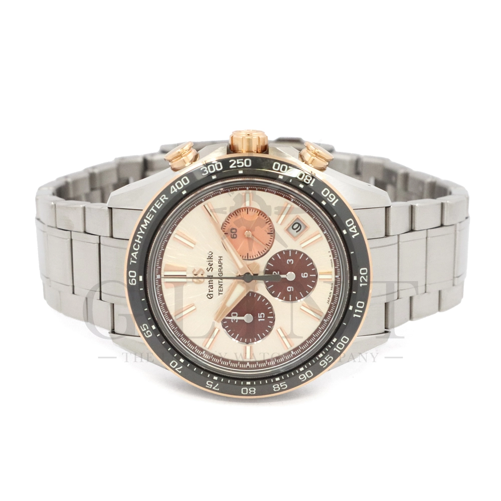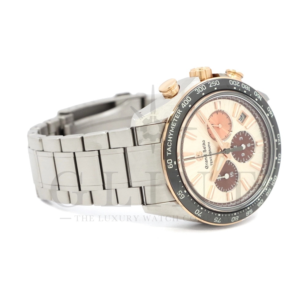 こちらはグランドセイコー エボリューション9 コレクション テンタグラフ 300本限定モデルです。グランドセイコーの新世代クロノグラフ テンタグラフ SLGC006は、ブランドの美学と精密技術を極限まで融合したメカニカルウォッチです。エボリューション9スタイルを採用し、日本の美意識とグランドセイコーの時計製造技術を高い次元で融合させています。文字盤には、グランドセイコーの製造拠点である「グランドセイコースタジオ 雫石」から望む岩手山の尾根筋をモチーフとした立体的な型打ち模様を。カッパーピンクの文字盤カラーは 朝日を浴びて輝く岩手山を想起させ、堂々とした佇まいを演出します。テンタグラフ(Tentagraph) の名称は“TEN beat(10振動/秒)”、“Three days(約3日間パワーリザーブ)”、“Automatic(自動巻)”、“ChronoGRAPH(クロノグラフ)”の4つの特徴から命名。毎秒10振動のハイビートムーブメントは安定した精度と優れた動作を実現し、フル巻上げで 約72時間(約3日間) の駆動が可能です。エボリューション9スタイルの高い視認性を実現するため、針とインデックスの間隔が最適化されており、多彩な情報を瞬時に読み取ることができます。日付表示は4〜5 時位置に配置し、サブダイヤルとの干渉を避けつつ12箇所のインデックスを確保。 裏ぶたには “LIMITED EDITION” の刻印と シリアルナンバー が入っています。SLGC006は、岩手山の自然美とグランドセイコーの高度なものづくりを結集した 世界限定のハイエンドメカニカルクロノグラフ です。着用するだけで日本の風景と技術哲学を感じられる一本であり、コレクターズピースとしても非常に魅力的なモデルと言えるでしょう。