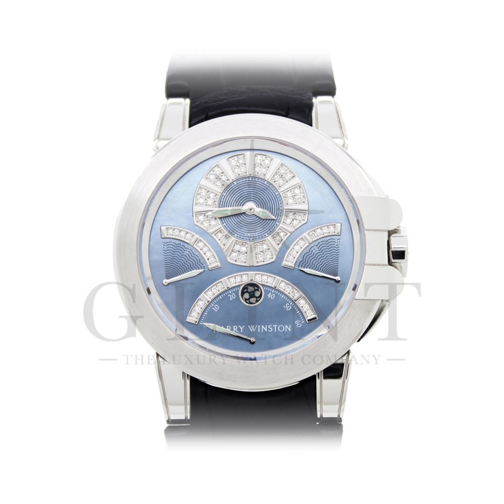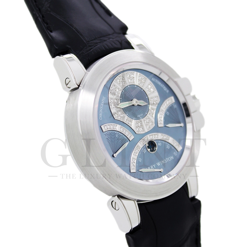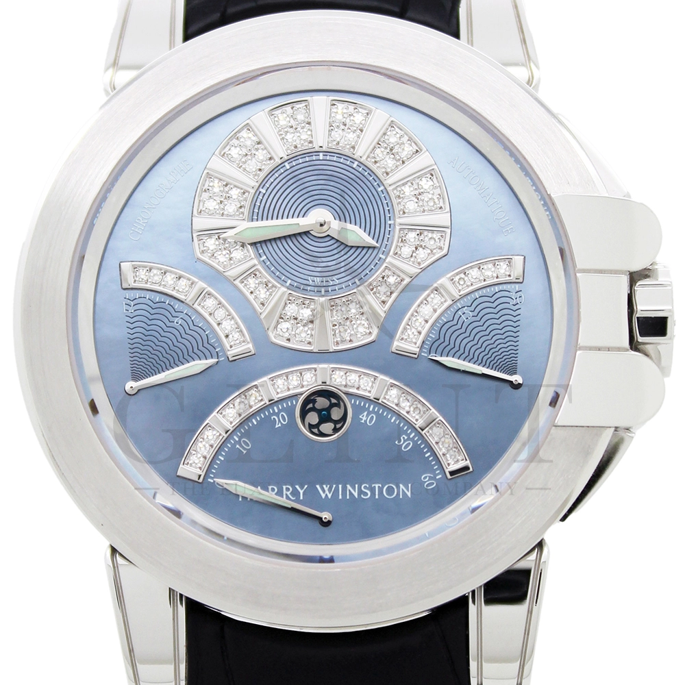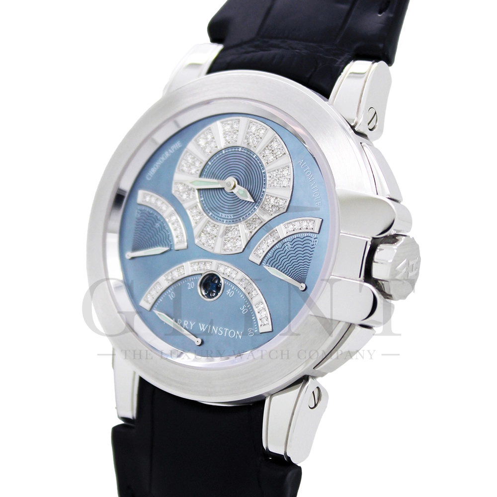 時計としての機能美、色合い、材質、全てにおいてこれ程上品で優雅な時計は見当たらない至極な一品です。世界的にもこちらのモデルは希少なモデルで、店頭に並ぶ事は滅多に無い商品となります。ジュエリーメーカーであるハリー・ウィンストンが選び抜いたホワイトダイヤモンド。鮮やかなブルーシェル。これらを上品にホワイトゴールドのケースでまとめた一品で、パーティーや特別な時に腕元を華やかにそして確かな存在感でに演出してくれます。