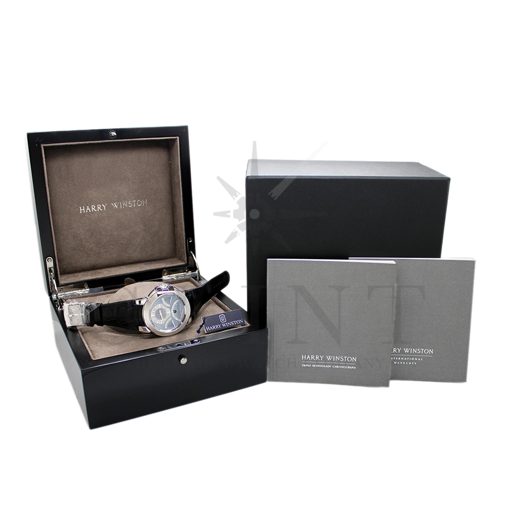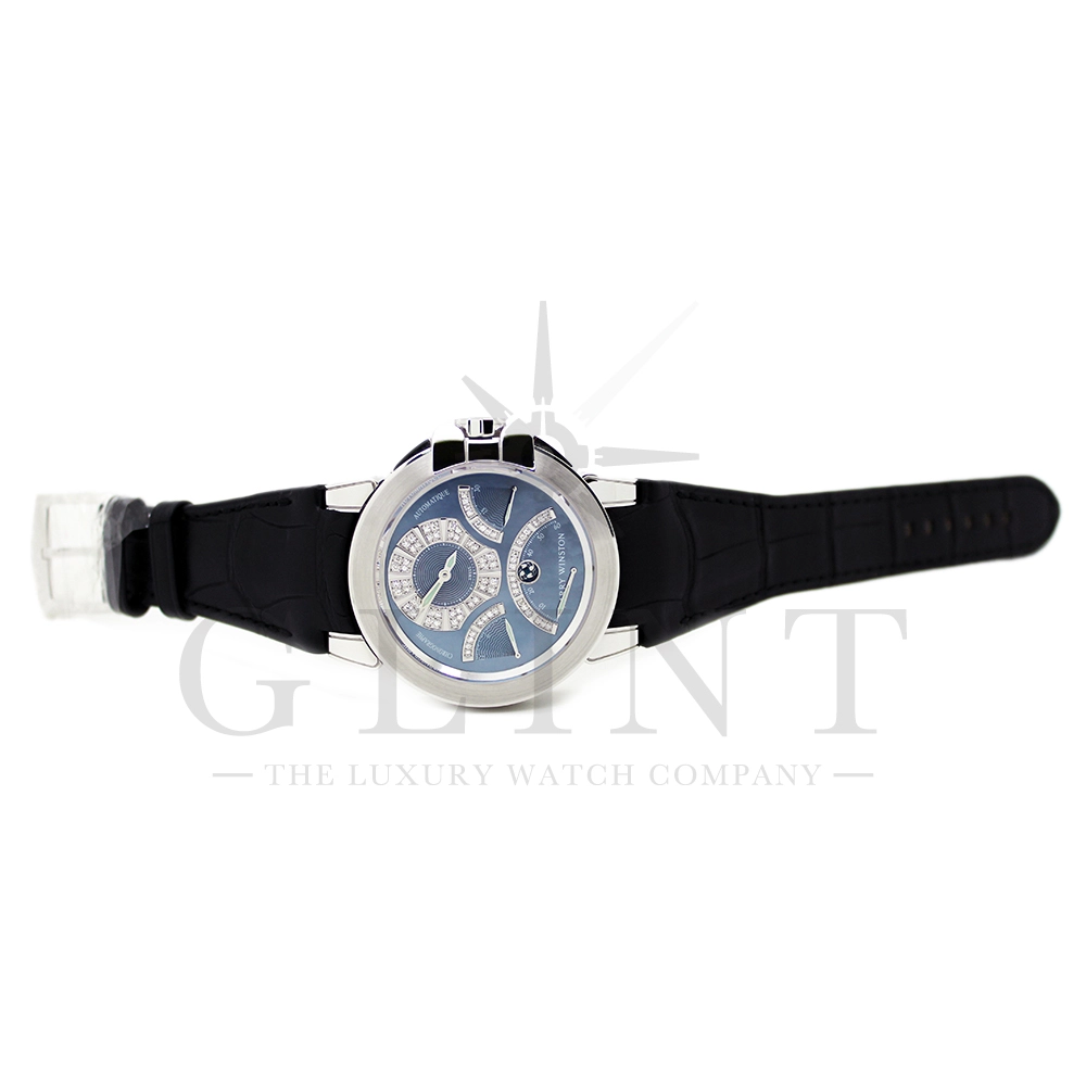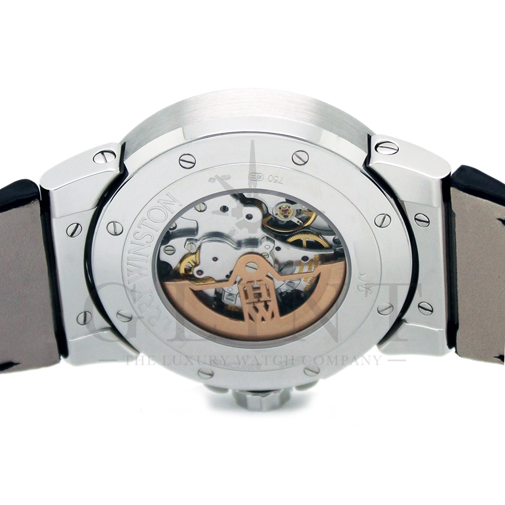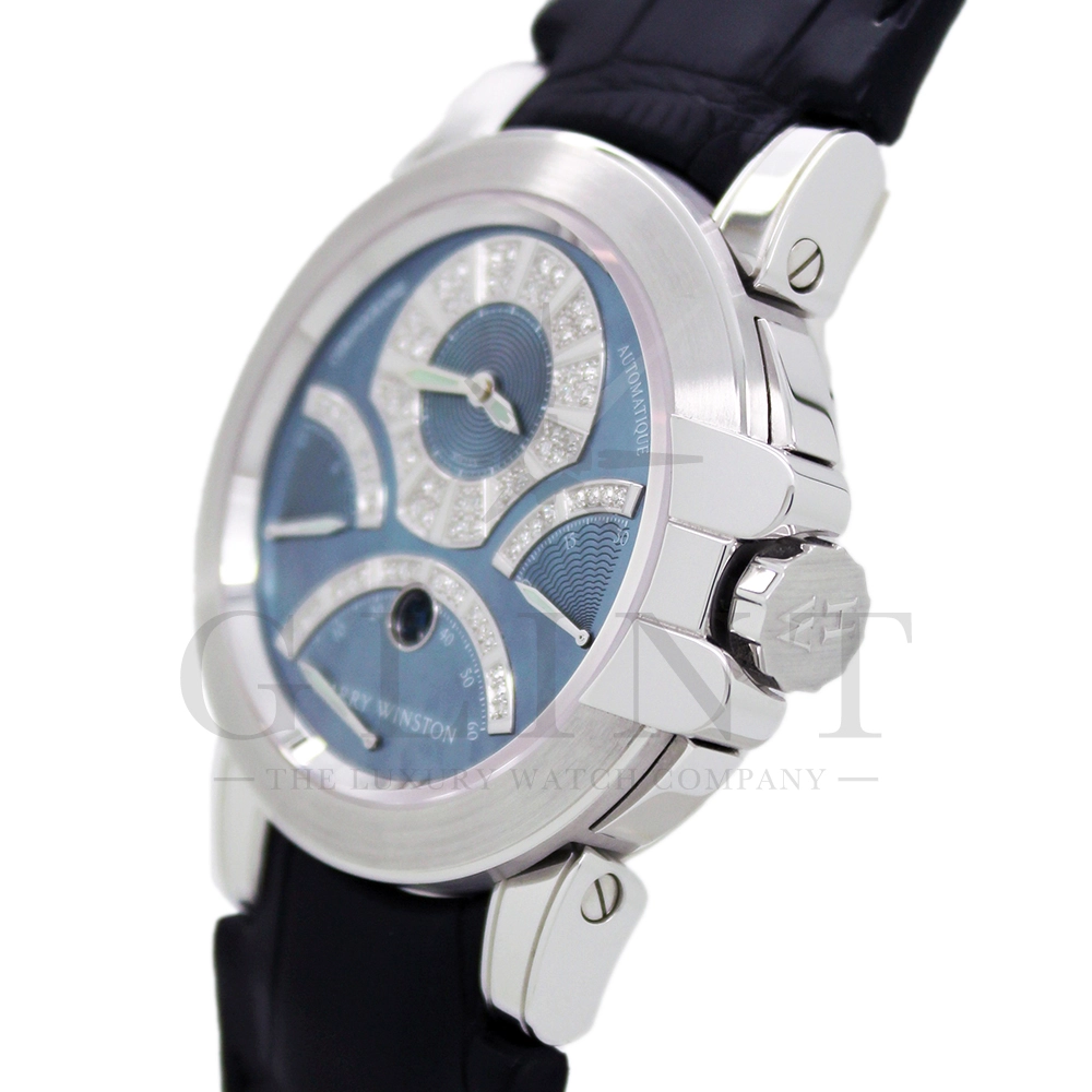時計としての機能美、色合い、材質、全てにおいてこれ程上品で優雅な時計は見当たらない至極な一品です。世界的にもこちらのモデルは希少なモデルで、店頭に並ぶ事は滅多に無い商品となります。ジュエリーメーカーであるハリー・ウィンストンが選び抜いたホワイトダイヤモンド。鮮やかなブルーシェル。これらを上品にホワイトゴールドのケースでまとめた一品で、パーティーや特別な時に腕元を華やかにそして確かな存在感でに演出してくれます。