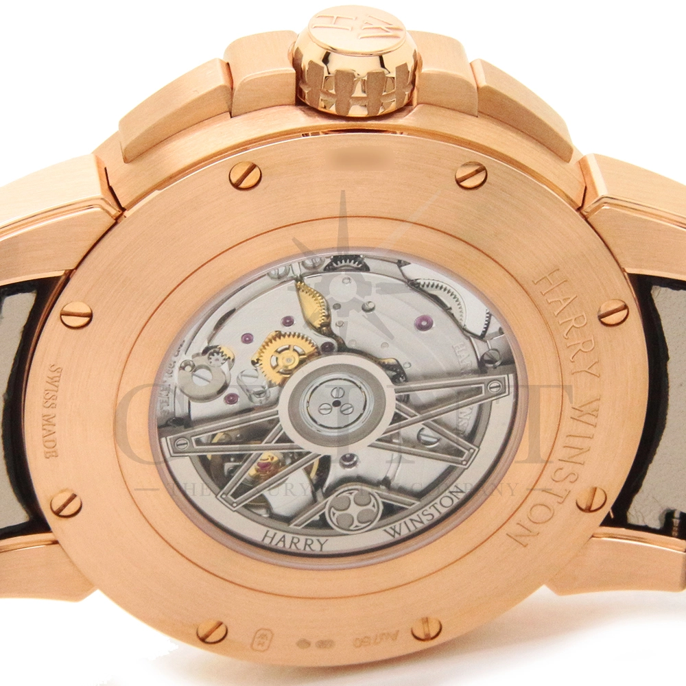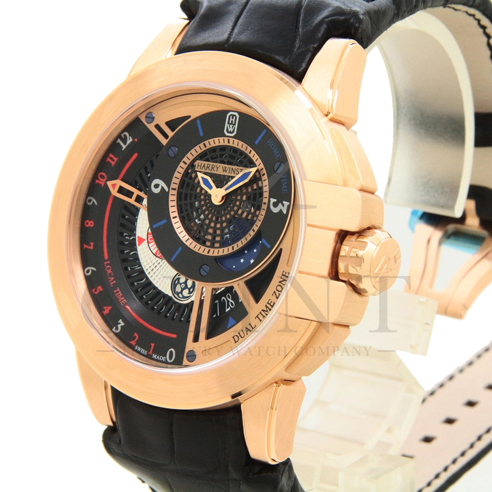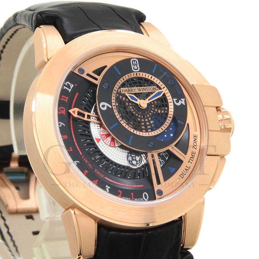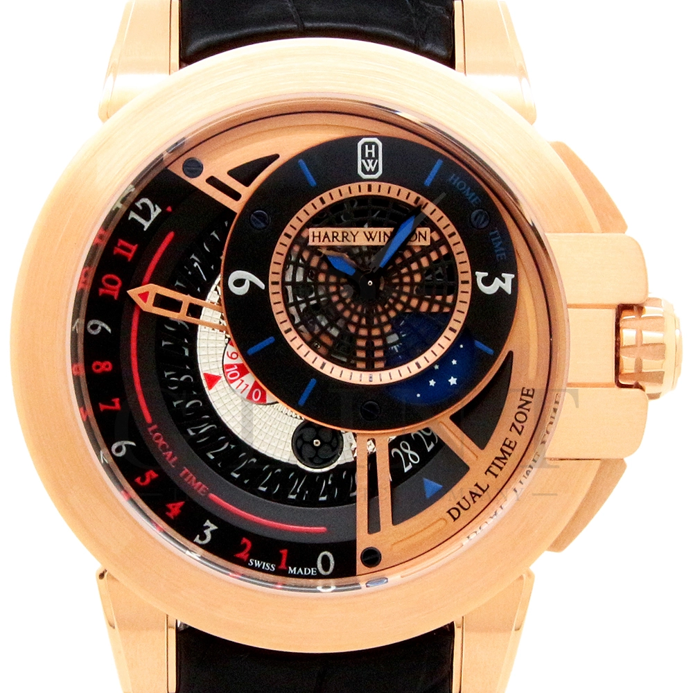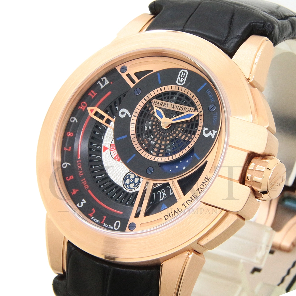 こちらはシリーズ8作目となる300本限定モデル「プロジェクトZ8」から派生し、ケース素材に18Kローズゴールドを採用した新モデルのオーシャン・デュアルタイム オートマティック44mmです。レトログラード表示のデュアルタイムとなっており、赤と青のカラーリングに識別しやすいデイ&ナイト表示によって、2つのタイムゾーンを容易に視認する事が出来ます。特にレトログラード表示のセカンドタイムは、従来ではリューズを時計回りの方向でしか時刻調整できなかった所を、独自のクラッチ連結遮断機能によって、両方向に回転させる事が出来る為、時差修正を瞬時に行う事を可能としました。ディティールにこだわったハリーウィンストンらしい独創的なデザインと機能美を実現したタイムピース。プライベートシーンやビジネスシーンでも活躍してくれる事は間違いないオシャレな一本です。