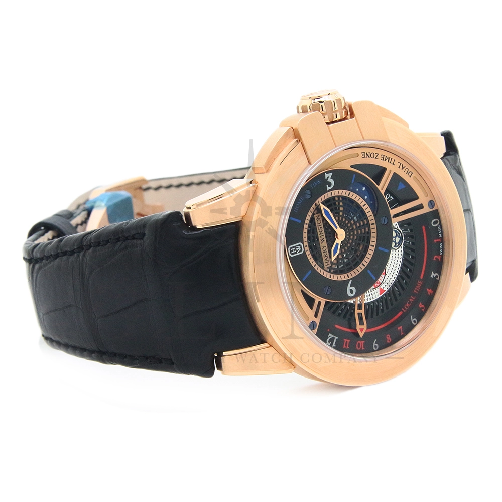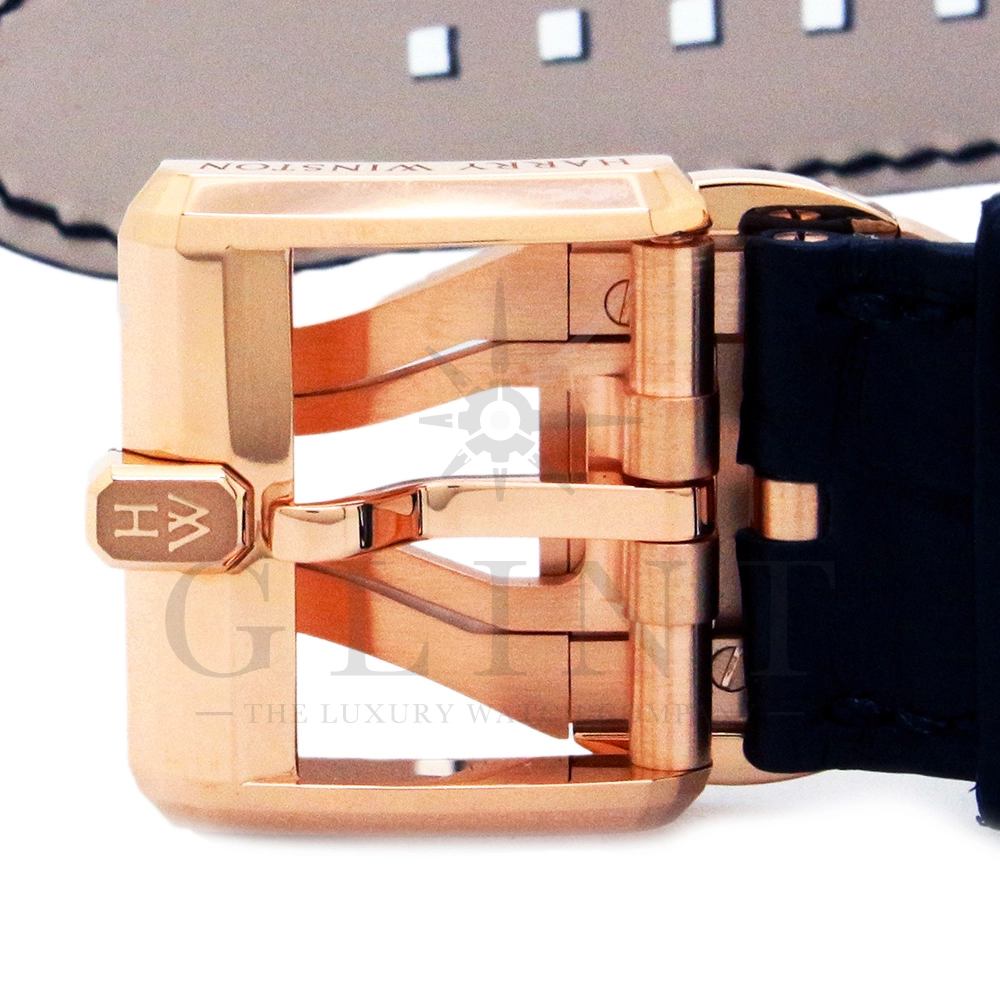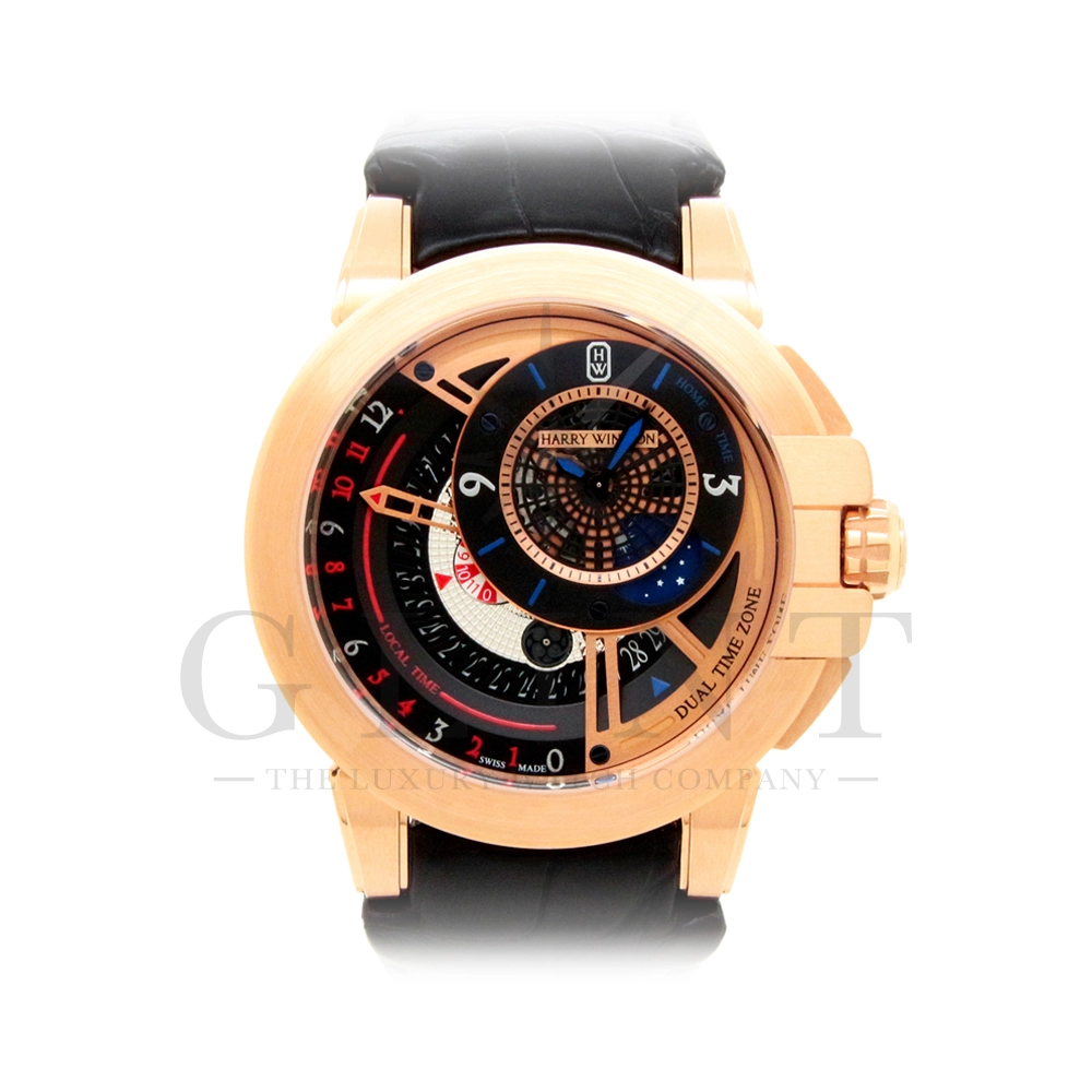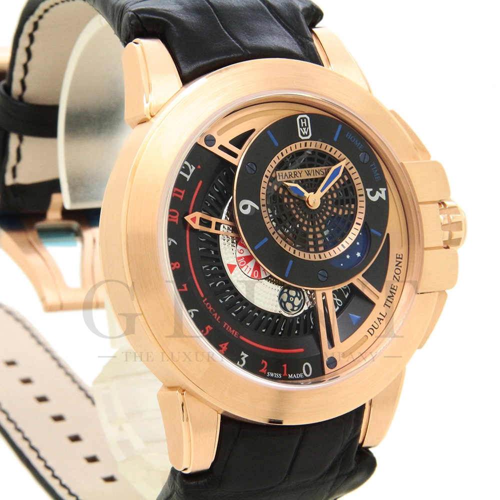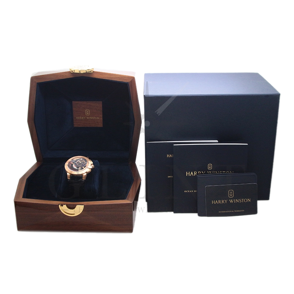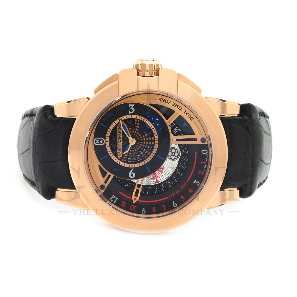 こちらはシリーズ8作目となる300本限定モデル「プロジェクトZ8」から派生し、ケース素材に18Kローズゴールドを採用した新モデルのオーシャン・デュアルタイム オートマティック44mmです。レトログラード表示のデュアルタイムとなっており、赤と青のカラーリングに識別しやすいデイ&ナイト表示によって、2つのタイムゾーンを容易に視認する事が出来ます。特にレトログラード表示のセカンドタイムは、従来ではリューズを時計回りの方向でしか時刻調整できなかった所を、独自のクラッチ連結遮断機能によって、両方向に回転させる事が出来る為、時差修正を瞬時に行う事を可能としました。ディティールにこだわったハリーウィンストンらしい独創的なデザインと機能美を実現したタイムピース。プライベートシーンやビジネスシーンでも活躍してくれる事は間違いないオシャレな一本です。