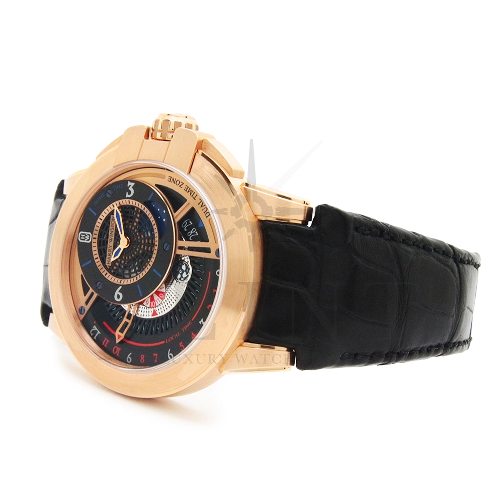 仕様:オフセンターの時・分、日付表示 昼夜インジケーター 手裏剣型機能インジケーター レトログラード式第二時間帯表示 シースルーバック