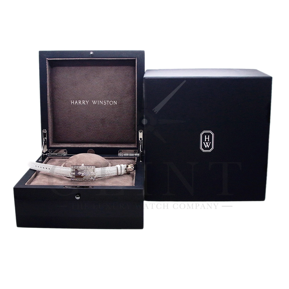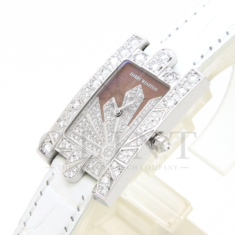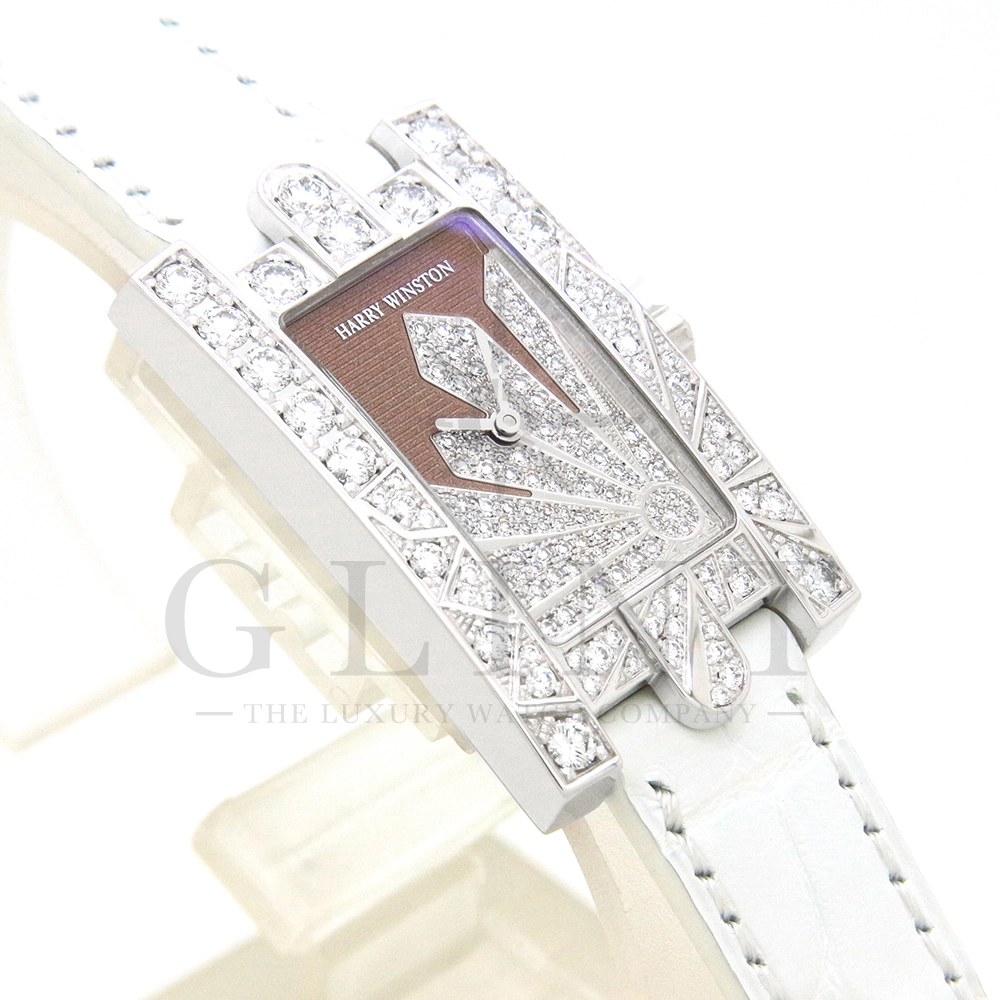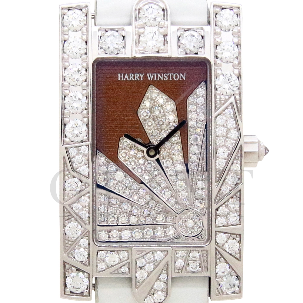 ハリー・ウィンストン ザ・ナイト・アヴェニューです。“キング・オブ・ダイヤモンド”の名に相応しい極上の最高級ダイヤモンドを贅沢にセッティングされた純正モデル。ダイヤモンドで描かれたフラワー模様が幻想的な雰囲気を醸し出してくれます。リュウズ部分にもダイヤモンドがセッティングされており、眩いほどの美しい輝きで腕元を華やかに演出してくれるでしょう。大人の女性のために考え抜かれた繊細かつ上質な雰囲気を漂わせる非常に美しい逸品です。この機会に高度な職人技と美学の集大成で世界を席巻するトップジュエラーの圧倒的な輝きをぜひ腕元で体感してみてはいかがでしょうか。