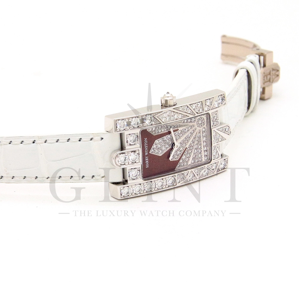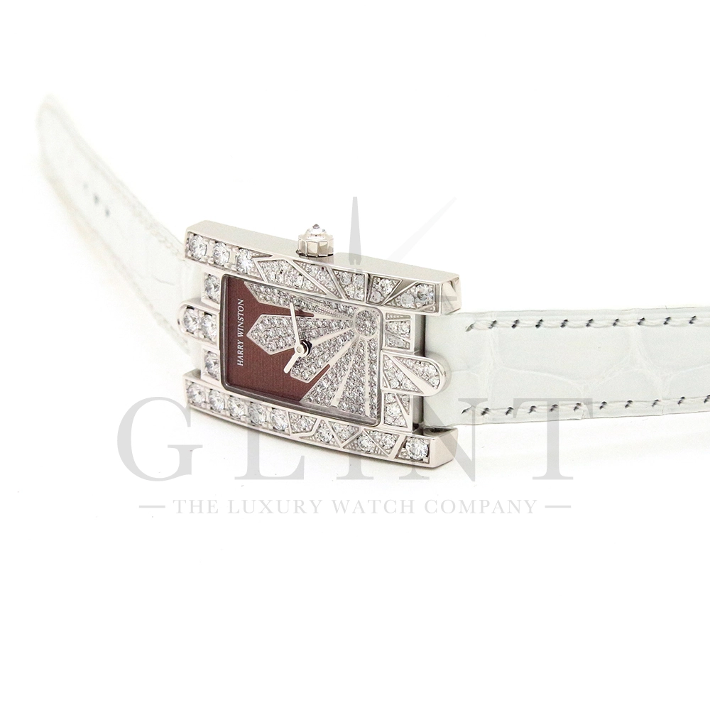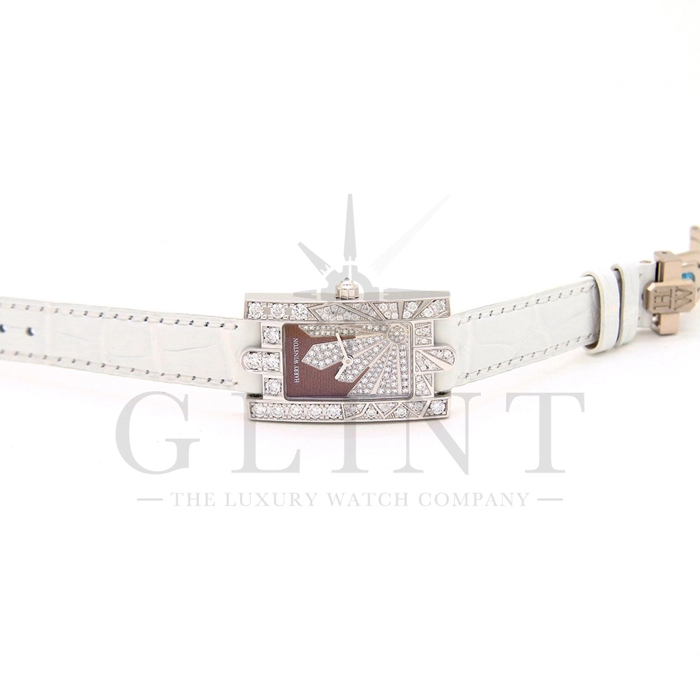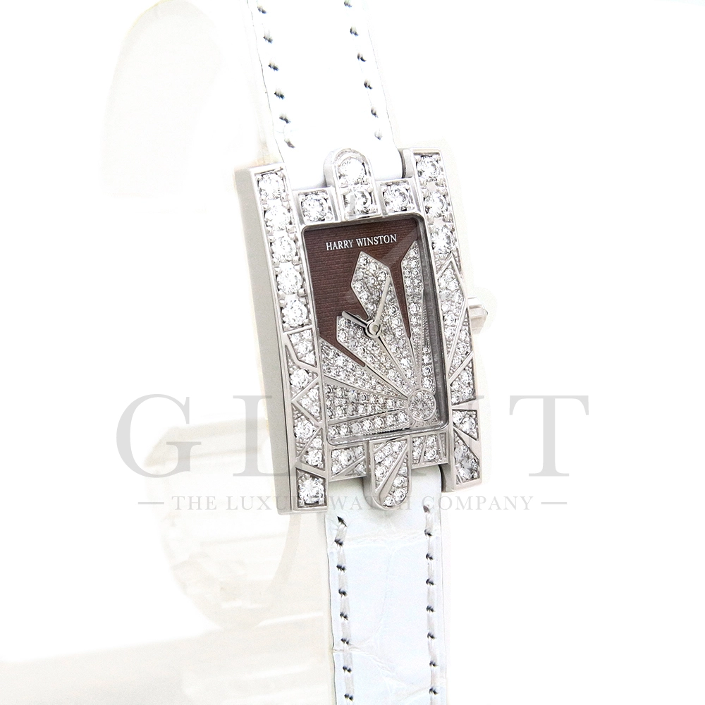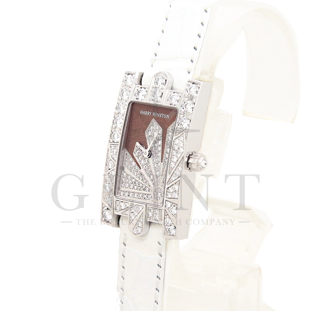 ハリー・ウィンストン ザ・ナイト・アヴェニューです。“キング・オブ・ダイヤモンド”の名に相応しい極上の最高級ダイヤモンドを贅沢にセッティングされた純正モデル。ダイヤモンドで描かれたフラワー模様が幻想的な雰囲気を醸し出してくれます。リュウズ部分にもダイヤモンドがセッティングされており、眩いほどの美しい輝きで腕元を華やかに演出してくれるでしょう。大人の女性のために考え抜かれた繊細かつ上質な雰囲気を漂わせる非常に美しい逸品です。この機会に高度な職人技と美学の集大成で世界を席巻するトップジュエラーの圧倒的な輝きをぜひ腕元で体感してみてはいかがでしょうか。