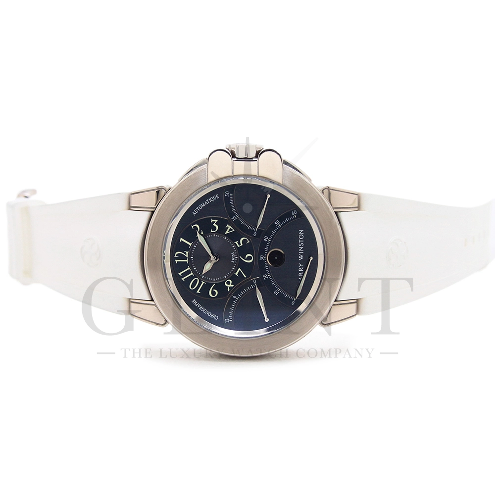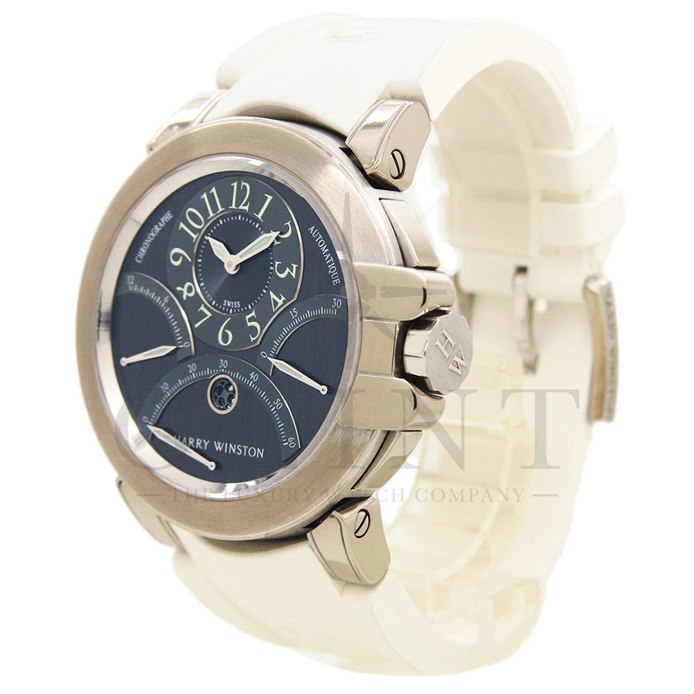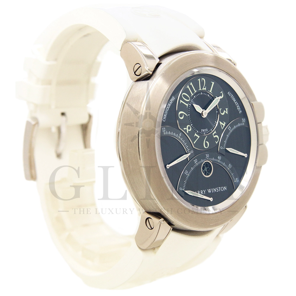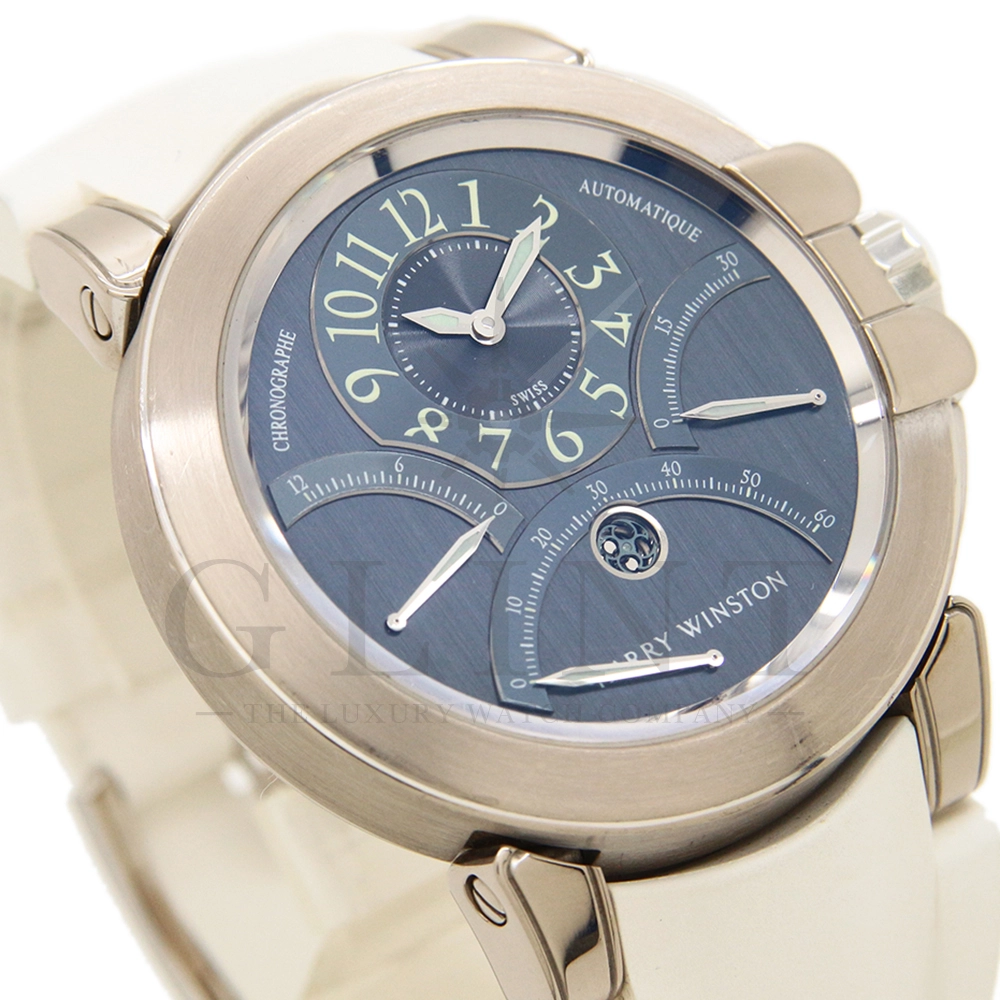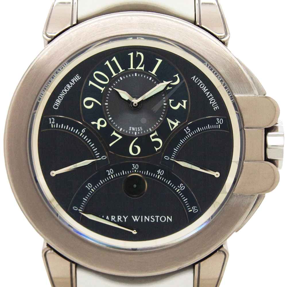 12時間積算系針と30分積算系針と60秒針をレトログラード機構に改良し、12時側寄りオフセンターに時刻表示を変更するなど、ハリー・ウィンストンの時計に対する世界観がより広がったモデルです。ジュエリーメーカーらしいエレガントなイメージに作り上げています。