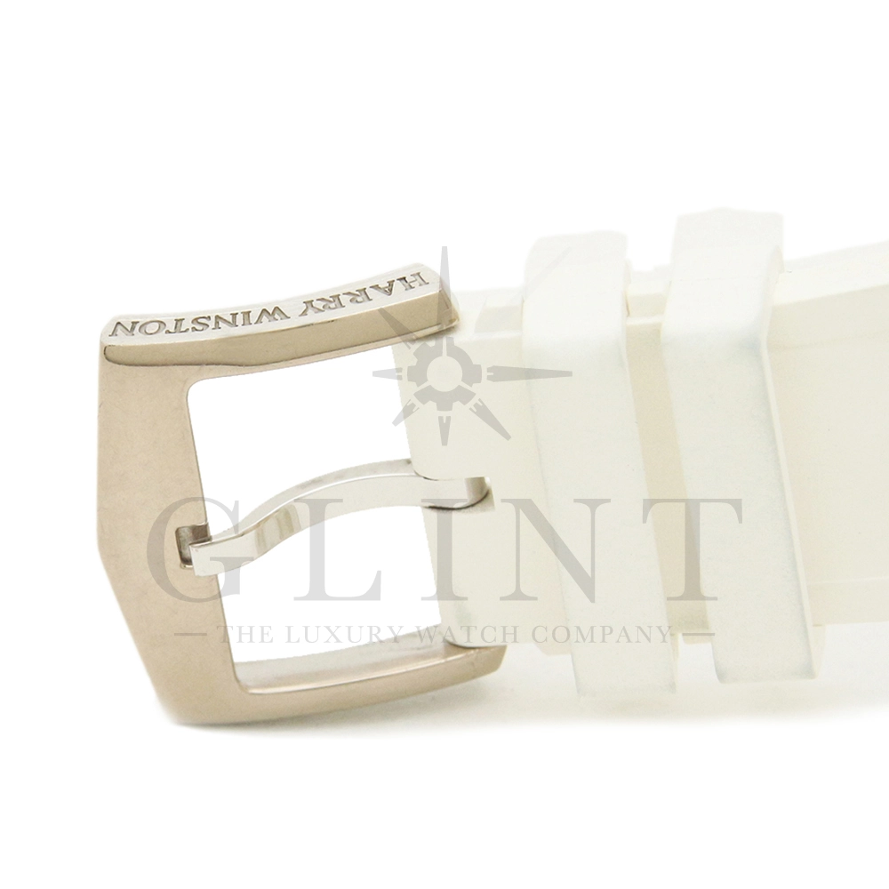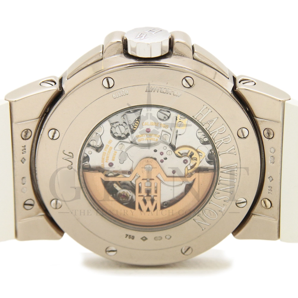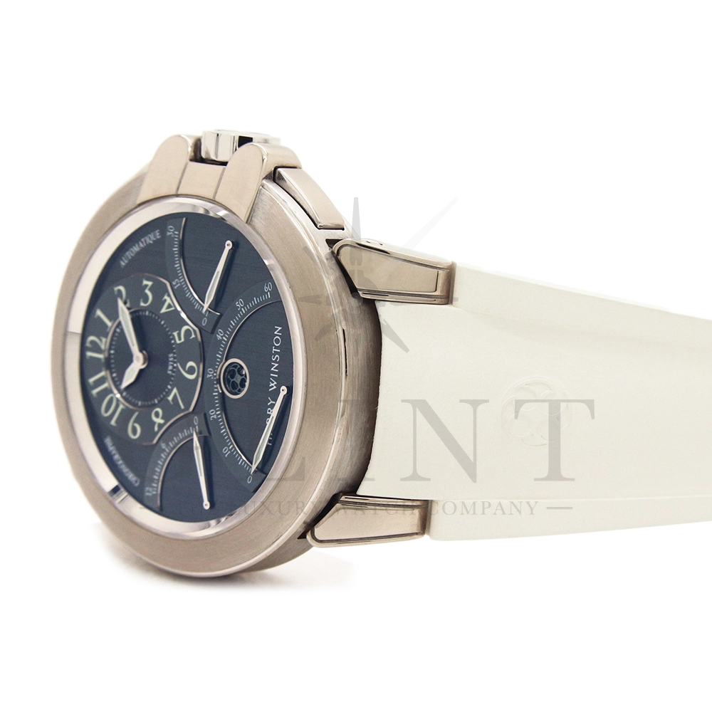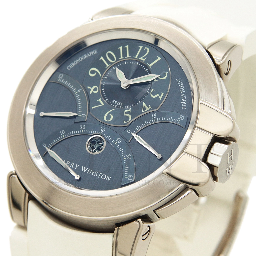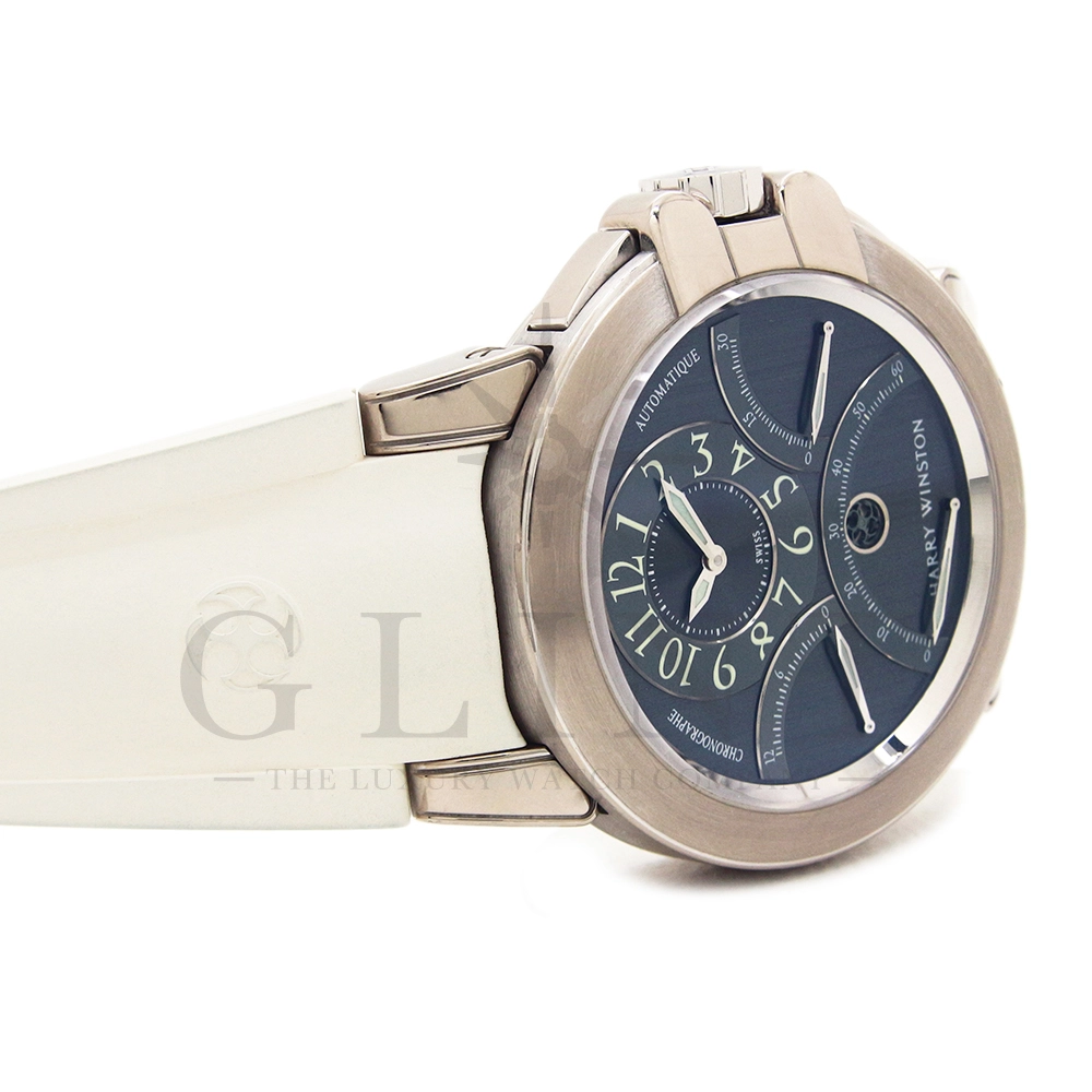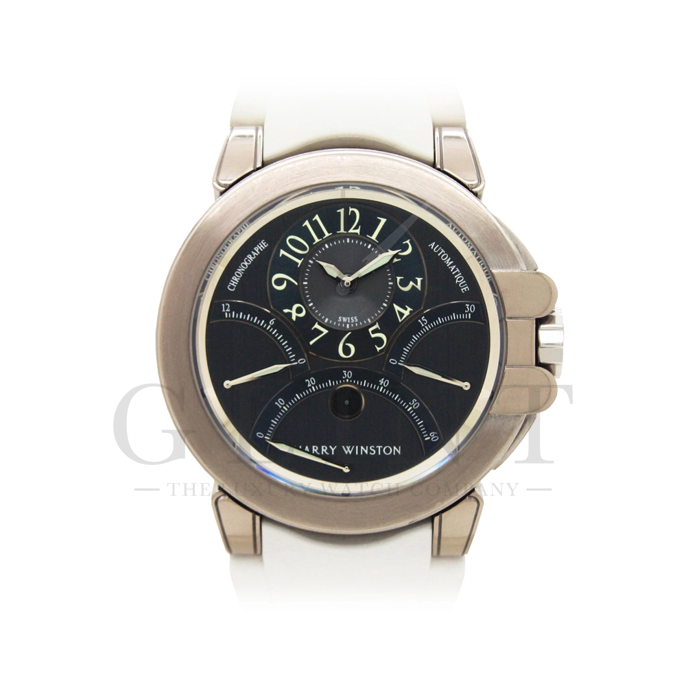 12時間積算系針と30分積算系針と60秒針をレトログラード機構に改良し、12時側寄りオフセンターに時刻表示を変更するなど、ハリー・ウィンストンの時計に対する世界観がより広がったモデルです。ジュエリーメーカーらしいエレガントなイメージに作り上げています。