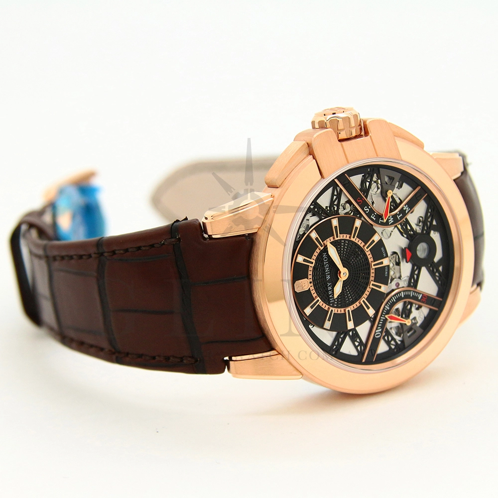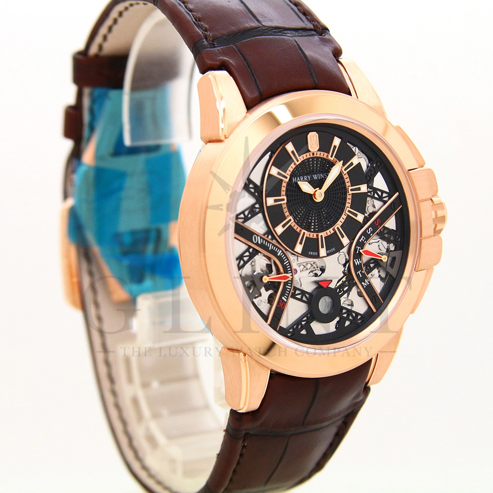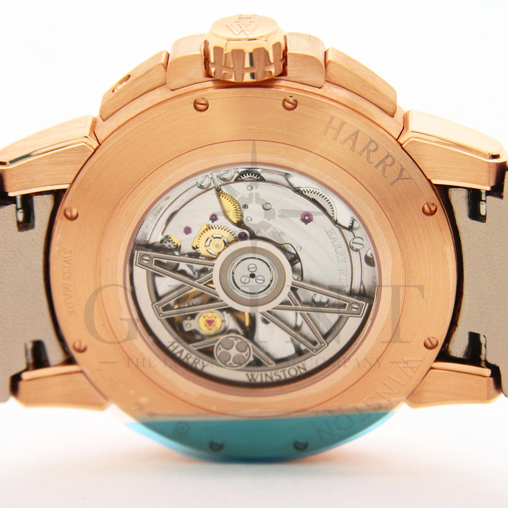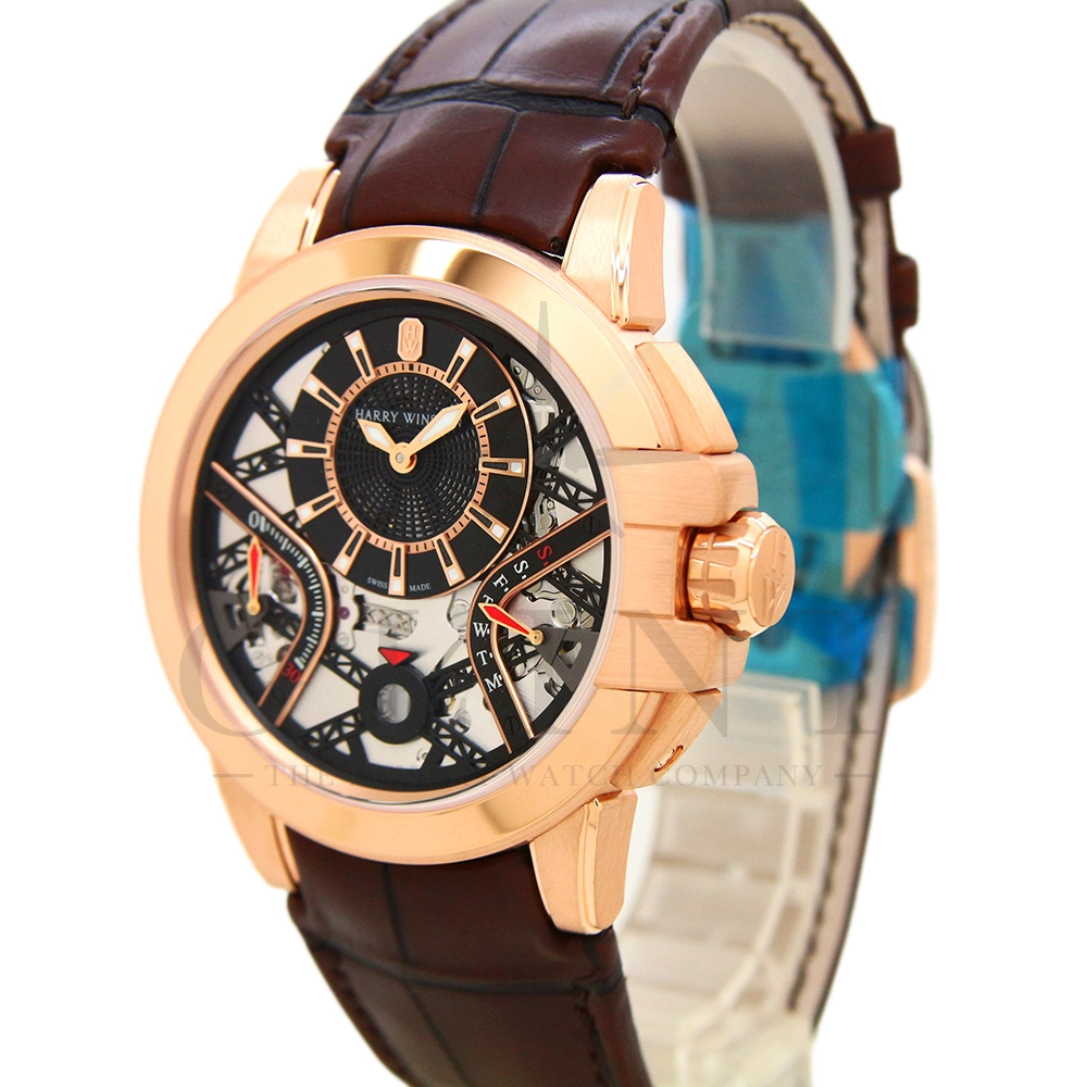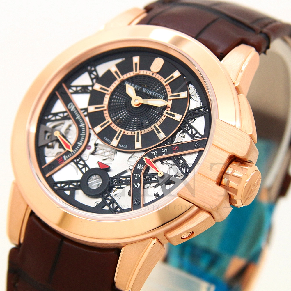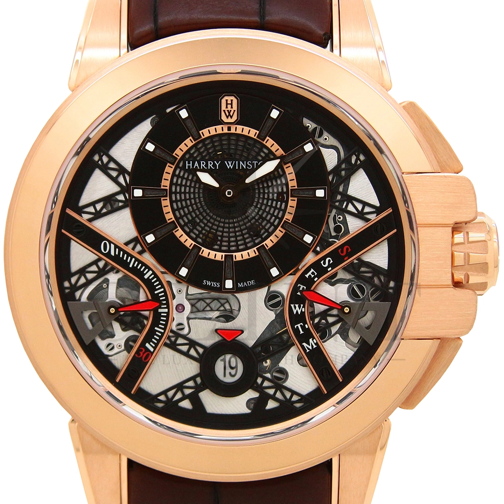 ハリー・ウィンストンが革新的な技術や素材、伝統的な時計作りの技を融合させる事で新たな個性を創造する意味を込められた限定生産シリーズ「プロジェクト Z」。こちらのモデルはニューヨークで有名な建造物であるマンハッタンブリッジから着想を得て製作された「プロジェクト Z10」のデザインを継承し、素材に18Kローズゴールドを用いたオーシャン・バイレトログラード オートマティック 42mmです。オフセンターで配置された時・分の表示と、レトログラード式の秒・曜日表示を装備し、6時位置には日付表示を備え、見た目の豪華さとは裏腹に実用性にも優れた一本。ダイアルの仕様も工夫されており、時・分を表示するインダイアルには、ガルバニック加工によりブラックに染められたサーキュラーサテン仕上げのチャプターリングを備え、その上には18Kローズゴールドのインデックスを装備。スケルトナイズされた文字盤はメカニカルでスタイリッシュな雰囲気を演出してくれます。ケース素材と合わせたブラウンカラーのレザーベルトは時計に高級感をもたらせてくれるでしょう。ハリー・ウィンストンらしい独創的で美しい雰囲気を心ゆくまで堪能できる逸品です。