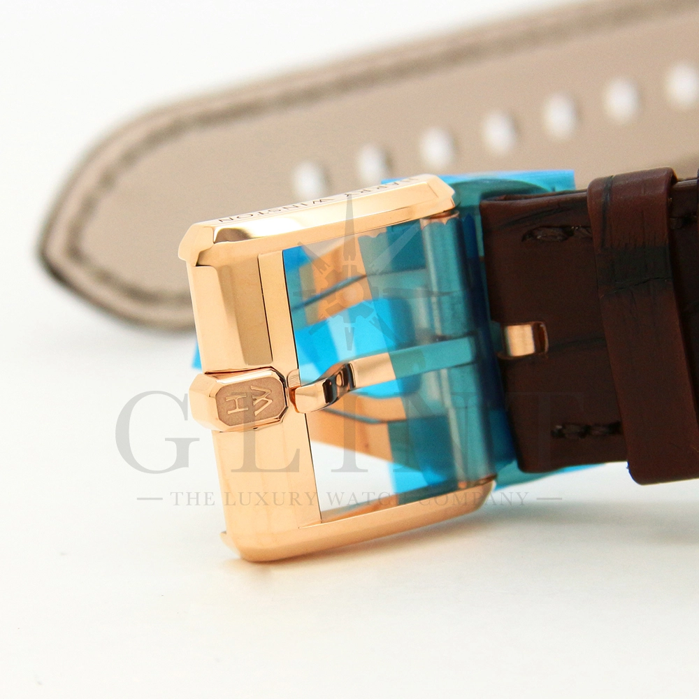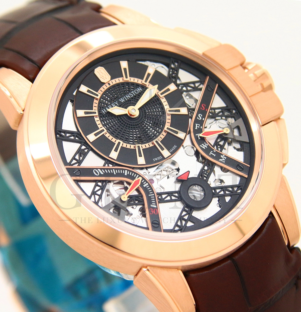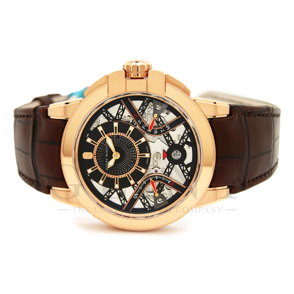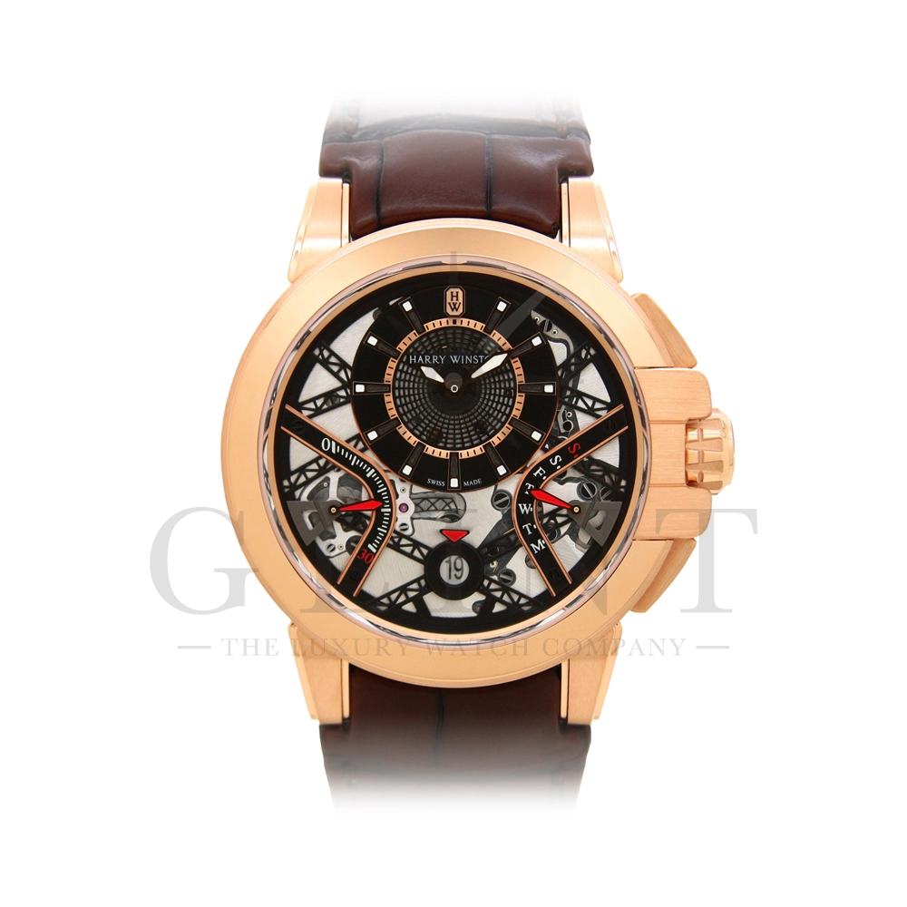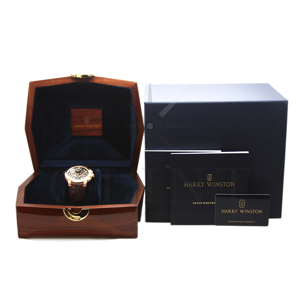 ハリー・ウィンストンが革新的な技術や素材、伝統的な時計作りの技を融合させる事で新たな個性を創造する意味を込められた限定生産シリーズ「プロジェクト Z」。こちらのモデルはニューヨークで有名な建造物であるマンハッタンブリッジから着想を得て製作された「プロジェクト Z10」のデザインを継承し、素材に18Kローズゴールドを用いたオーシャン・バイレトログラード オートマティック 42mmです。オフセンターで配置された時・分の表示と、レトログラード式の秒・曜日表示を装備し、6時位置には日付表示を備え、見た目の豪華さとは裏腹に実用性にも優れた一本。ダイアルの仕様も工夫されており、時・分を表示するインダイアルには、ガルバニック加工によりブラックに染められたサーキュラーサテン仕上げのチャプターリングを備え、その上には18Kローズゴールドのインデックスを装備。スケルトナイズされた文字盤はメカニカルでスタイリッシュな雰囲気を演出してくれます。ケース素材と合わせたブラウンカラーのレザーベルトは時計に高級感をもたらせてくれるでしょう。ハリー・ウィンストンらしい独創的で美しい雰囲気を心ゆくまで堪能できる逸品です。