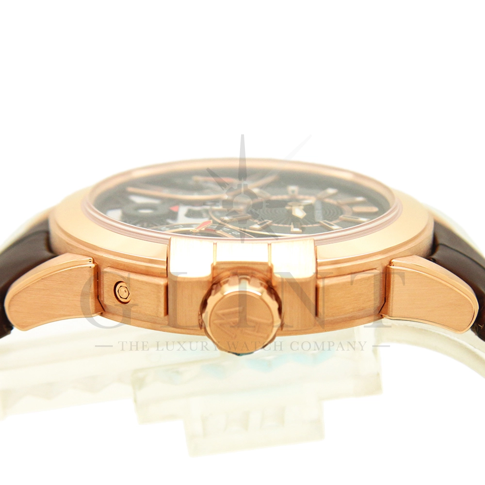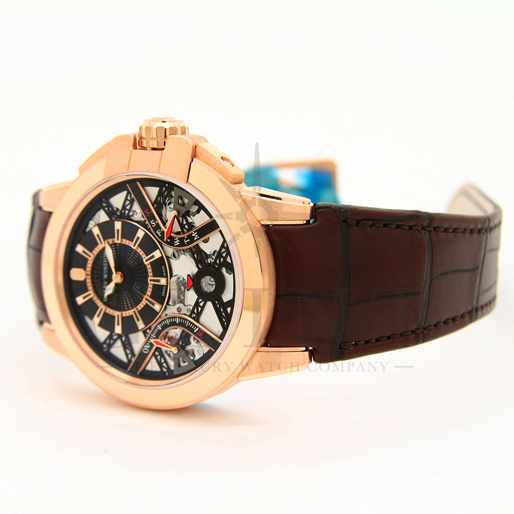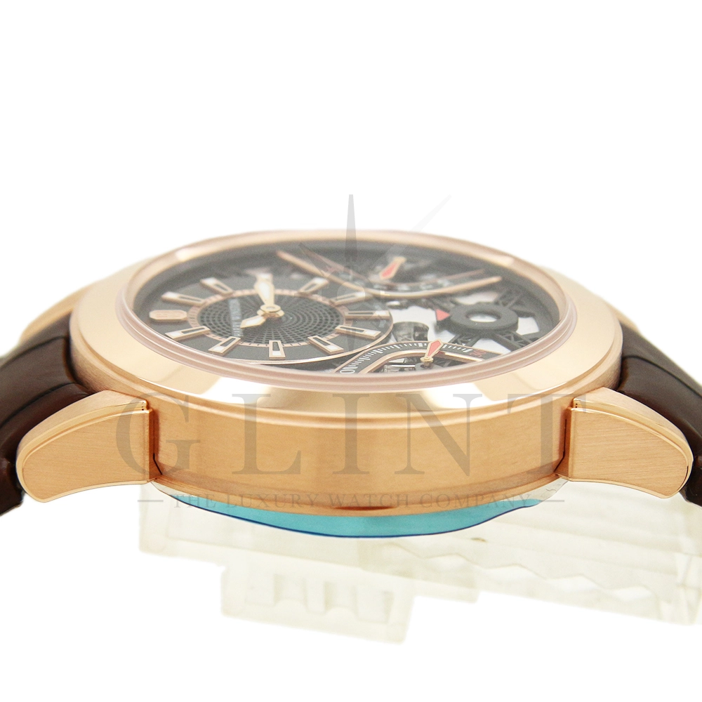 文字盤:18Kローズゴールド、ガルバニックブラックサーキュラーサテン仕上げのチャプターリング、18Kローズゴールドのインデックス,センターにオープンワークのグリッド