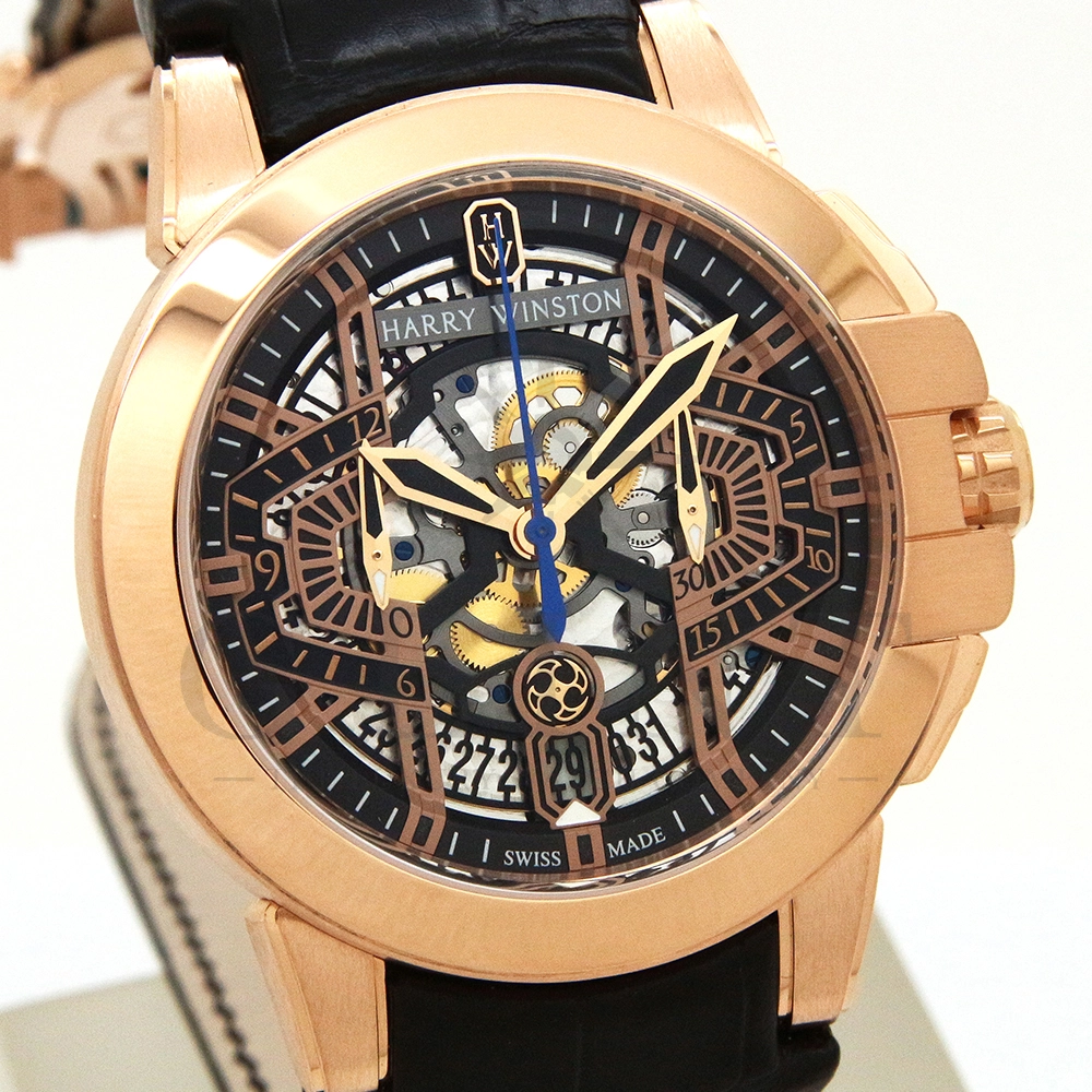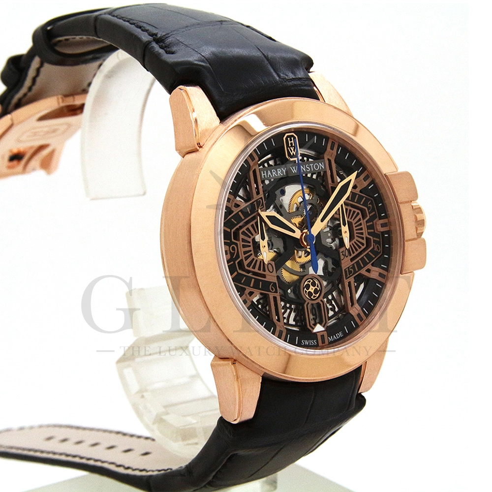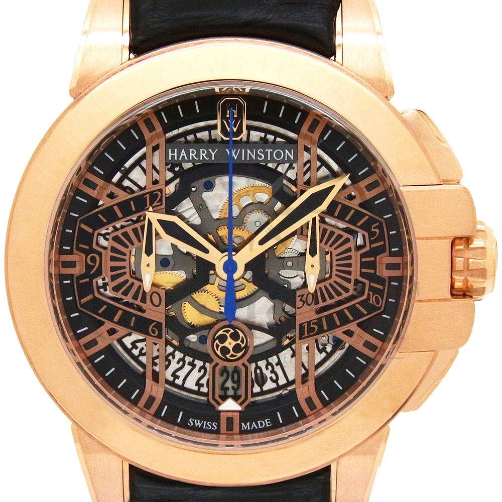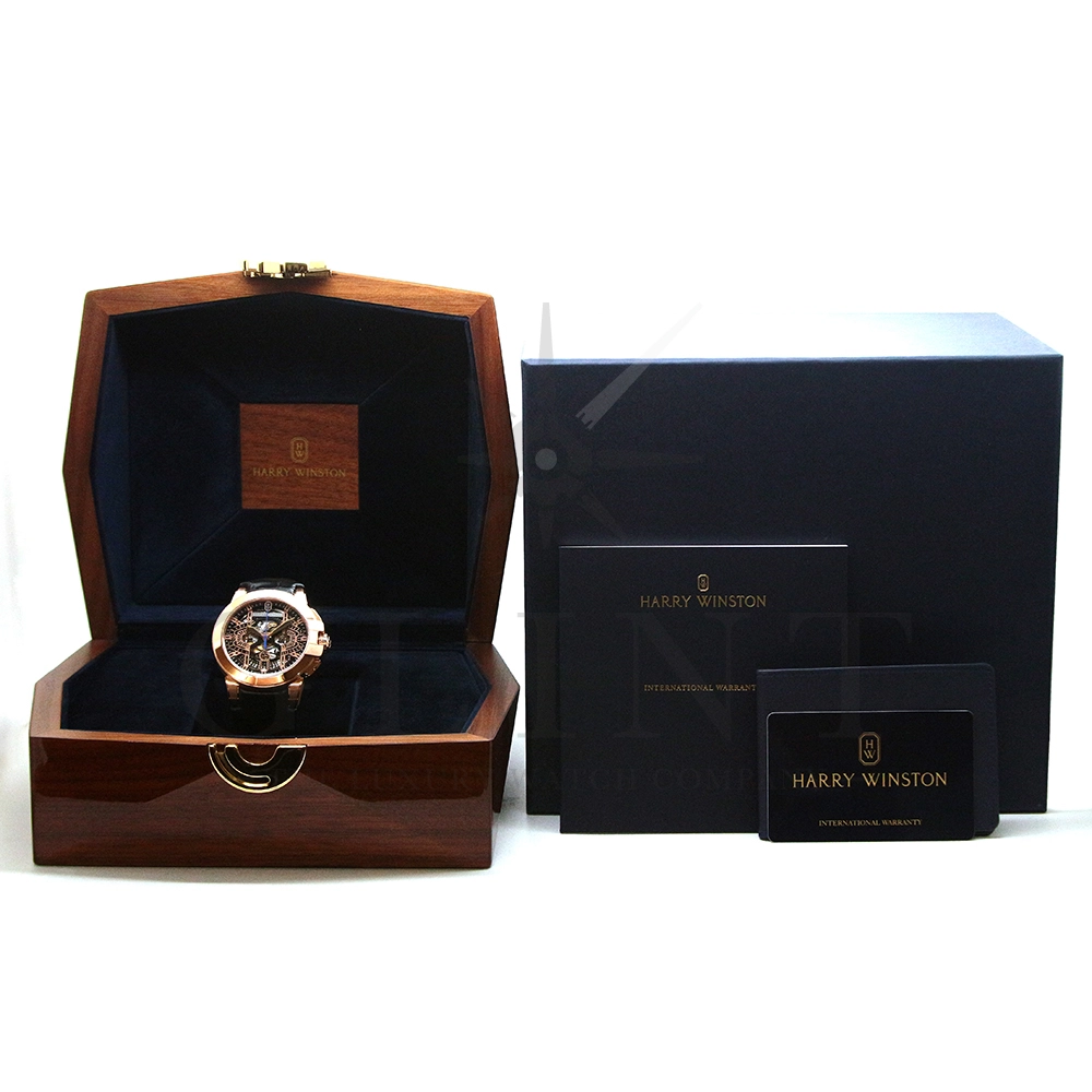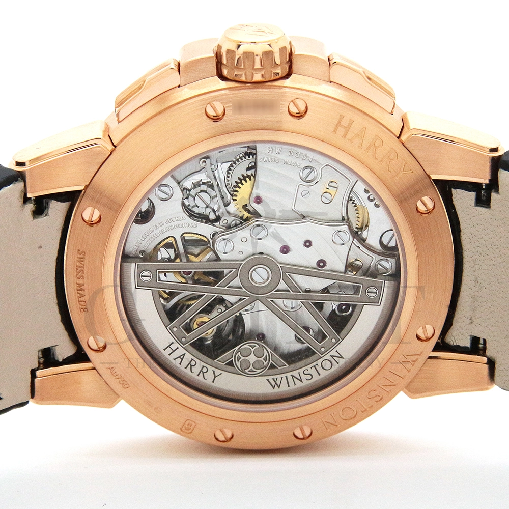 ハリー・ウィンストンが革新的な技術や素材、伝統的な時計作りの技を融合させる事で新たな個性を創造する意味を込められた限定生産シリーズ「プロジェクト Z」。こちらのモデルは「プロジェクト Z9」からレギュラー化された大胆なオープンワークが施された文字盤が特徴的で、素材にローズゴールドを使用した高級感漂うモデル。通常はクラシカルな印象が強いスケルトン加工も、本モデルはモダンな感覚が強調され、幾何学模様を彷彿とさせる仕上がりに時計の美しさを感じられます。クロノグラフの積算計や手裏剣のインジケーターなど、ムーブメントを構成する部品がかつてないインパクトで迫り、時計の魅力をより引き立ててくれるでしょう。36000振動/時(10振動/秒)の高振動ムーブメントとなる「Cal.HW3304」には、フライバック機能も搭載。ローターにはホワイトゴールドを採用し、高い比重によって迅速で確実な巻き上げを実現しており、ローターにもハリー・ウィンストン独自の幾何学的なパターンがスケルトン加工され、メカニカルな印象を際立たせてくれます。ハリー・ウィンストンらしい独創的なデザインと機能美を実現した究極の一本。腕元に添えた瞬間、たちまち時計の美しさに魅了される事は間違いありません。