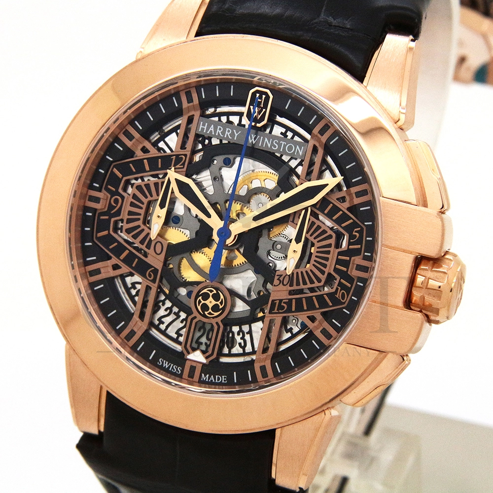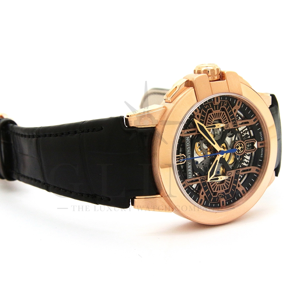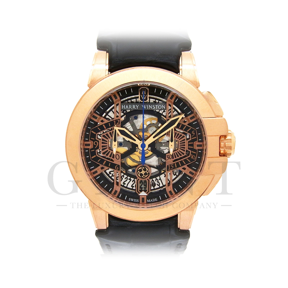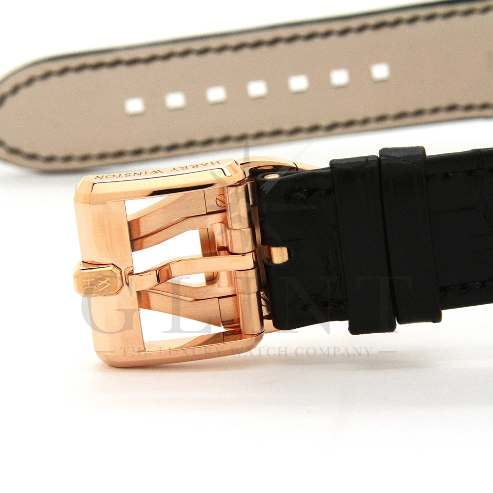 ハリー・ウィンストンが革新的な技術や素材、伝統的な時計作りの技を融合させる事で新たな個性を創造する意味を込められた限定生産シリーズ「プロジェクト Z」。こちらのモデルは「プロジェクト Z9」からレギュラー化された大胆なオープンワークが施された文字盤が特徴的で、素材にローズゴールドを使用した高級感漂うモデル。通常はクラシカルな印象が強いスケルトン加工も、本モデルはモダンな感覚が強調され、幾何学模様を彷彿とさせる仕上がりに時計の美しさを感じられます。クロノグラフの積算計や手裏剣のインジケーターなど、ムーブメントを構成する部品がかつてないインパクトで迫り、時計の魅力をより引き立ててくれるでしょう。36000振動/時(10振動/秒)の高振動ムーブメントとなる「Cal.HW3304」には、フライバック機能も搭載。ローターにはホワイトゴールドを採用し、高い比重によって迅速で確実な巻き上げを実現しており、ローターにもハリー・ウィンストン独自の幾何学的なパターンがスケルトン加工され、メカニカルな印象を際立たせてくれます。ハリー・ウィンストンらしい独創的なデザインと機能美を実現した究極の一本。腕元に添えた瞬間、たちまち時計の美しさに魅了される事は間違いありません。