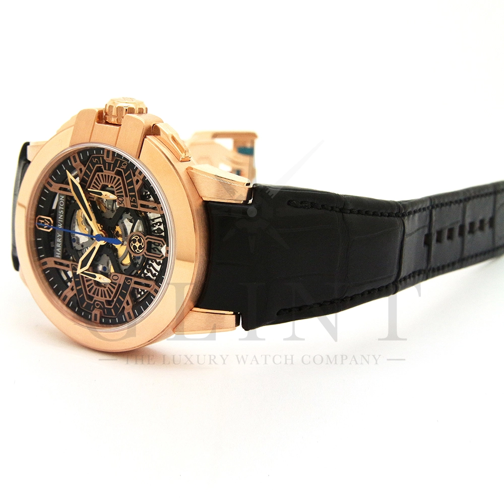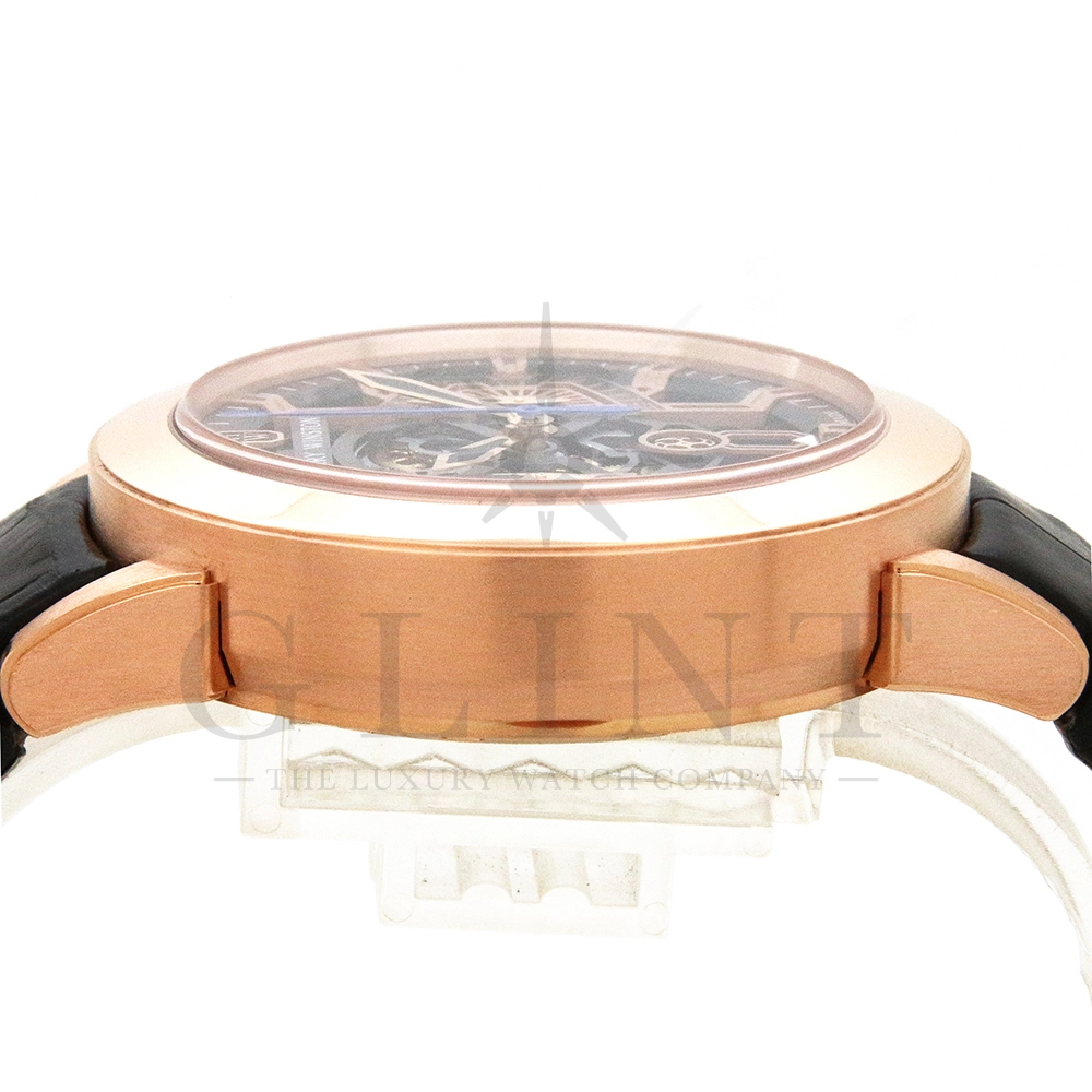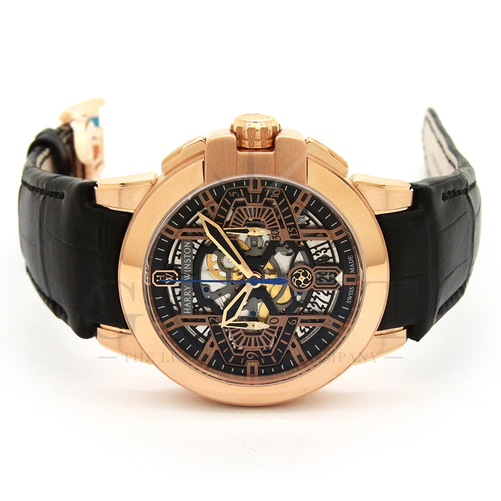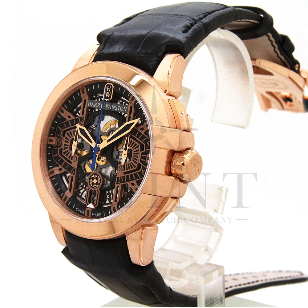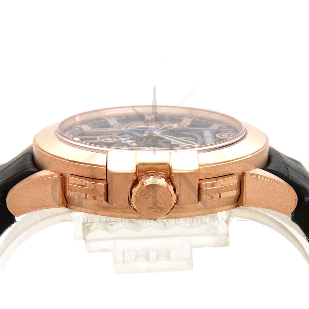 ハリー・ウィンストンが革新的な技術や素材、伝統的な時計作りの技を融合させる事で新たな個性を創造する意味を込められた限定生産シリーズ「プロジェクト Z」。こちらのモデルは「プロジェクト Z9」からレギュラー化された大胆なオープンワークが施された文字盤が特徴的で、素材にローズゴールドを使用した高級感漂うモデル。通常はクラシカルな印象が強いスケルトン加工も、本モデルはモダンな感覚が強調され、幾何学模様を彷彿とさせる仕上がりに時計の美しさを感じられます。クロノグラフの積算計や手裏剣のインジケーターなど、ムーブメントを構成する部品がかつてないインパクトで迫り、時計の魅力をより引き立ててくれるでしょう。36000振動/時(10振動/秒)の高振動ムーブメントとなる「Cal.HW3304」には、フライバック機能も搭載。ローターにはホワイトゴールドを採用し、高い比重によって迅速で確実な巻き上げを実現しており、ローターにもハリー・ウィンストン独自の幾何学的なパターンがスケルトン加工され、メカニカルな印象を際立たせてくれます。ハリー・ウィンストンらしい独創的なデザインと機能美を実現した究極の一本。腕元に添えた瞬間、たちまち時計の美しさに魅了される事は間違いありません。