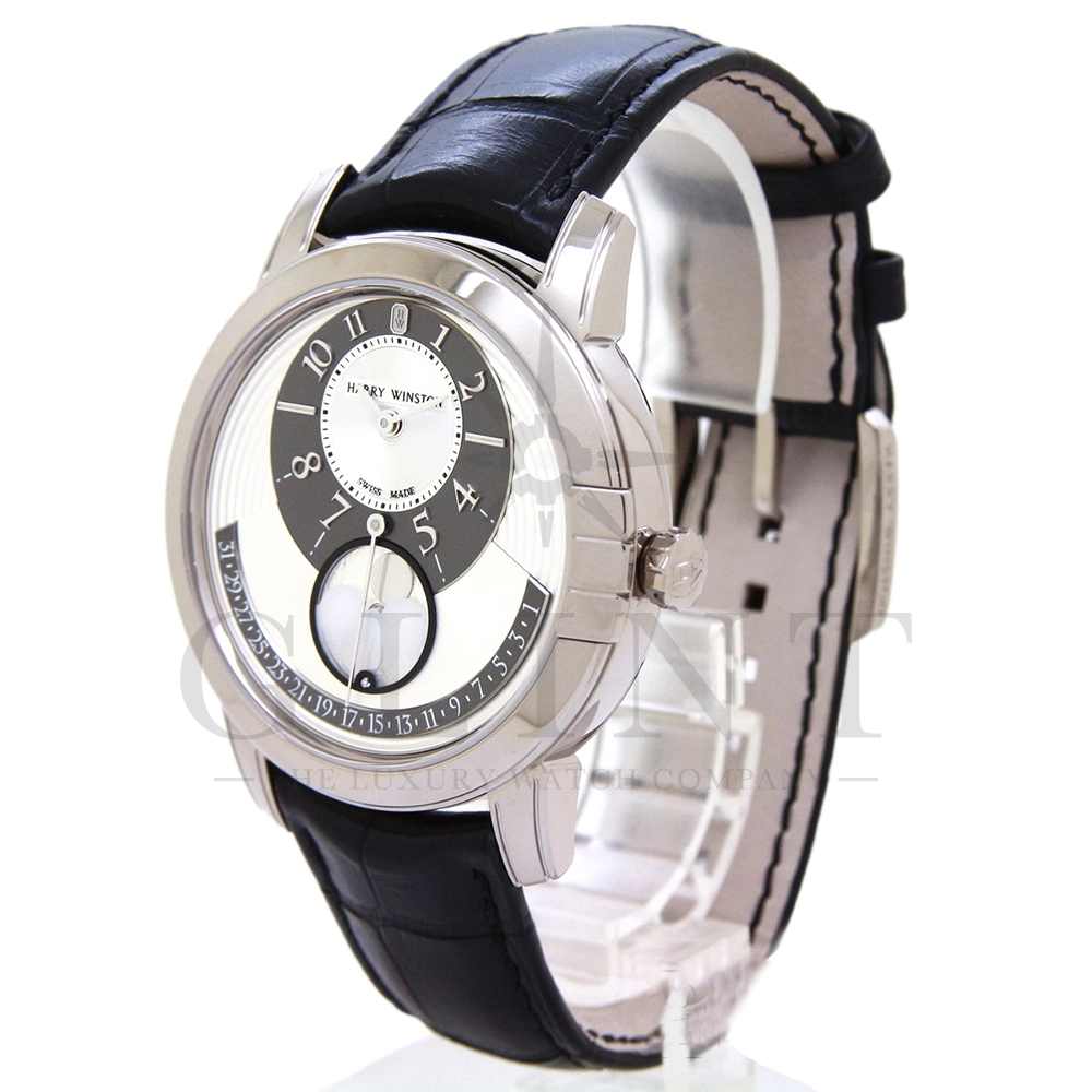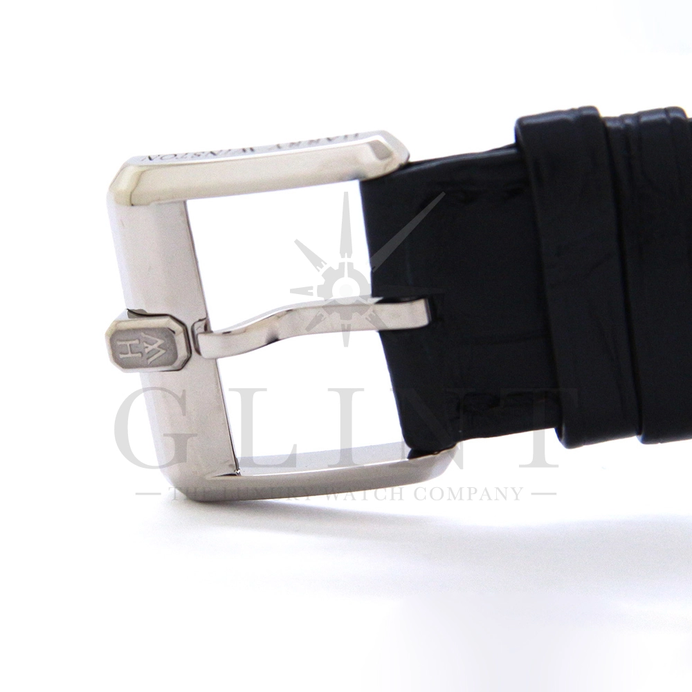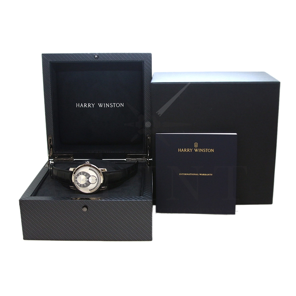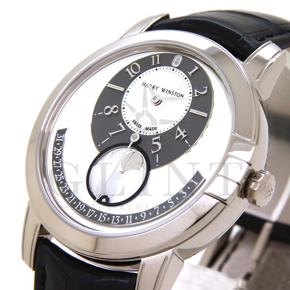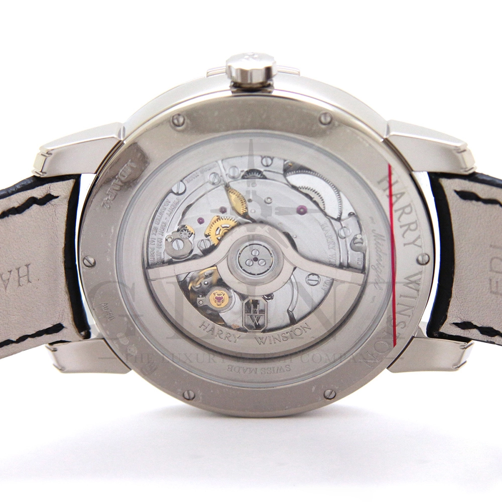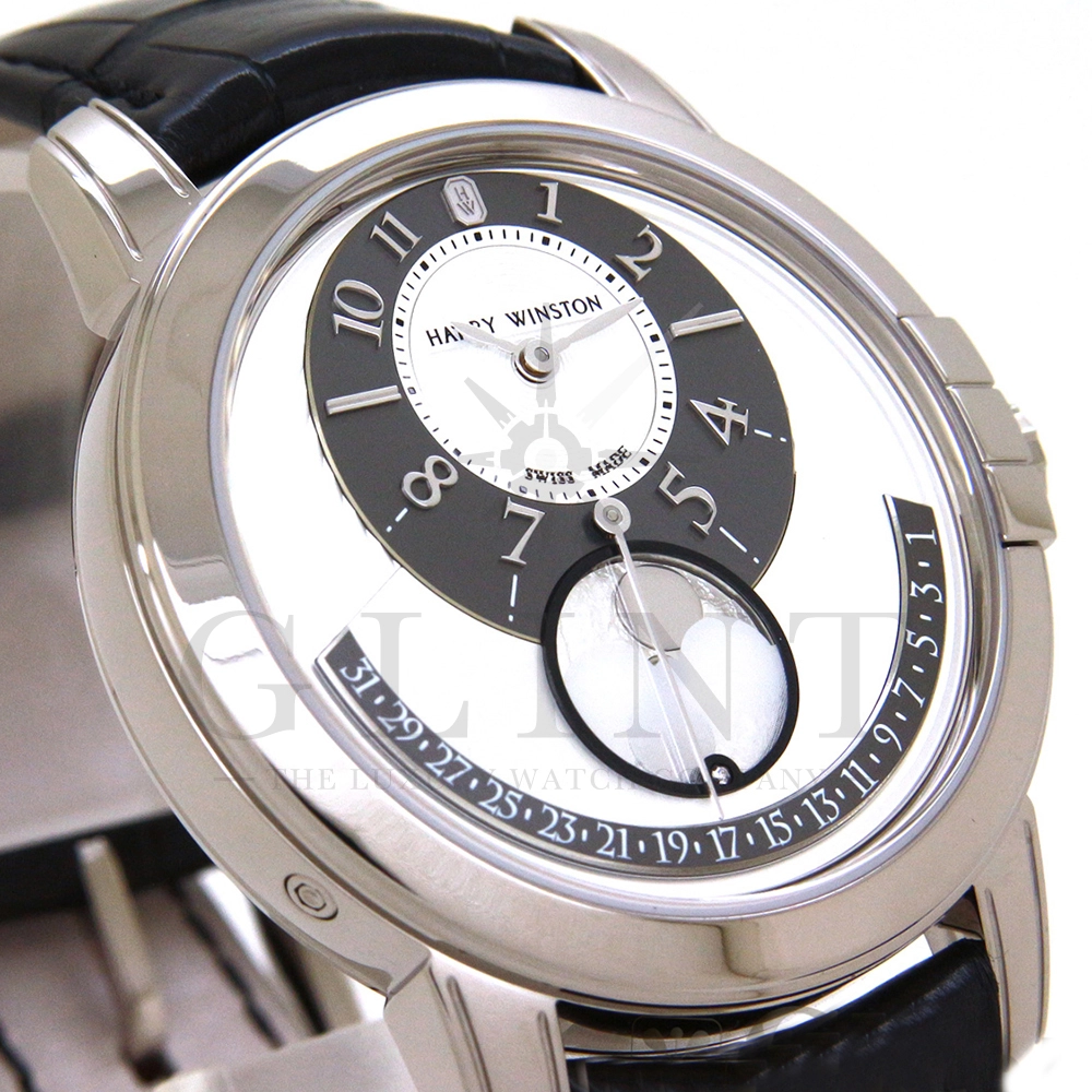 こちらはハリー・ウィンストン ミッドナイト ムーンフェイズ オートマティック 42mmです。ケース素材には洗練された高級感を与えてくれる18Kホワイトゴールドを使用。ほどよい重量感が心地よく、高級時計としてのステータス性を感じさせてくれます。オフセンターの時刻表示、レトログラード式のデイト表示となっており、ハリーウィンストンらしい独創的な雰囲気を味わえるでしょう。裏蓋はシースルーバックとなっており、ムーブメントの動きをダイレクトに眺める事ができます。落ち着いた雰囲気で上質な大人の男性にぴったりな一本です。