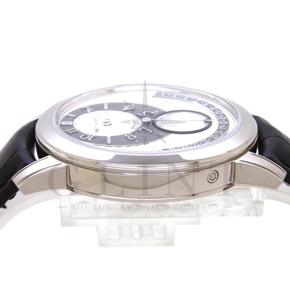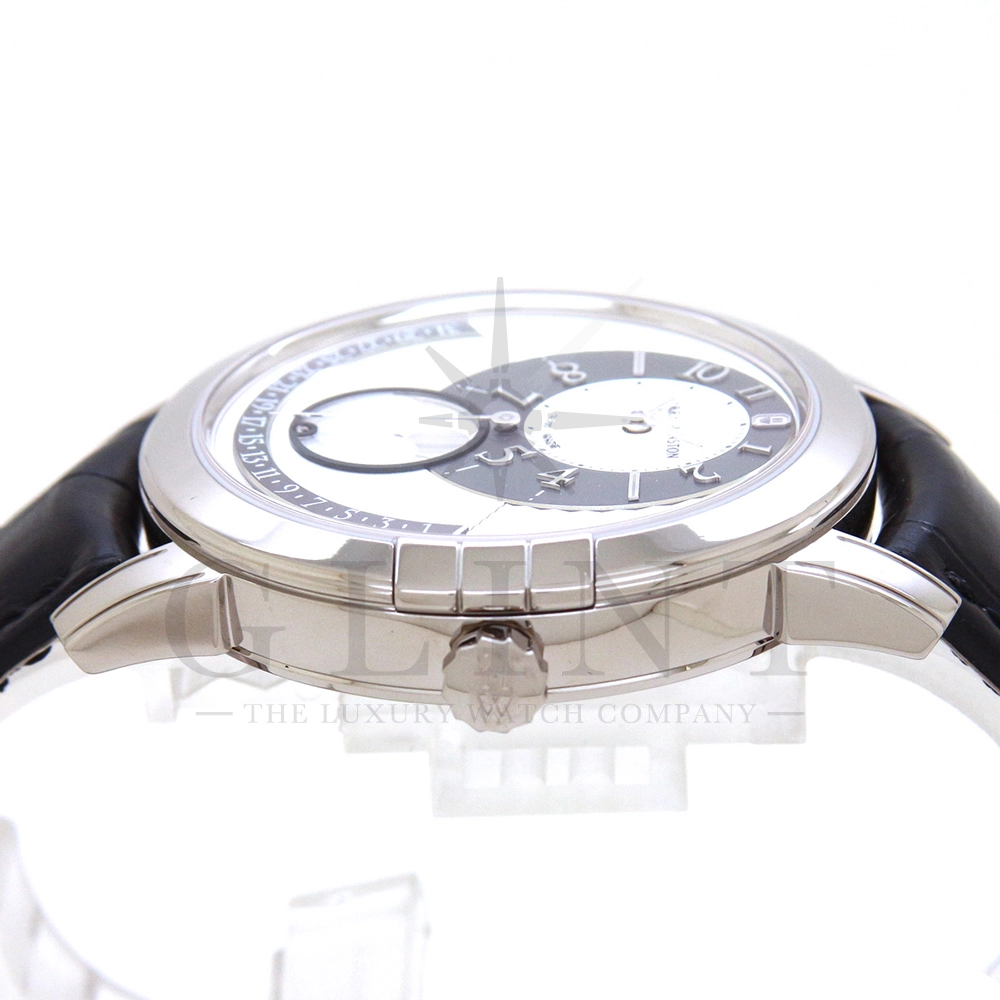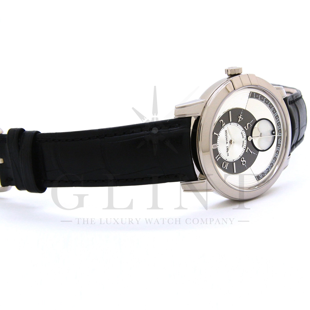 仕様:オフセンター配置の時・分表示 ムーンフェイズ レトログラード式日付カレンダー ホワイトダイヤルベースに幅広のスネイル仕上げ装飾 サンレイ・サテン仕上げスレートカラーアワーサークルと日付サークル ブラックアワーサークルのセンターに細密なスネイル仕上げ装飾 スレート風装飾ブラックムーンディスク 6時位置にラウンド・ブリリアントカット・ダイヤモンド1個