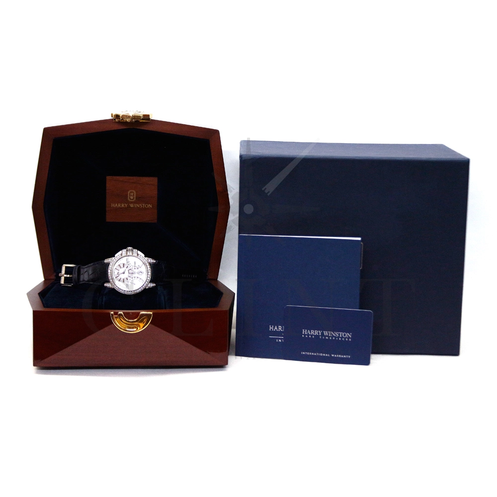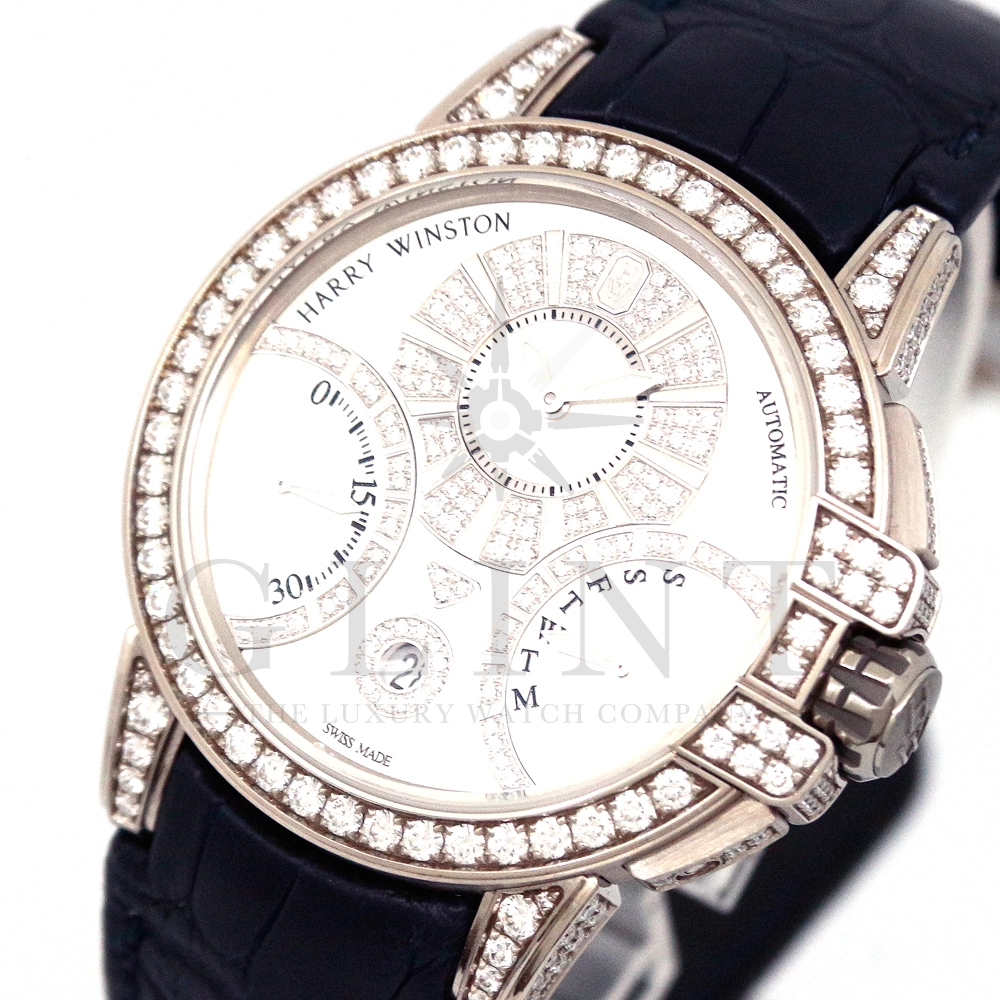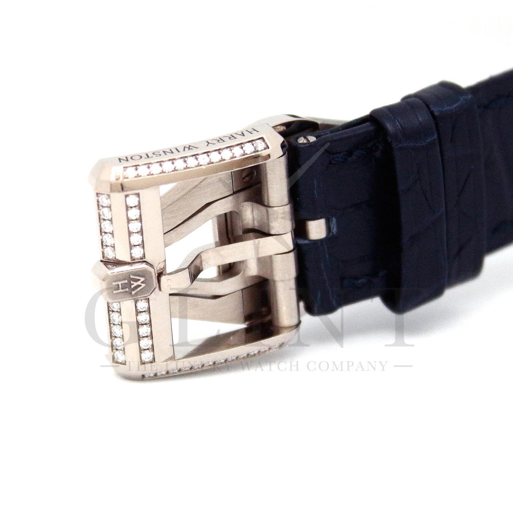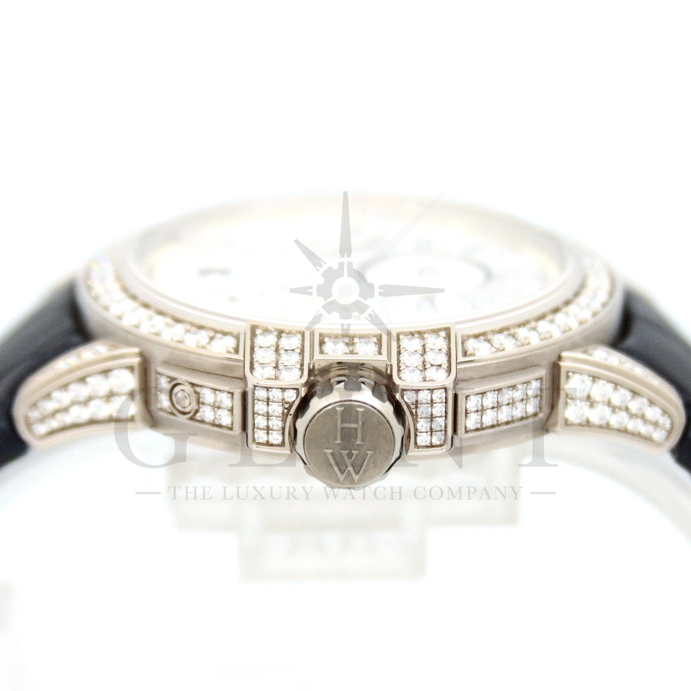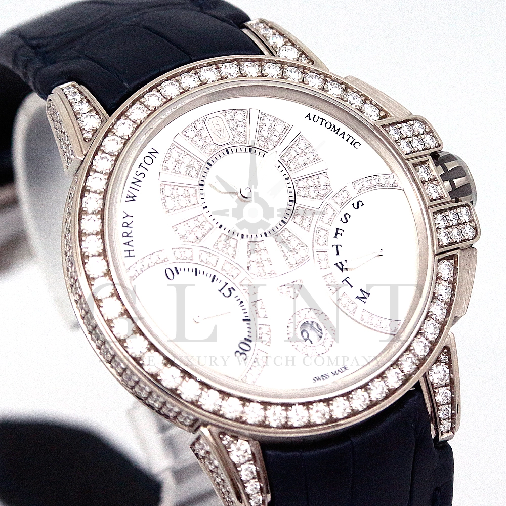 こちらはオーシャン・バイレトログラード オートマティック 42 純正ダイヤモンドモデルです。ケース素材には18Kホワイトゴールドを使用。ベゼルとケース、バックルには総計367個(約4.50カラット)のダイヤモンド、ホワイトシェルの文字盤には127個(約0.41カラット)のダイヤモンドがセッティングされており、ダイヤモンドの輝きと美しさが時計全体を華やかに演出してくれます。オフセンターで配置された時刻表示、レトログラード式の秒、曜日表示、6時位置には日付表示を装備し、実用性も抜群です。「キング・オブ・ダイヤモンド」と称され世界的に名高いハリーウィンストンらしい魅力が存分に詰まった最高峰のラグジュアリーウオッチです。