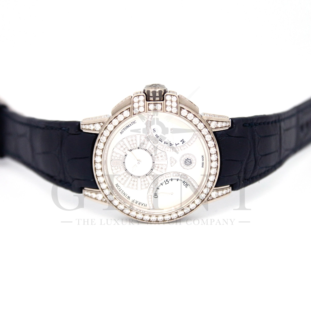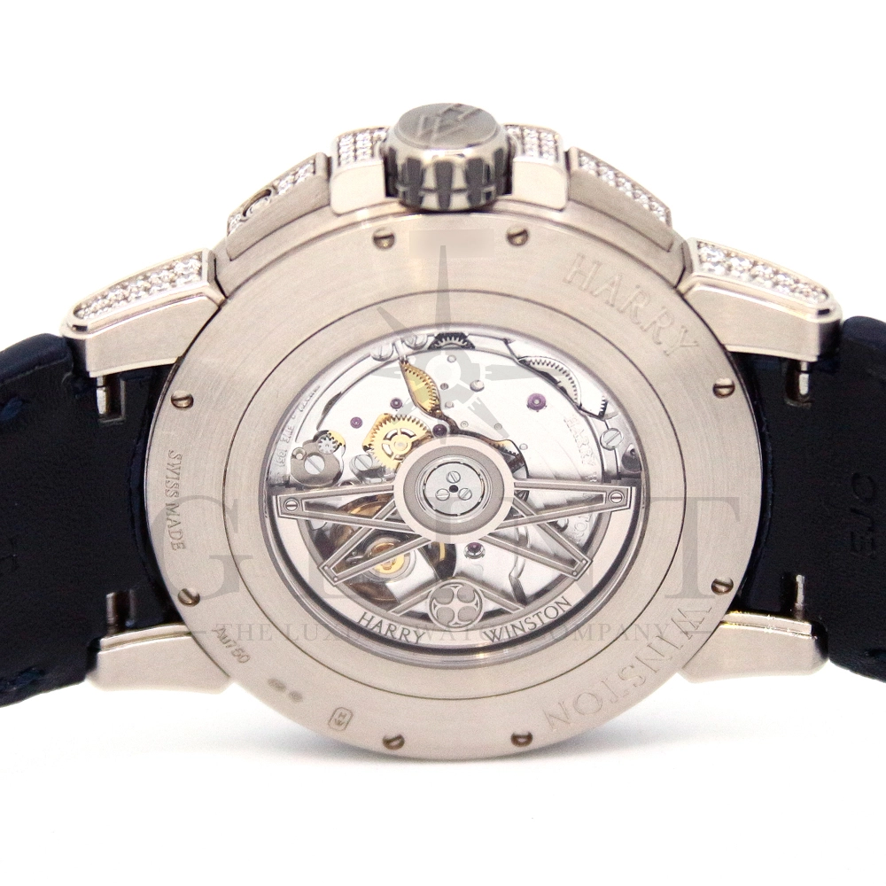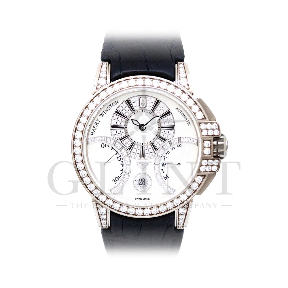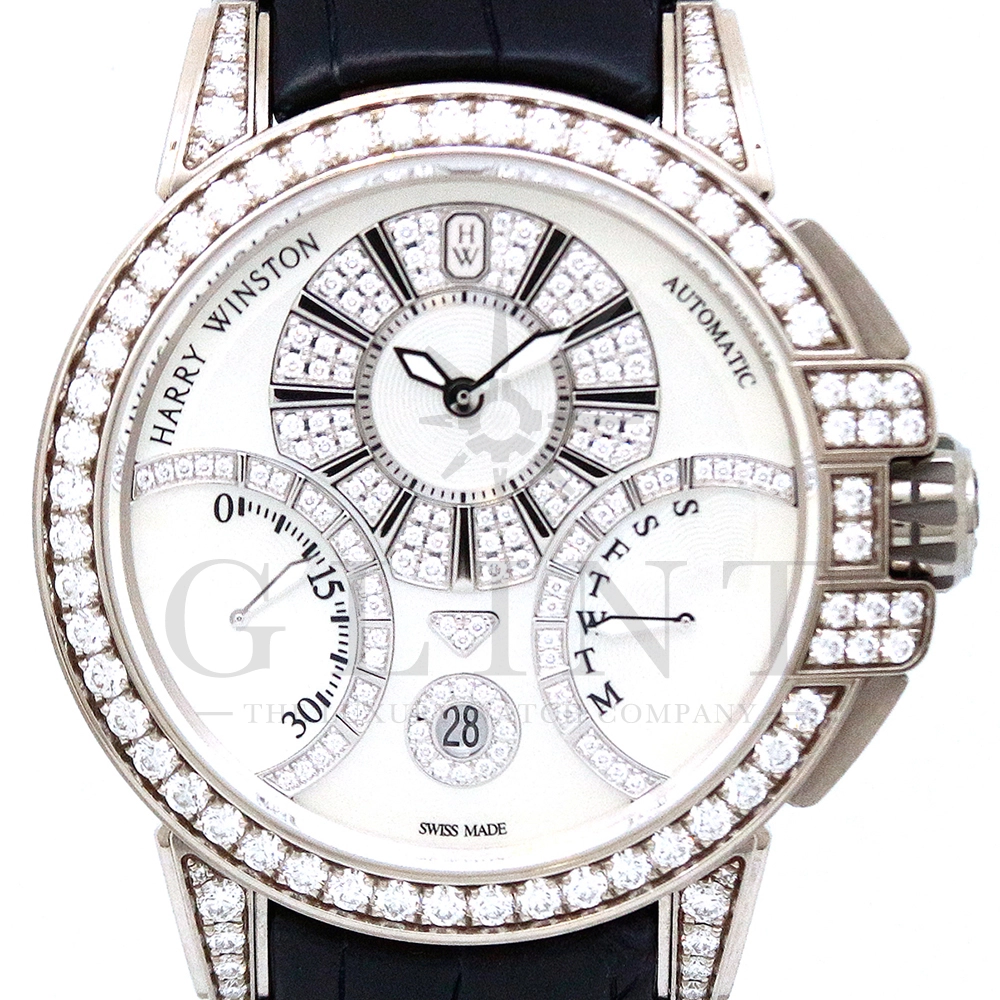 こちらはオーシャン・バイレトログラード オートマティック 42 純正ダイヤモンドモデルです。ケース素材には18Kホワイトゴールドを使用。ベゼルとケース、バックルには総計367個(約4.50カラット)のダイヤモンド、ホワイトシェルの文字盤には127個(約0.41カラット)のダイヤモンドがセッティングされており、ダイヤモンドの輝きと美しさが時計全体を華やかに演出してくれます。オフセンターで配置された時刻表示、レトログラード式の秒、曜日表示、6時位置には日付表示を装備し、実用性も抜群です。「キング・オブ・ダイヤモンド」と称され世界的に名高いハリーウィンストンらしい魅力が存分に詰まった最高峰のラグジュアリーウオッチです。
