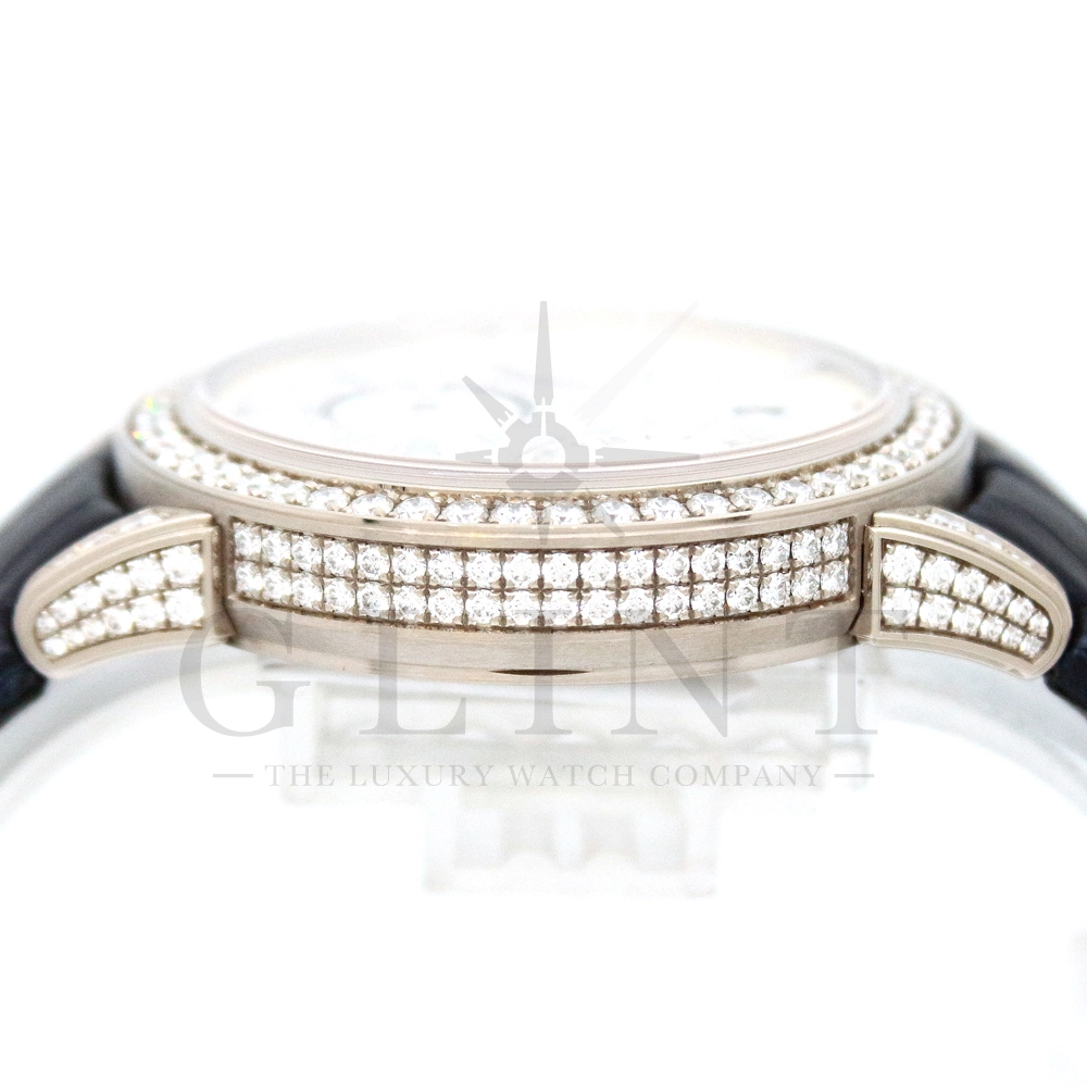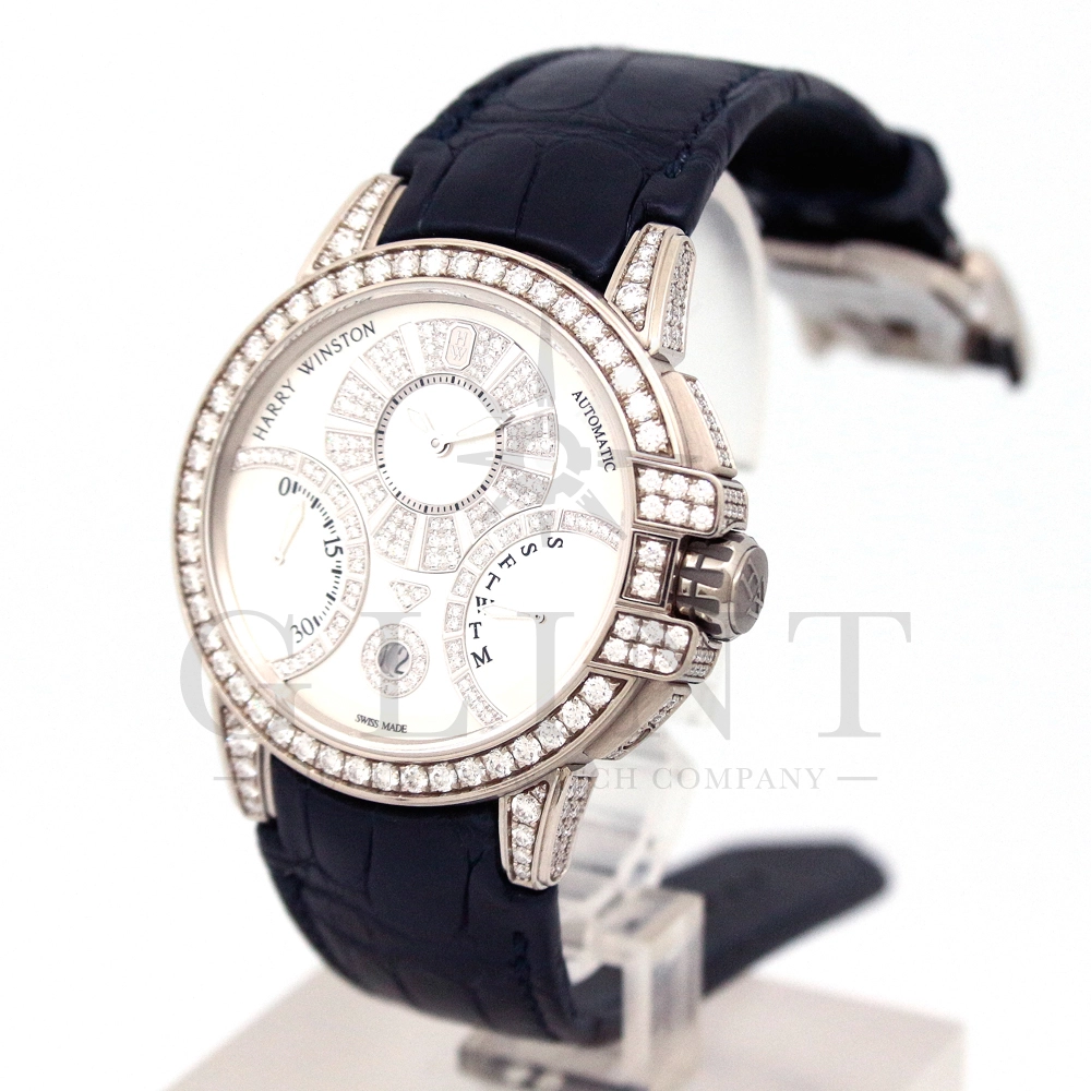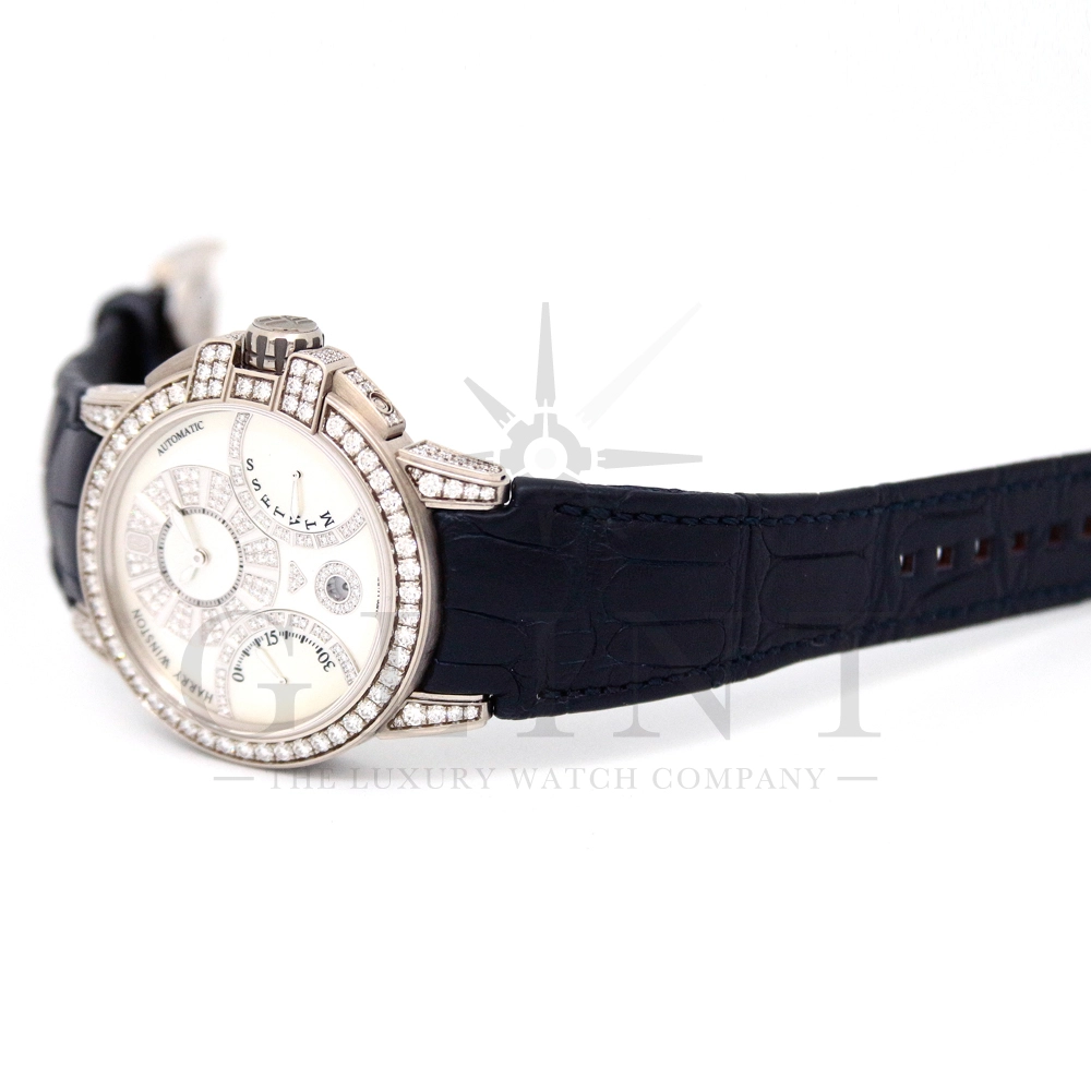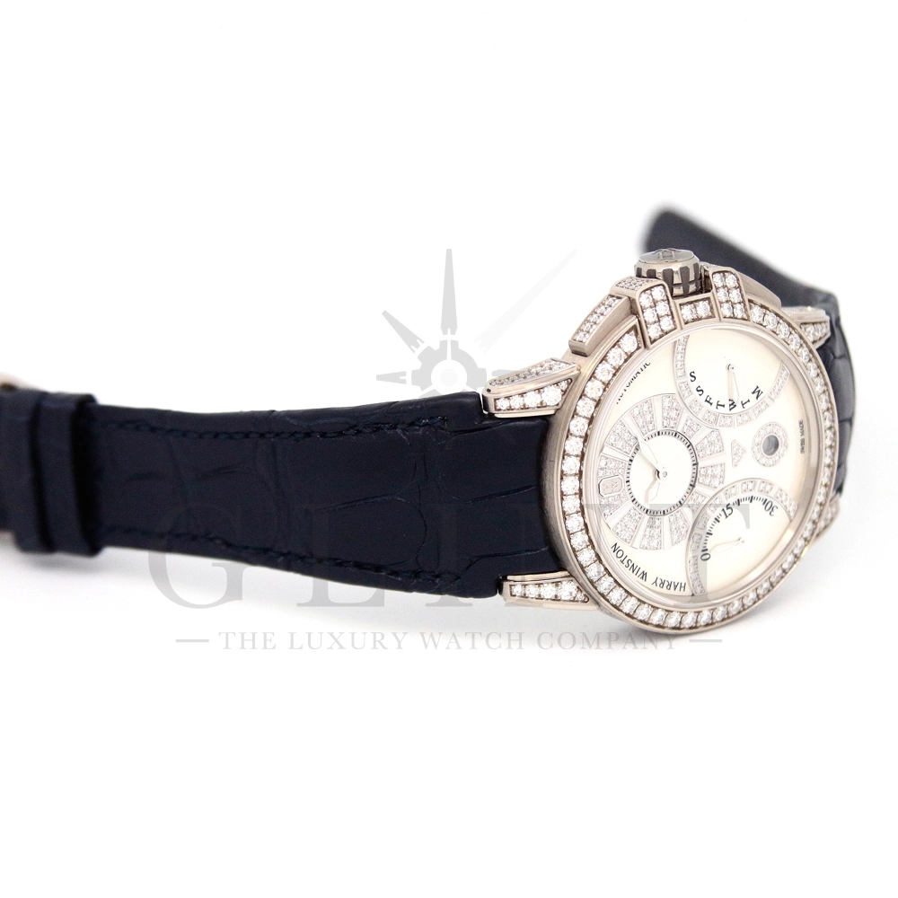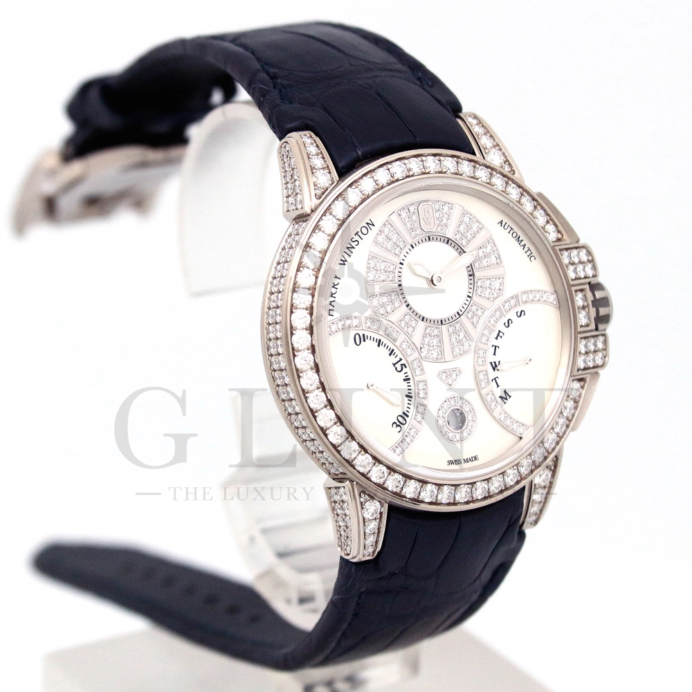 こちらはオーシャン・バイレトログラード オートマティック 42 純正ダイヤモンドモデルです。ケース素材には18Kホワイトゴールドを使用。ベゼルとケース、バックルには総計367個(約4.50カラット)のダイヤモンド、ホワイトシェルの文字盤には127個(約0.41カラット)のダイヤモンドがセッティングされており、ダイヤモンドの輝きと美しさが時計全体を華やかに演出してくれます。オフセンターで配置された時刻表示、レトログラード式の秒、曜日表示、6時位置には日付表示を装備し、実用性も抜群です。「キング・オブ・ダイヤモンド」と称され世界的に名高いハリーウィンストンらしい魅力が存分に詰まった最高峰のラグジュアリーウオッチです。