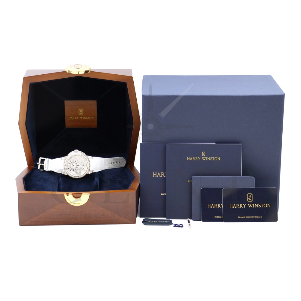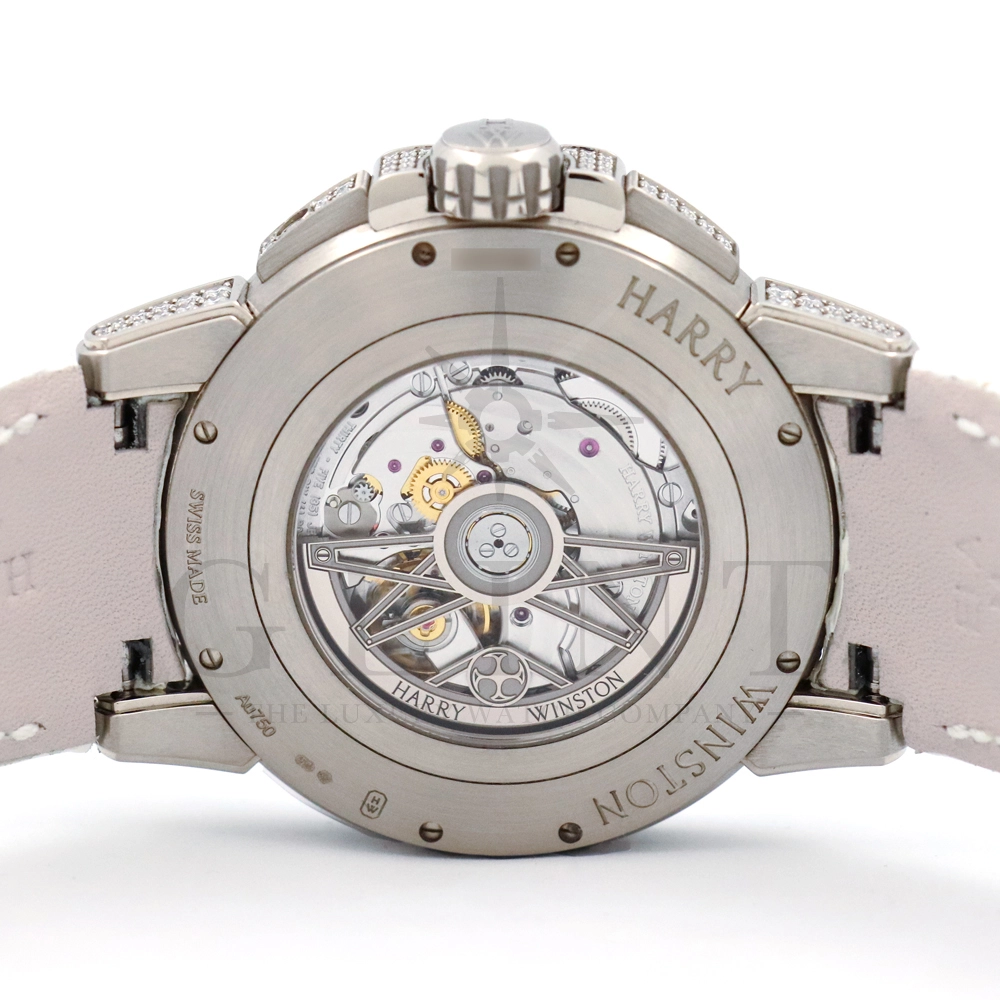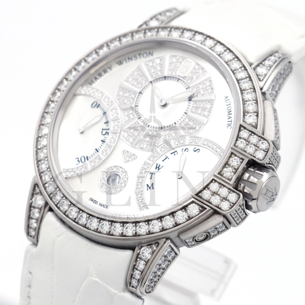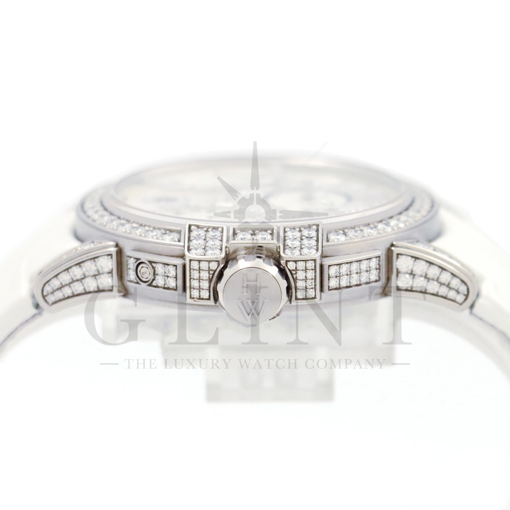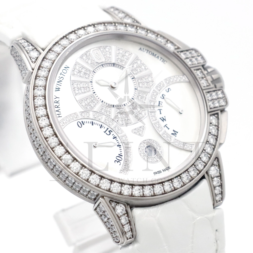 こちらはオーシャン・バイレトログラード オートマティック 42 純正ダイヤモンドモデルです。ケース素材には18Kホワイトゴールドを使用。ベゼルとケース、バックルには総計367個(約4.50カラット)のダイヤモンド、ホワイトシェルの文字盤には127個(約0.41カラット)のダイヤモンドがセッティングされており、ダイヤモンドの輝きと美しさが時計全体を華やかに演出してくれます。オフセンターで配置された時刻表示、レトログラード式の秒、曜日表示、6時位置には日付表示を装備し、実用性も抜群です。「キング・オブ・ダイヤモンド」と称され世界的に名高いハリーウィンストンらしい魅力が存分に詰まった最高峰のラグジュアリーウオッチです。
