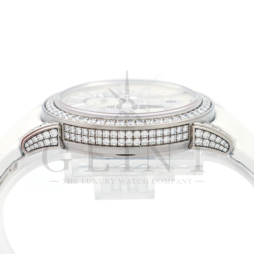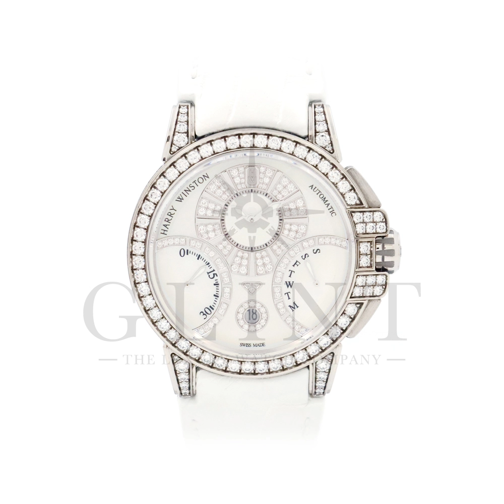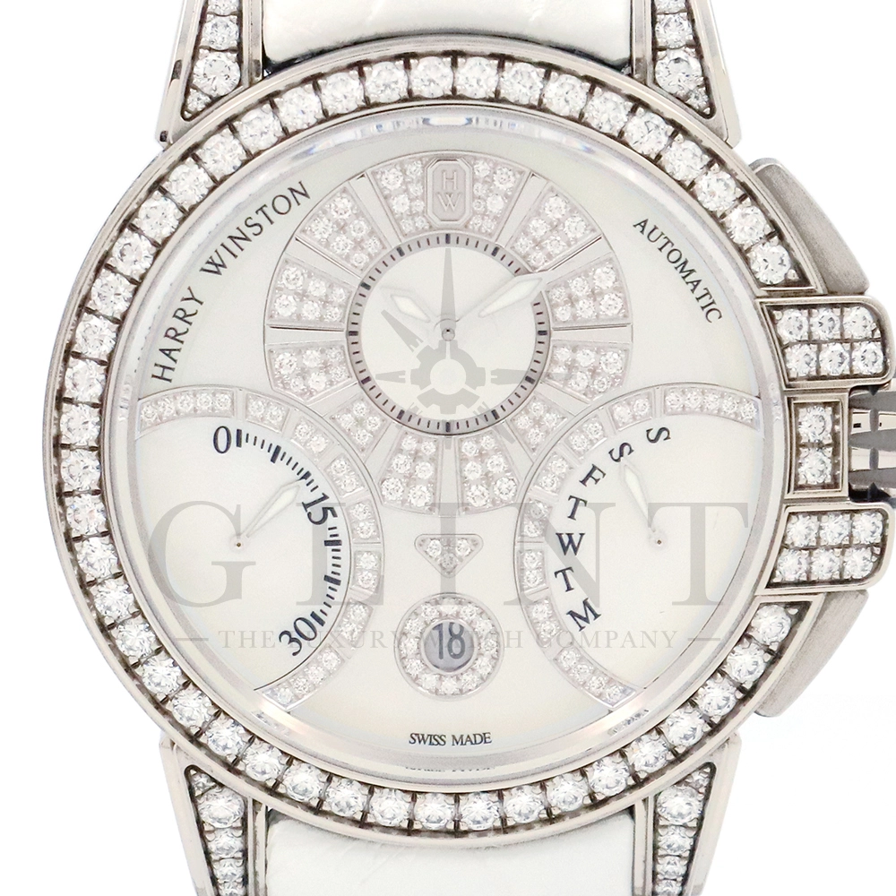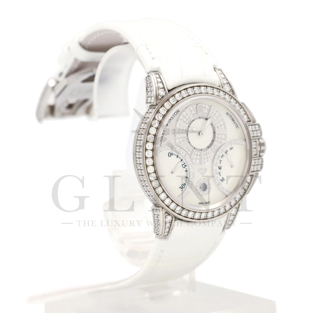 こちらはオーシャン・バイレトログラード オートマティック 42 純正ダイヤモンドモデルです。ケース素材には18Kホワイトゴールドを使用。ベゼルとケース、バックルには総計367個(約4.50カラット)のダイヤモンド、ホワイトシェルの文字盤には127個(約0.41カラット)のダイヤモンドがセッティングされており、ダイヤモンドの輝きと美しさが時計全体を華やかに演出してくれます。オフセンターで配置された時刻表示、レトログラード式の秒、曜日表示、6時位置には日付表示を装備し、実用性も抜群です。「キング・オブ・ダイヤモンド」と称され世界的に名高いハリーウィンストンらしい魅力が存分に詰まった最高峰のラグジュアリーウオッチです。