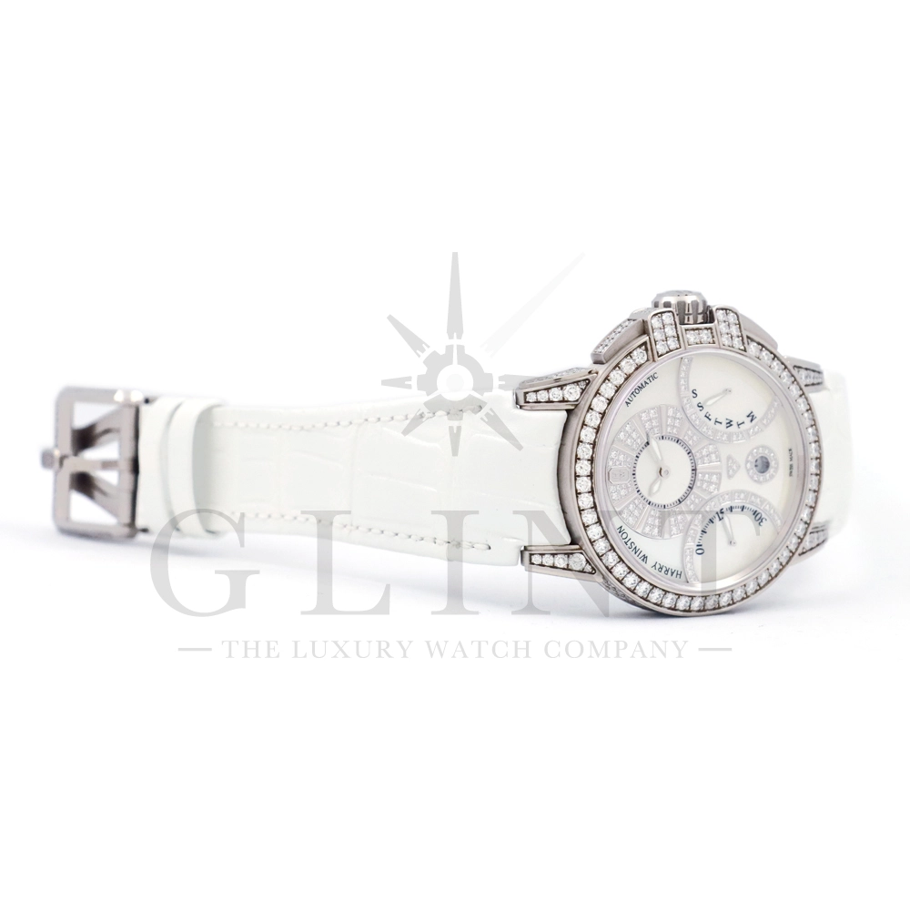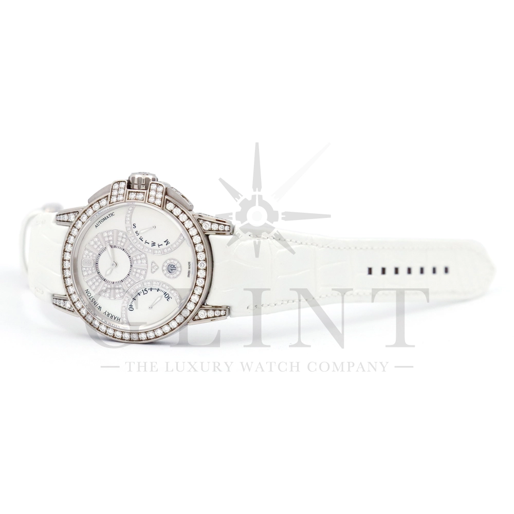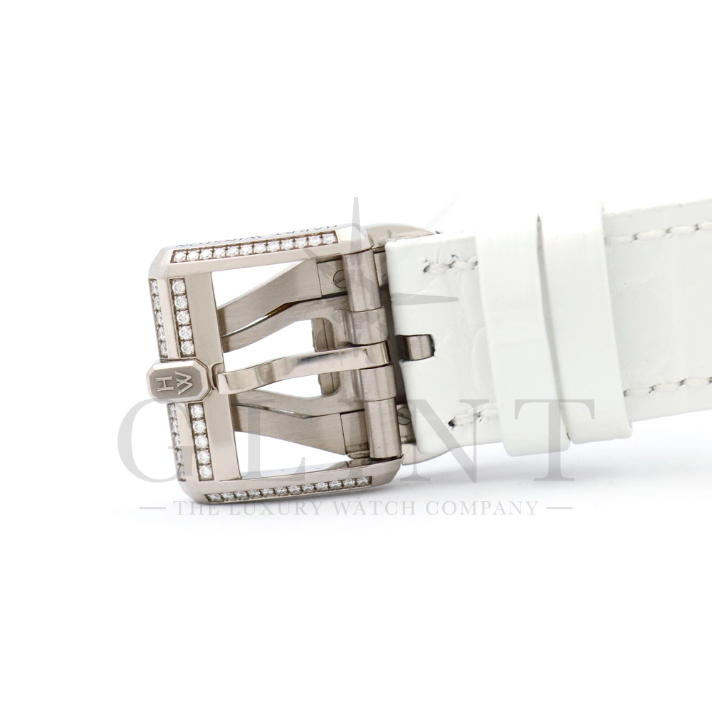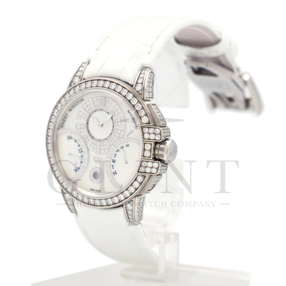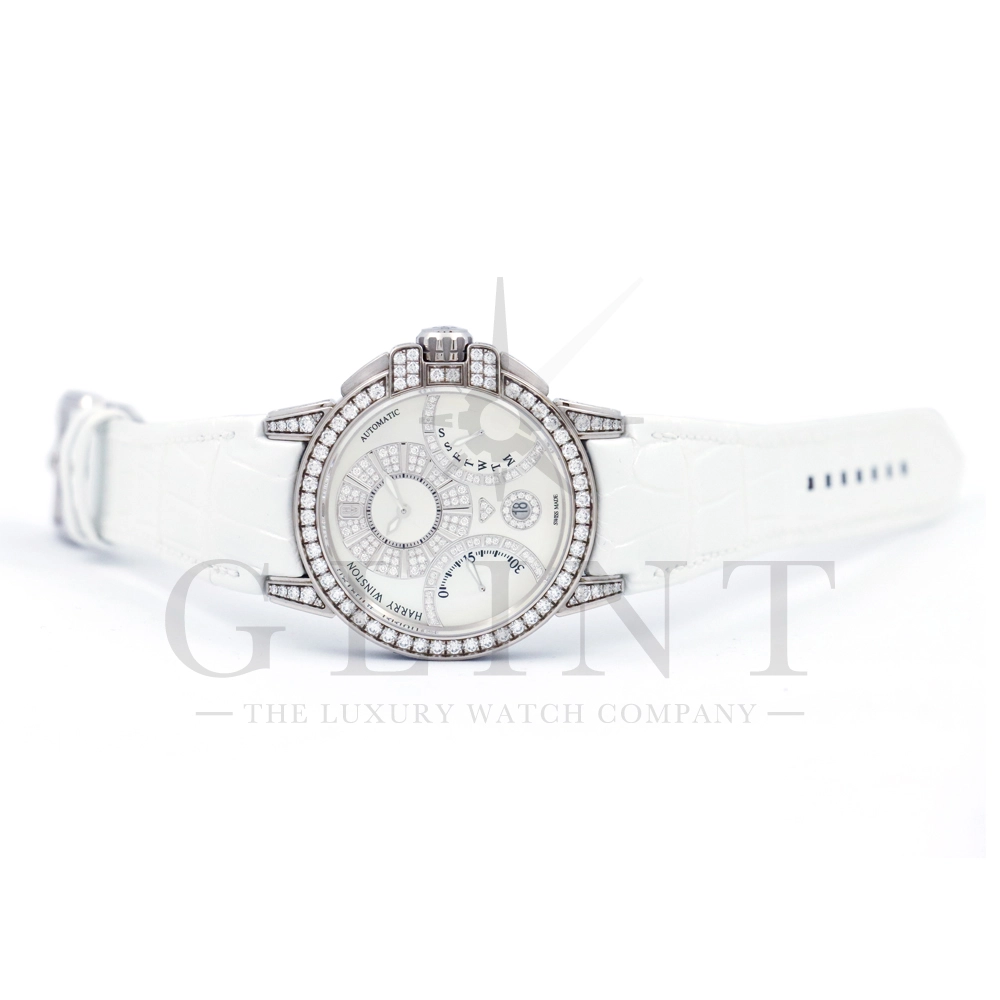 こちらはオーシャン・バイレトログラード オートマティック 42 純正ダイヤモンドモデルです。ケース素材には18Kホワイトゴールドを使用。ベゼルとケース、バックルには総計367個(約4.50カラット)のダイヤモンド、ホワイトシェルの文字盤には127個(約0.41カラット)のダイヤモンドがセッティングされており、ダイヤモンドの輝きと美しさが時計全体を華やかに演出してくれます。オフセンターで配置された時刻表示、レトログラード式の秒、曜日表示、6時位置には日付表示を装備し、実用性も抜群です。「キング・オブ・ダイヤモンド」と称され世界的に名高いハリーウィンストンらしい魅力が存分に詰まった最高峰のラグジュアリーウオッチです。