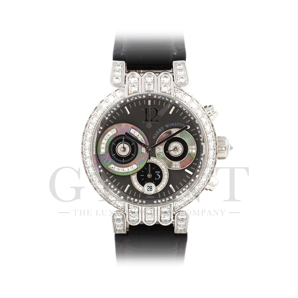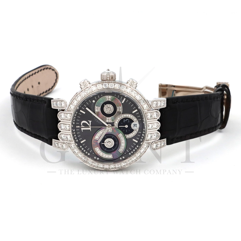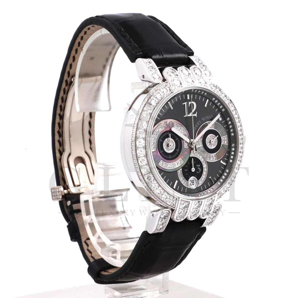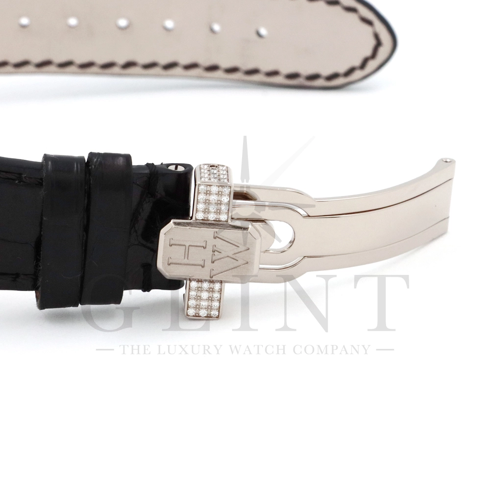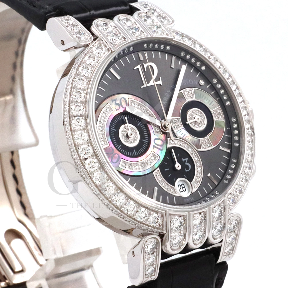 こちらはハリー・ウィンストン プルミエール クロノグラフです。39mmのケースには18Kホワイトゴールドを使用。ケースとラグ部分にはラウンドブリリアントカットされたハリー・ウィンストン純正ダイヤモンドがセッティングされており、優雅な雰囲気を堪能できます。グレー文字盤のインダイヤルにもダイヤモンドがセッティングされており、ハリー・ウィンストンらしい独創的なデザインで時計の美しさをひと際引き立ててくれるでしょう。そしてケースと同じく18Kホワイトゴールドのバックルやリューズにもダイヤモンドがセッティング。正にラグジュアリーを体現した極上の一本です。