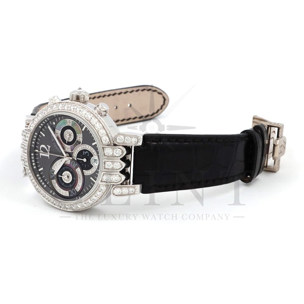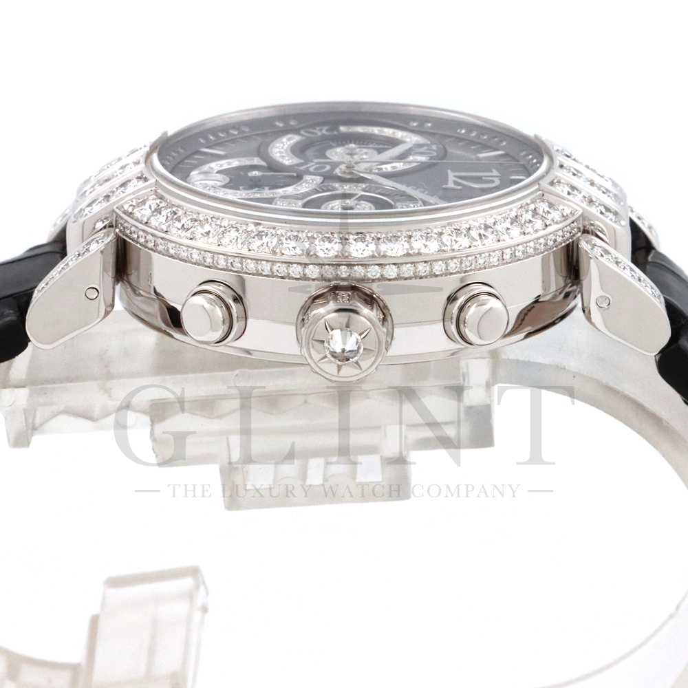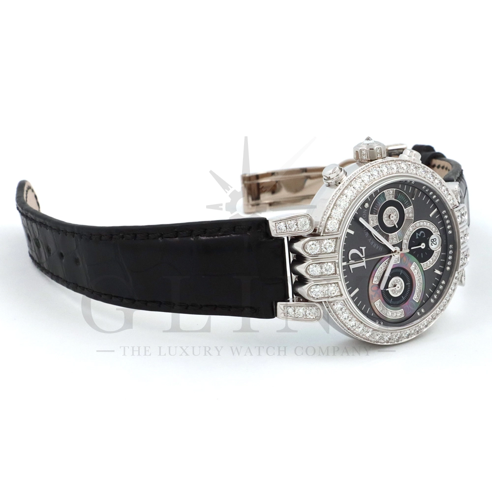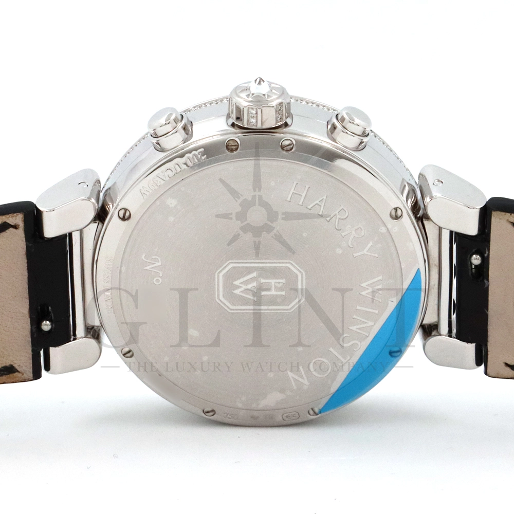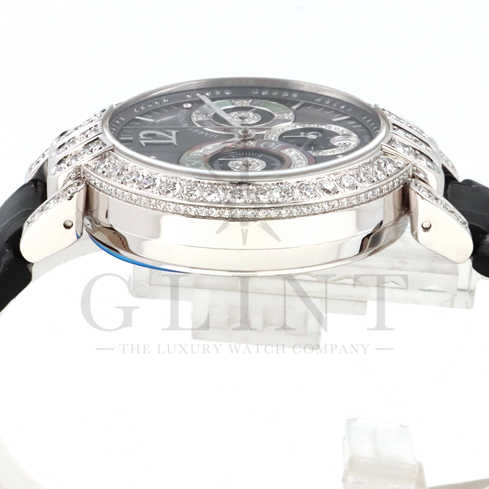 こちらはハリー・ウィンストン プルミエール クロノグラフです。39mmのケースには18Kホワイトゴールドを使用。ケースとラグ部分にはラウンドブリリアントカットされたハリー・ウィンストン純正ダイヤモンドがセッティングされており、優雅な雰囲気を堪能できます。グレー文字盤のインダイヤルにもダイヤモンドがセッティングされており、ハリー・ウィンストンらしい独創的なデザインで時計の美しさをひと際引き立ててくれるでしょう。そしてケースと同じく18Kホワイトゴールドのバックルやリューズにもダイヤモンドがセッティング。正にラグジュアリーを体現した極上の一本です。
