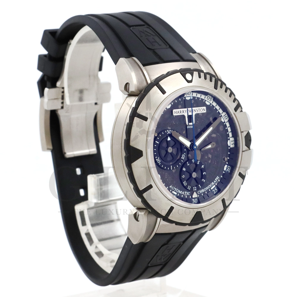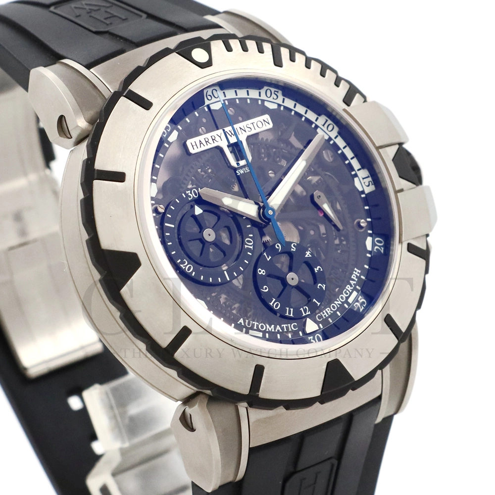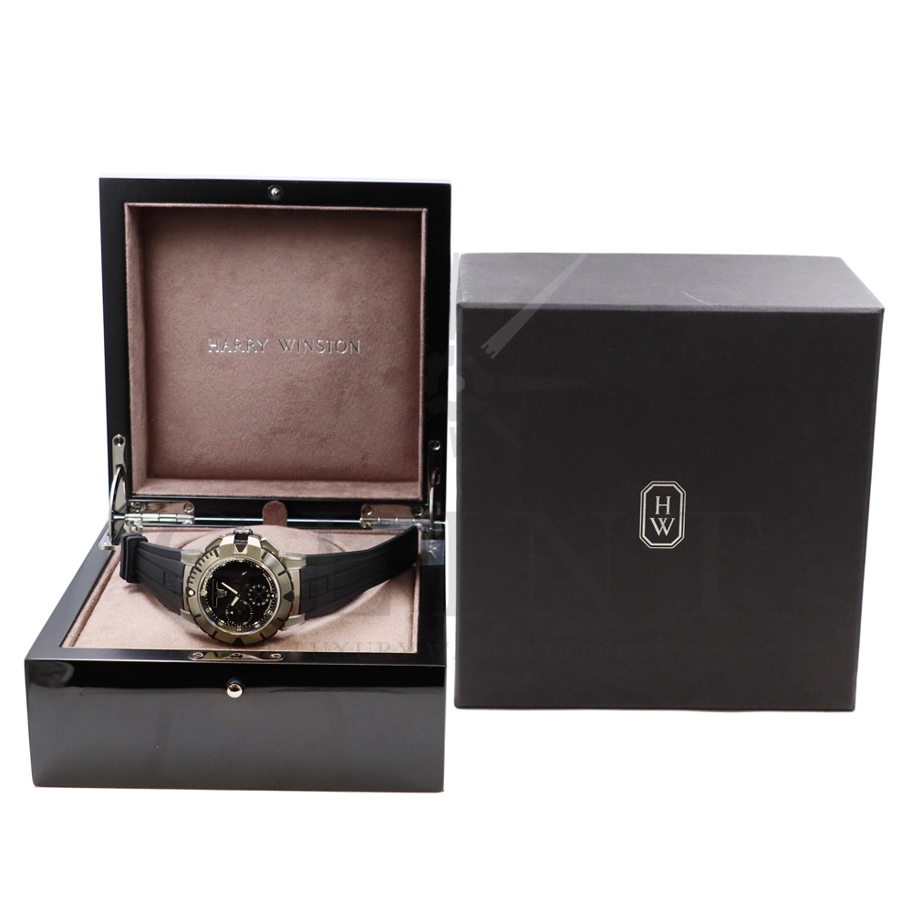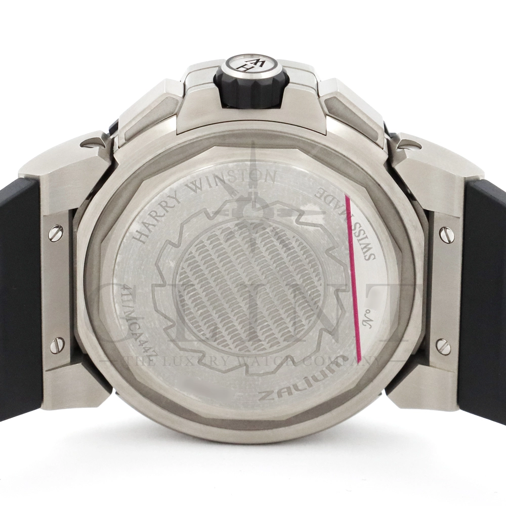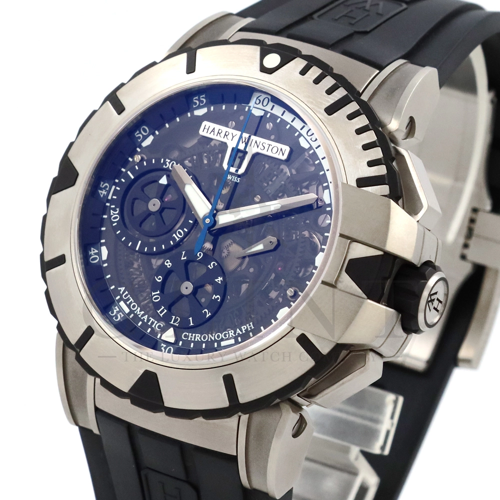 こちらはハリー・ウィンストン オーシャン スポーツ・クロノグラフです。素材にはハリー・ウィンストンが独自に開発したチタンより軽くて硬く、優れた耐アレルギー性と耐腐食性を持つジルコニウムが主成分のハイテク合金ザリウムを使用。見た目の印象とは違い、非常に軽くて、普段使いに最適です。スケルトナイズされた文字盤からは日付ディスクの動きやムーブメントの動きが眺められ、時計本来の魅力も存分に堪能する事が出来ます。ザリウム製の回転ベゼルにはDLC加工が施されており、ベゼルの耐久性を高めてくれるだけでは無く、よりスポーティで格好良い雰囲気を演出してくれるでしょう。200M防水にクロノグラフ、日付機能も備わった実用性が高い一本です。