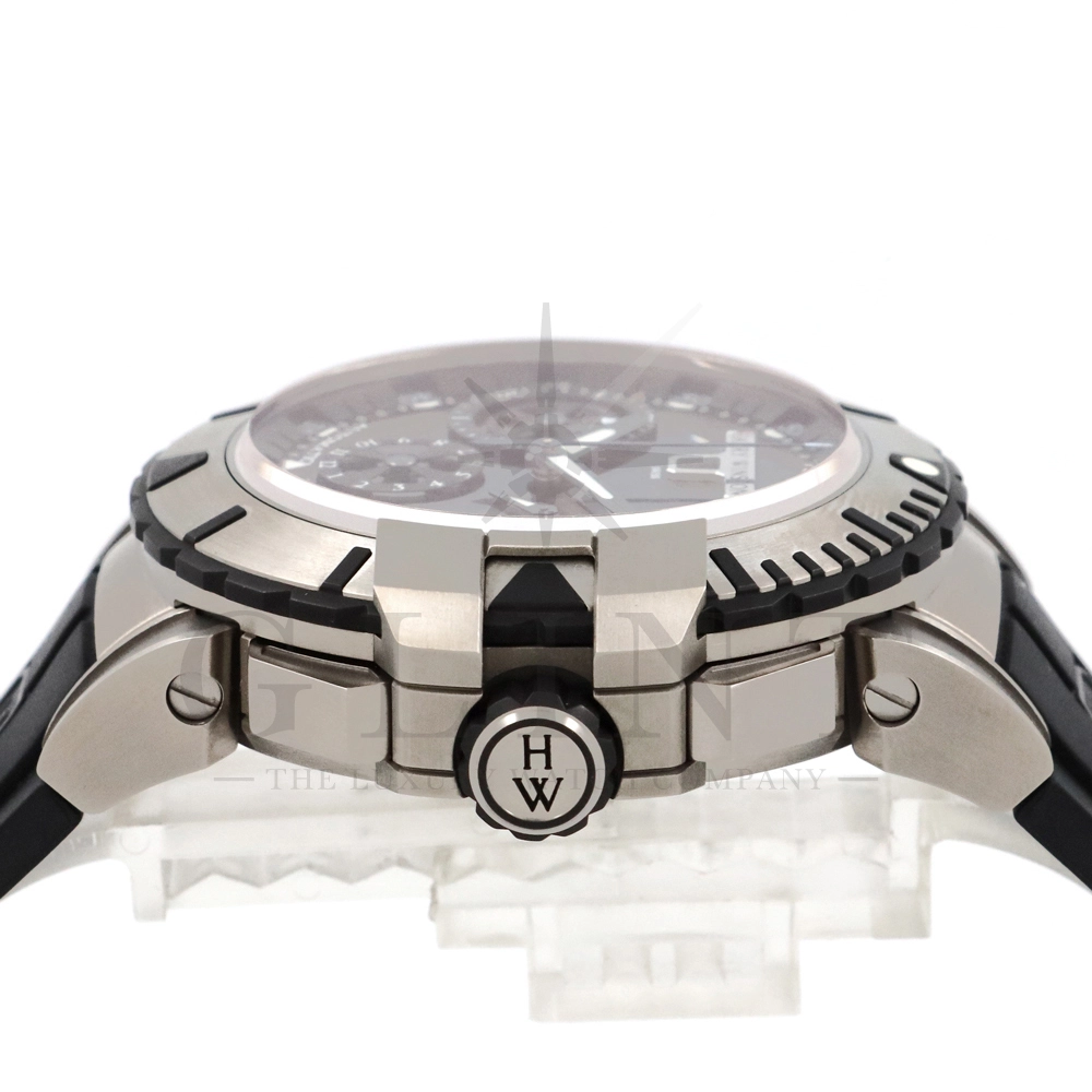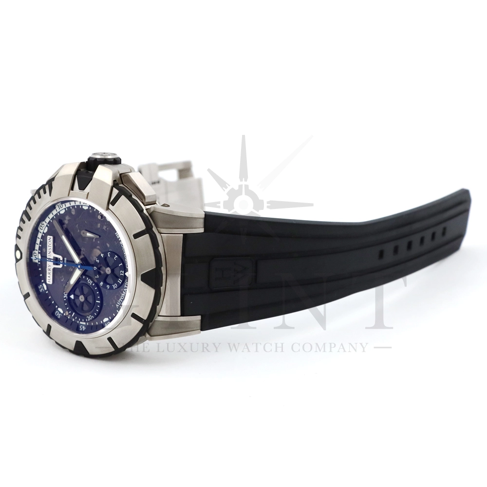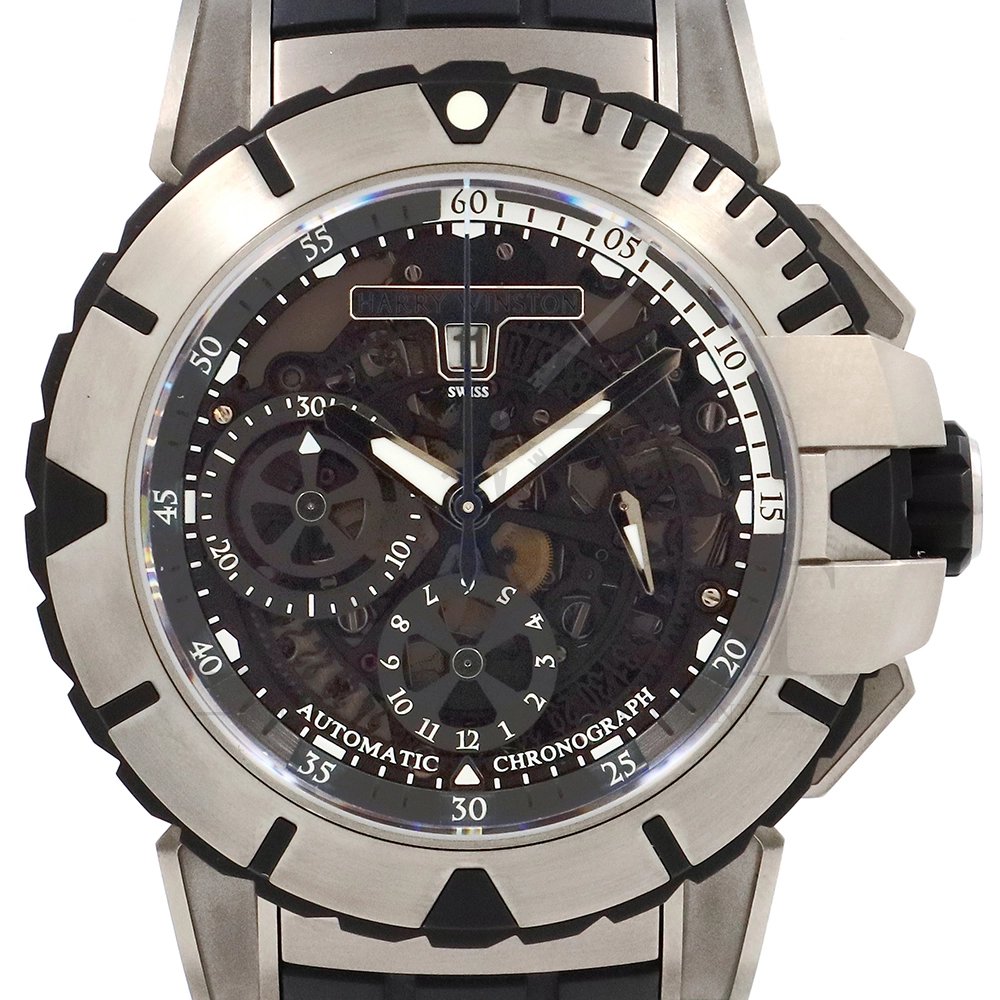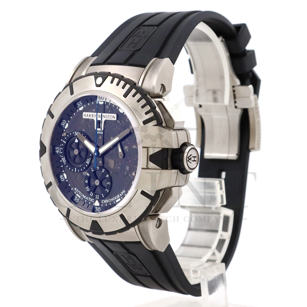 こちらはハリー・ウィンストン オーシャン スポーツ・クロノグラフです。素材にはハリー・ウィンストンが独自に開発したチタンより軽くて硬く、優れた耐アレルギー性と耐腐食性を持つジルコニウムが主成分のハイテク合金ザリウムを使用。見た目の印象とは違い、非常に軽くて、普段使いに最適です。スケルトナイズされた文字盤からは日付ディスクの動きやムーブメントの動きが眺められ、時計本来の魅力も存分に堪能する事が出来ます。ザリウム製の回転ベゼルにはDLC加工が施されており、ベゼルの耐久性を高めてくれるだけでは無く、よりスポーティで格好良い雰囲気を演出してくれるでしょう。200M防水にクロノグラフ、日付機能も備わった実用性が高い一本です。