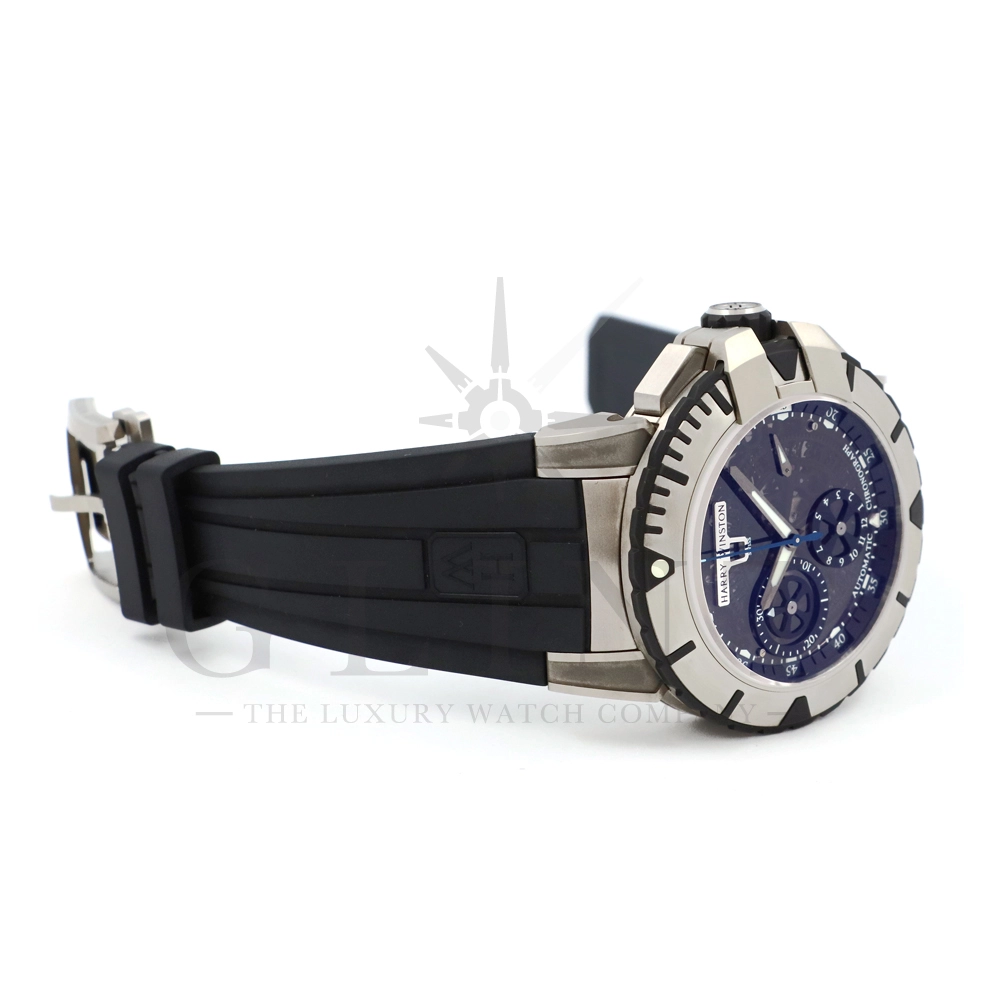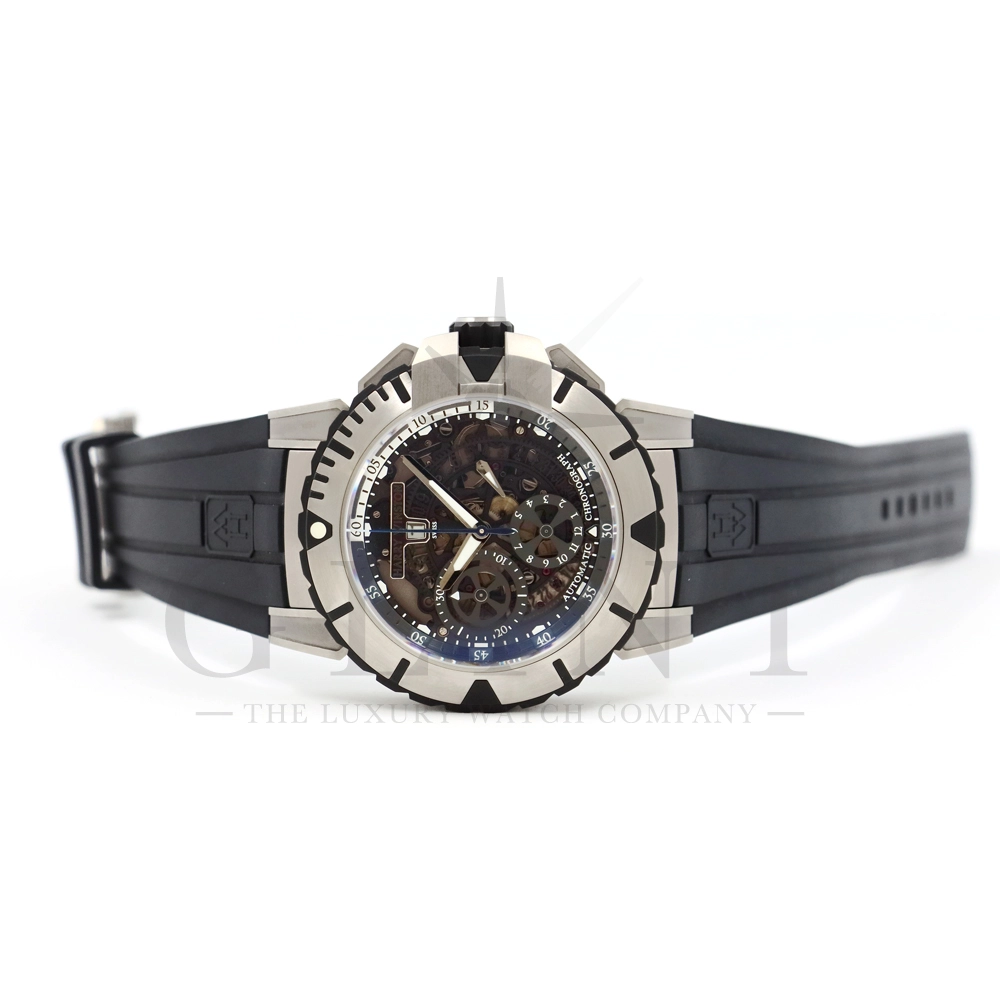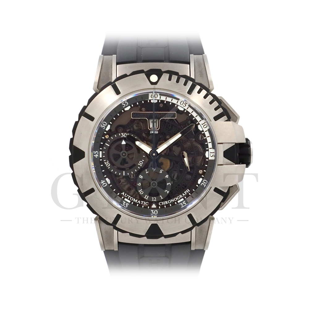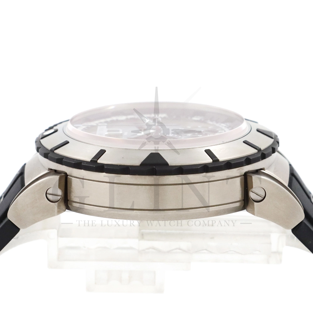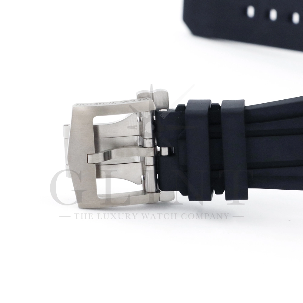 こちらはハリー・ウィンストン オーシャン スポーツ・クロノグラフです。素材にはハリー・ウィンストンが独自に開発したチタンより軽くて硬く、優れた耐アレルギー性と耐腐食性を持つジルコニウムが主成分のハイテク合金ザリウムを使用。見た目の印象とは違い、非常に軽くて、普段使いに最適です。スケルトナイズされた文字盤からは日付ディスクの動きやムーブメントの動きが眺められ、時計本来の魅力も存分に堪能する事が出来ます。ザリウム製の回転ベゼルにはDLC加工が施されており、ベゼルの耐久性を高めてくれるだけでは無く、よりスポーティで格好良い雰囲気を演出してくれるでしょう。200M防水にクロノグラフ、日付機能も備わった実用性が高い一本です。