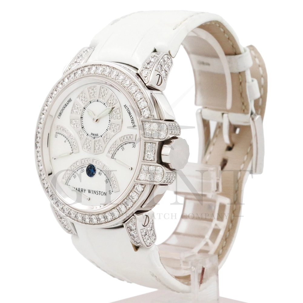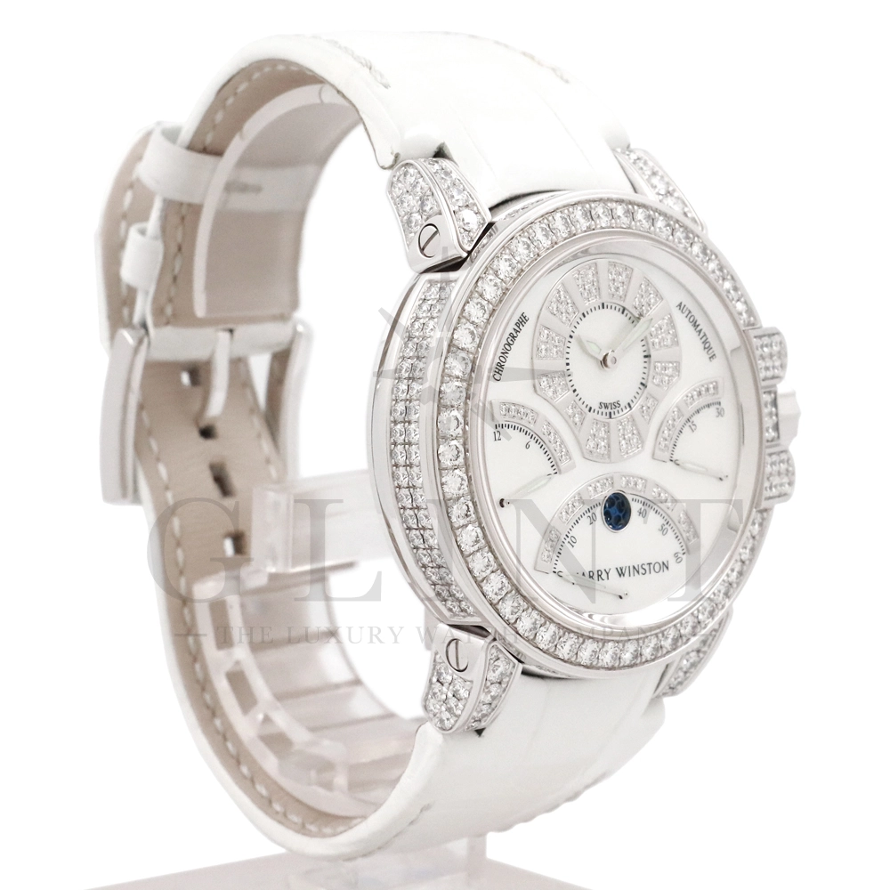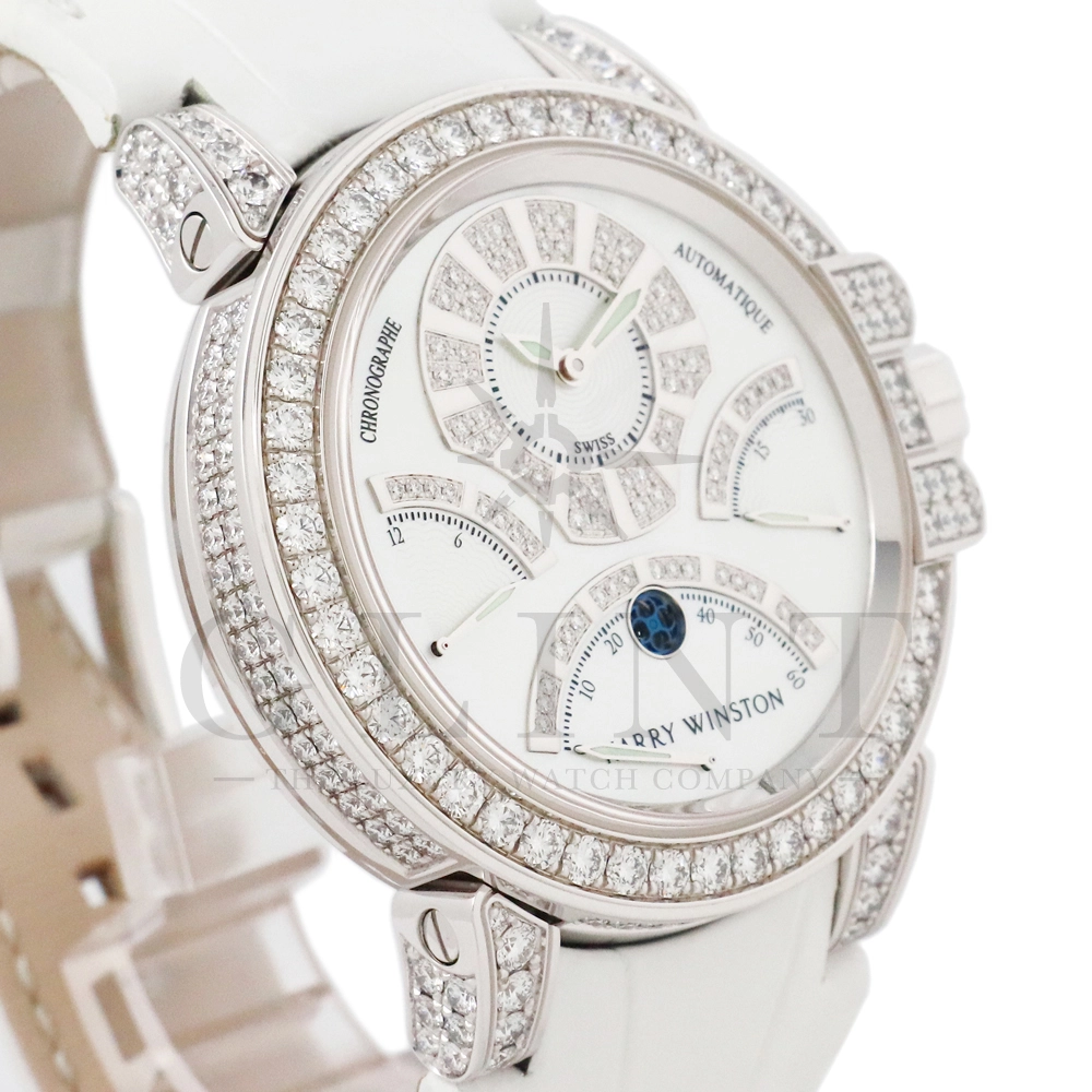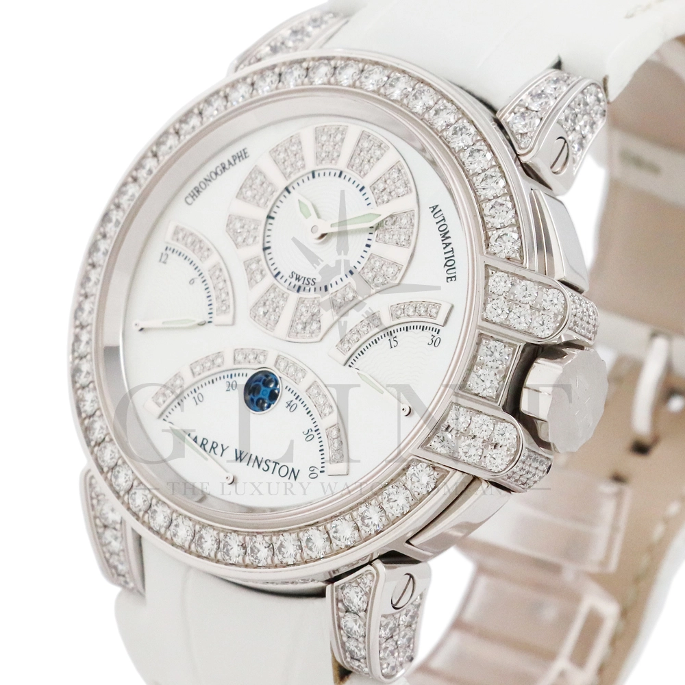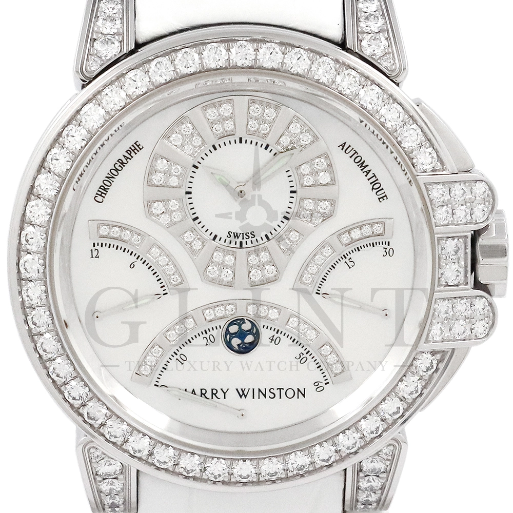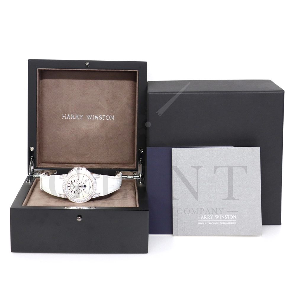 こちらはハリー・ウィンストン オーシャン トリレトロ クロノグラフです。ハリーウィンストン純正ダイヤモンドを贅沢に使用した大変人気の高いモデル。ケースサイドやラグ部分にまでダイヤモンドがセッティングされており、圧倒的な存在感を放ちます。角度や光加減によって様々な美しい表情を見せるホワイトシェル文字盤が高級感を更に後押ししてくれるでしょう。ディティールにこだわったハリーウィンストンらしい独創的なデザインと機能美を実現した最高級のジュエリーウォッチ。必ずやお客様をご満足させてくれる魅力を十分に備えた逸品をぜひお試し下さい。