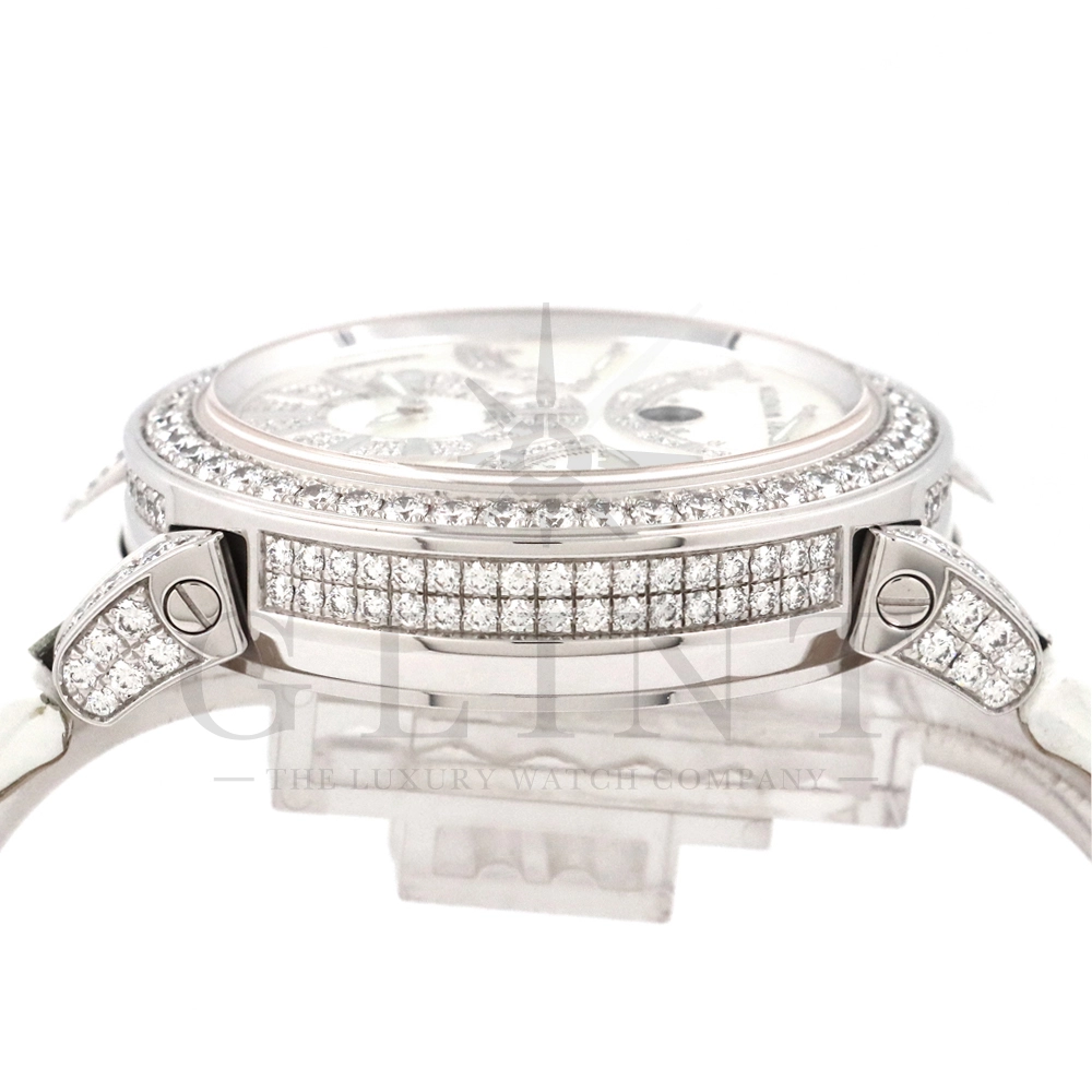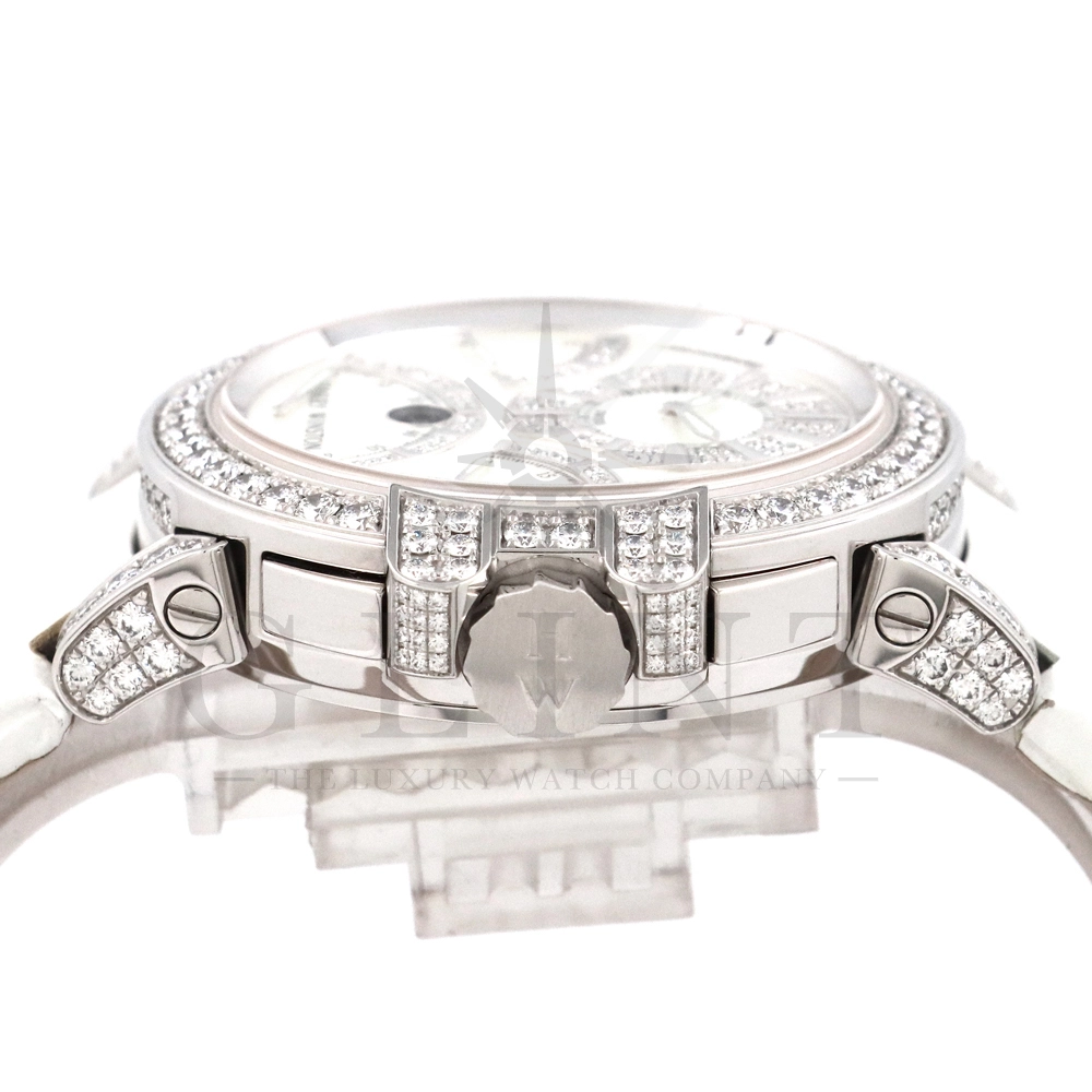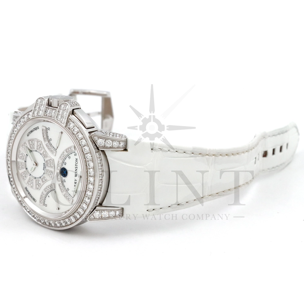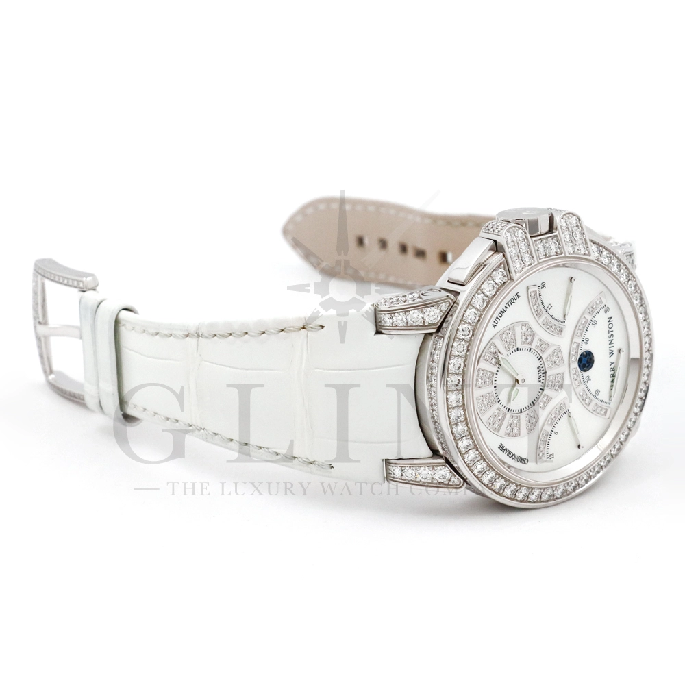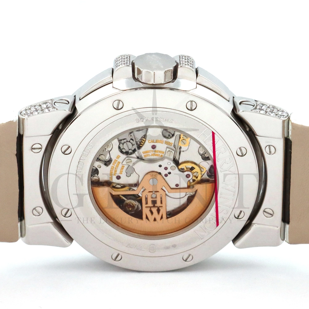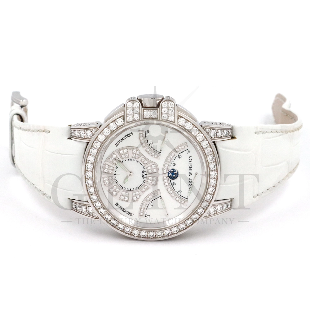 こちらはハリー・ウィンストン オーシャン トリレトロ クロノグラフです。ハリーウィンストン純正ダイヤモンドを贅沢に使用した大変人気の高いモデル。ケースサイドやラグ部分にまでダイヤモンドがセッティングされており、圧倒的な存在感を放ちます。角度や光加減によって様々な美しい表情を見せるホワイトシェル文字盤が高級感を更に後押ししてくれるでしょう。ディティールにこだわったハリーウィンストンらしい独創的なデザインと機能美を実現した最高級のジュエリーウォッチ。必ずやお客様をご満足させてくれる魅力を十分に備えた逸品をぜひお試し下さい。