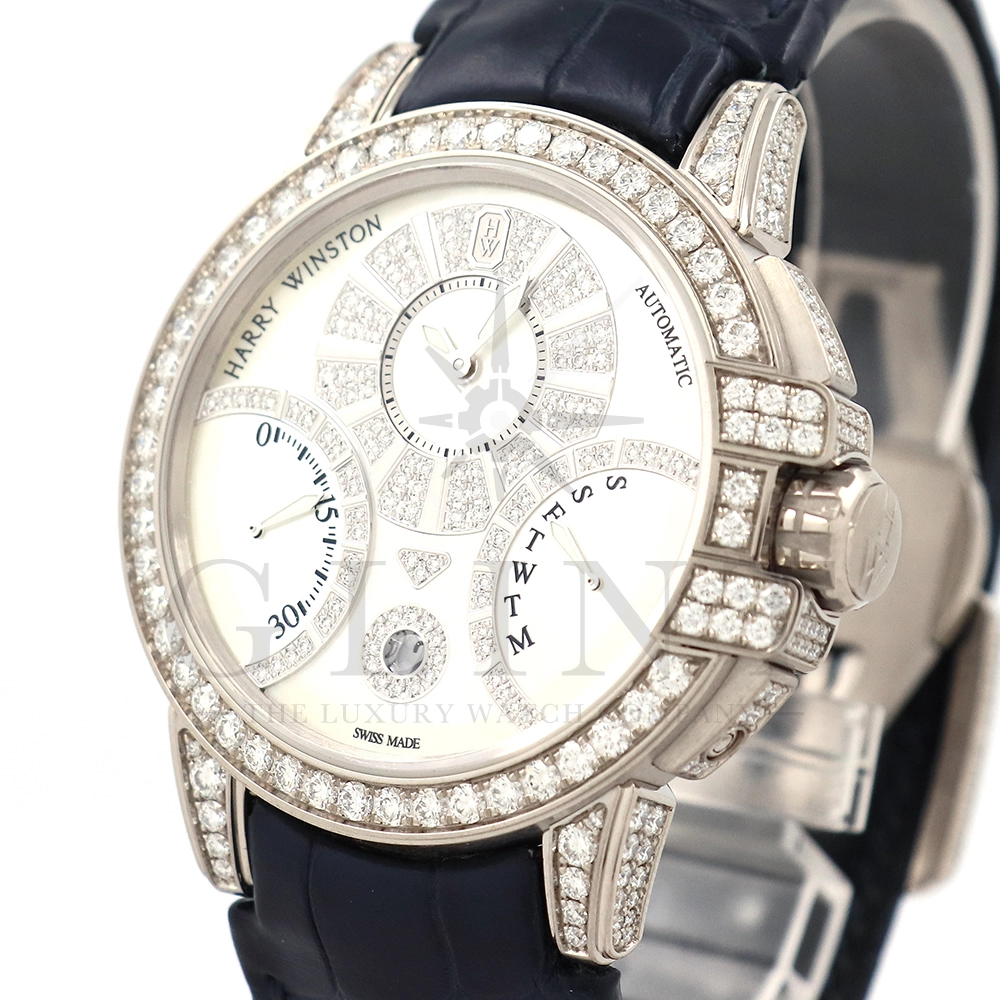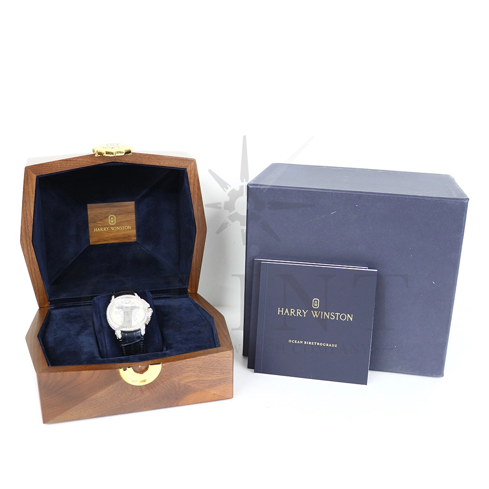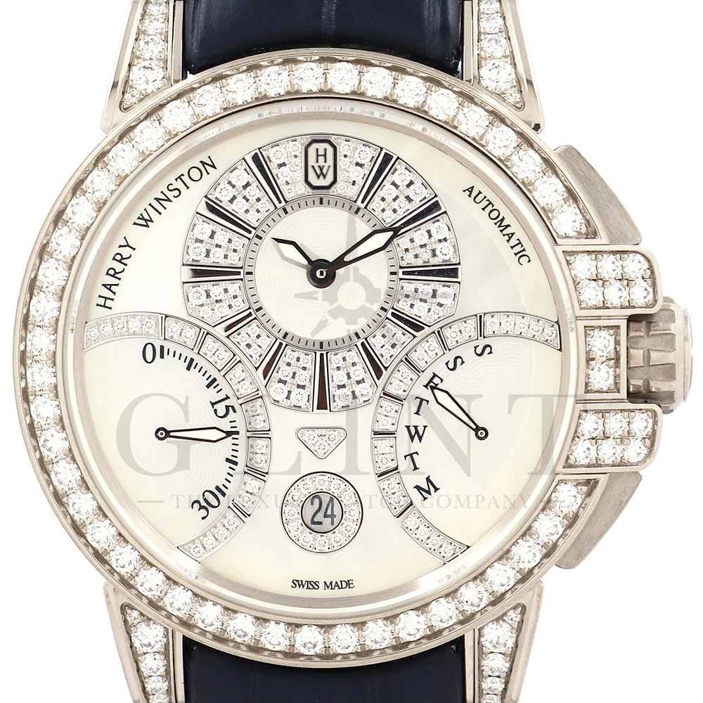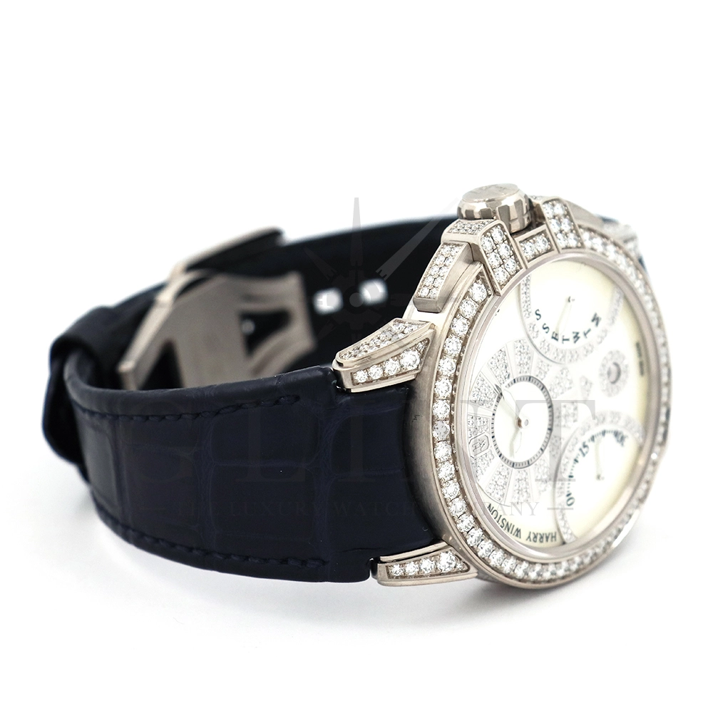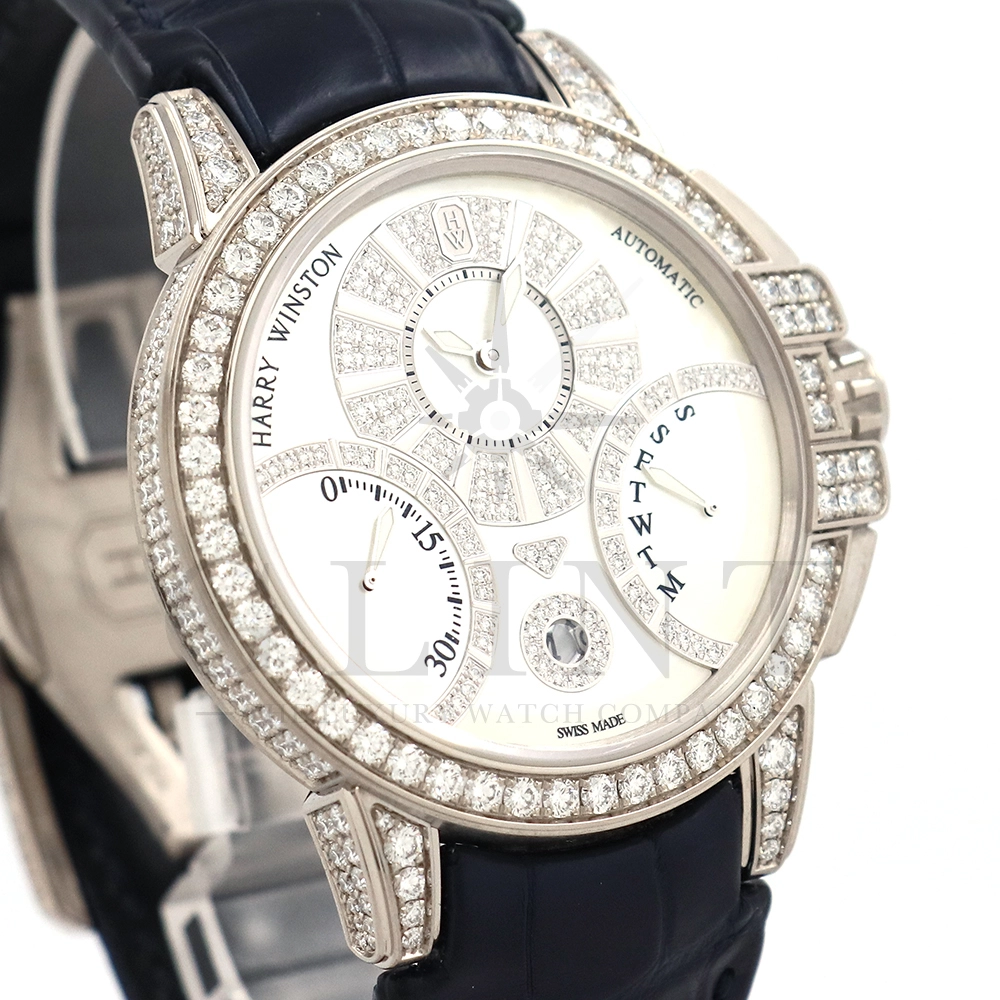 こちらはオーシャン・バイレトログラード オートマティック 42 純正ダイヤモンドモデルです。ケース素材には18Kホワイトゴールドを使用。ベゼルとケース、バックルには総計367個(約4.50カラット)のダイヤモンド、ホワイトシェルの文字盤には127個(約0.41カラット)のダイヤモンドがセッティングされており、ダイヤモンドの輝きと美しさが時計全体を華やかに演出してくれます。オフセンターで配置された時刻表示、レトログラード式の秒、曜日表示、6時位置には日付表示を装備し、実用性も抜群です。「キング・オブ・ダイヤモンド」と称され世界的に名高いハリーウィンストンらしい魅力が存分に詰まった最高峰のラグジュアリーウオッチです。