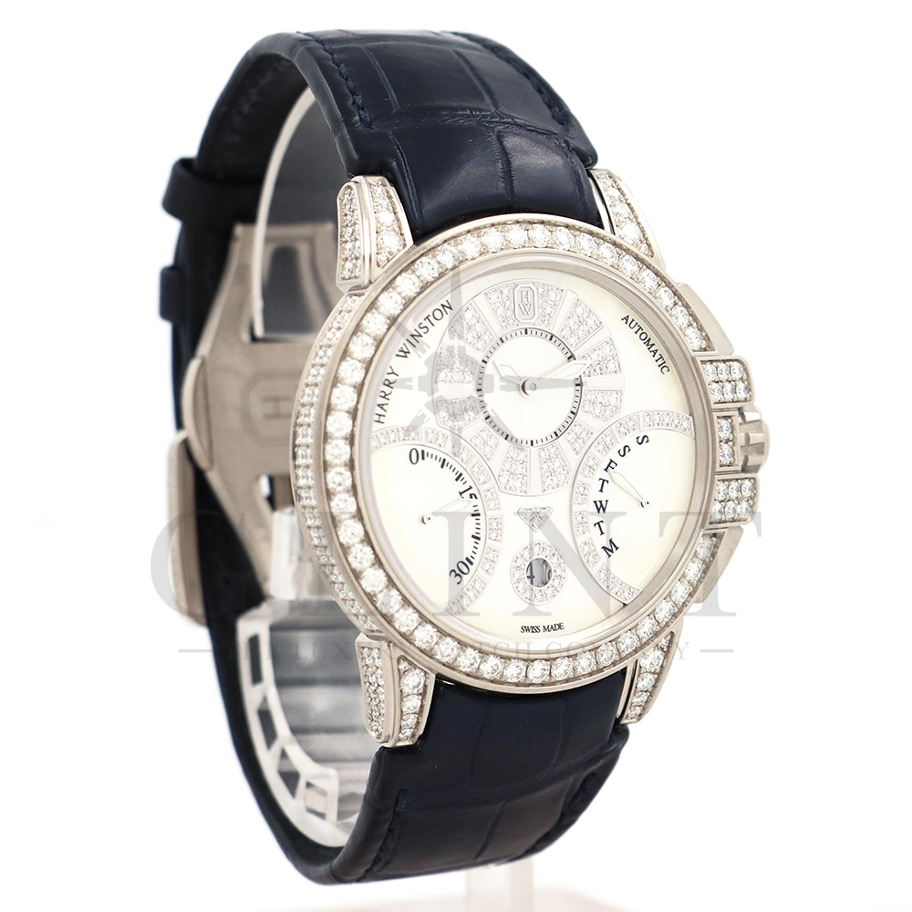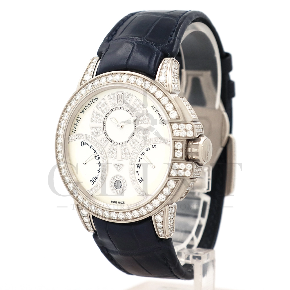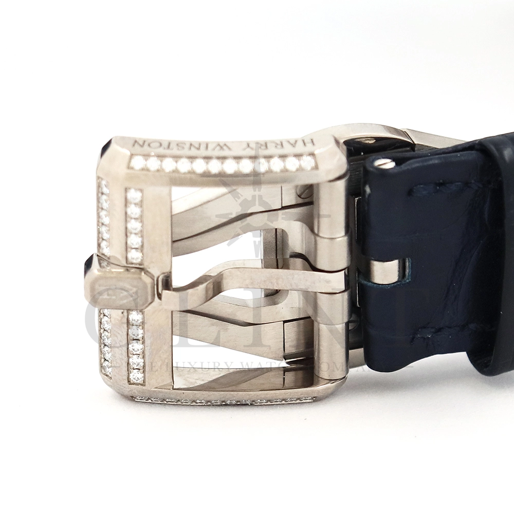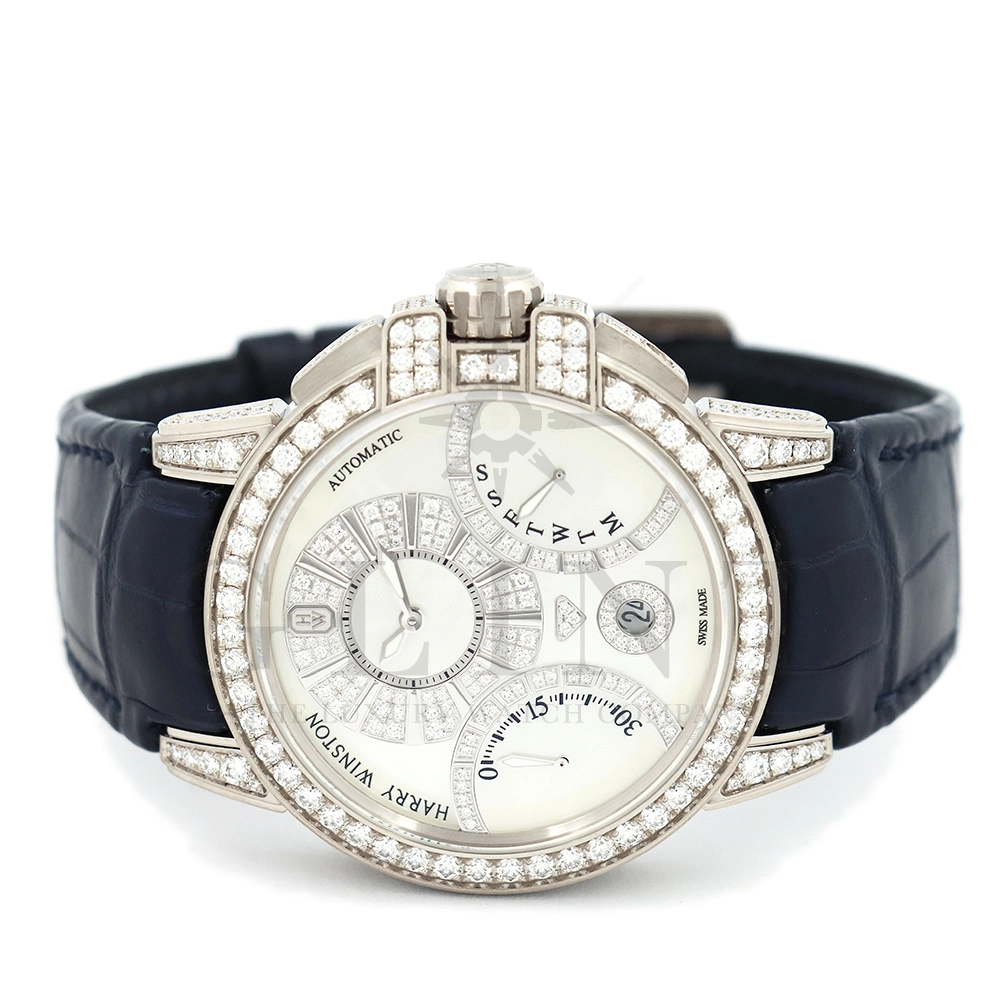 こちらはオーシャン・バイレトログラード オートマティック 42 純正ダイヤモンドモデルです。ケース素材には18Kホワイトゴールドを使用。ベゼルとケース、バックルには総計367個(約4.50カラット)のダイヤモンド、ホワイトシェルの文字盤には127個(約0.41カラット)のダイヤモンドがセッティングされており、ダイヤモンドの輝きと美しさが時計全体を華やかに演出してくれます。オフセンターで配置された時刻表示、レトログラード式の秒、曜日表示、6時位置には日付表示を装備し、実用性も抜群です。「キング・オブ・ダイヤモンド」と称され世界的に名高いハリーウィンストンらしい魅力が存分に詰まった最高峰のラグジュアリーウオッチです。