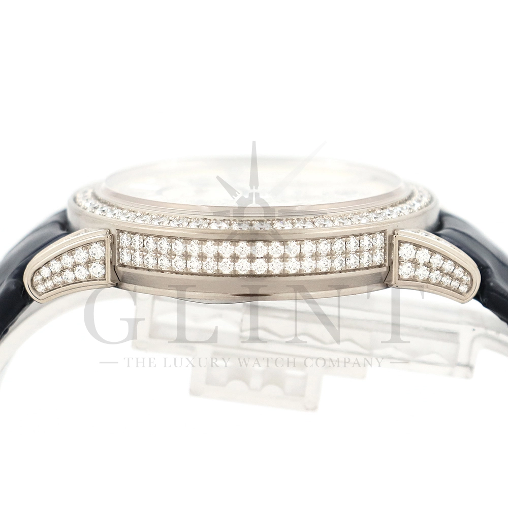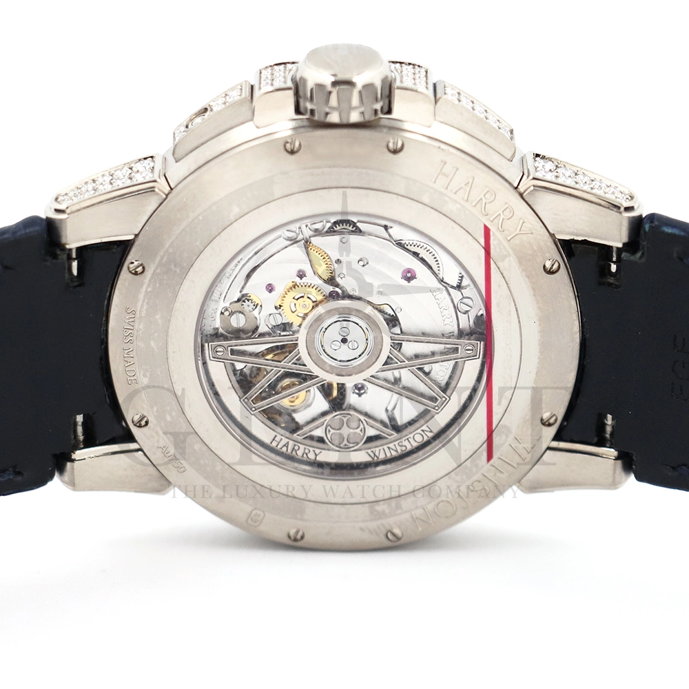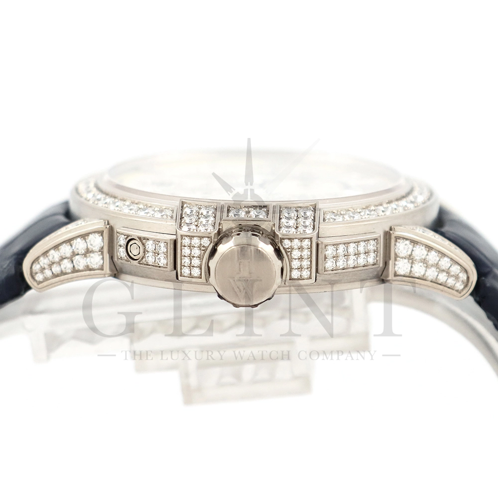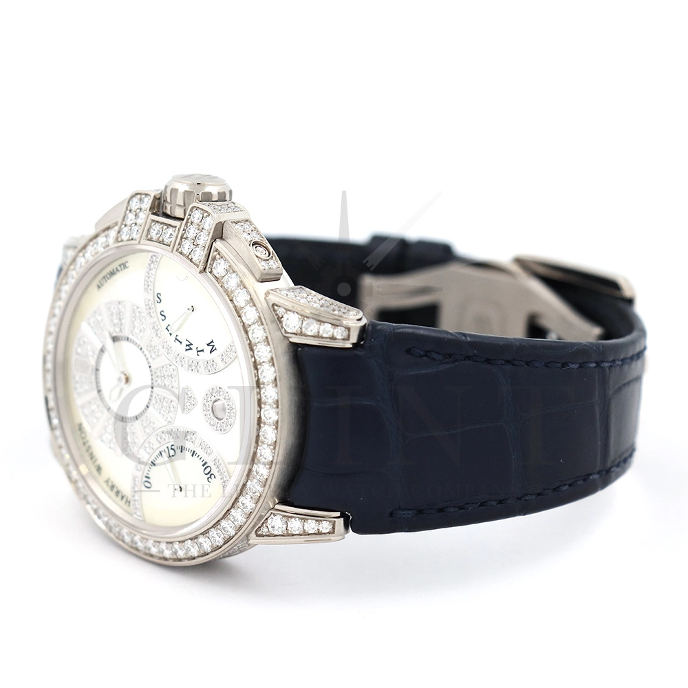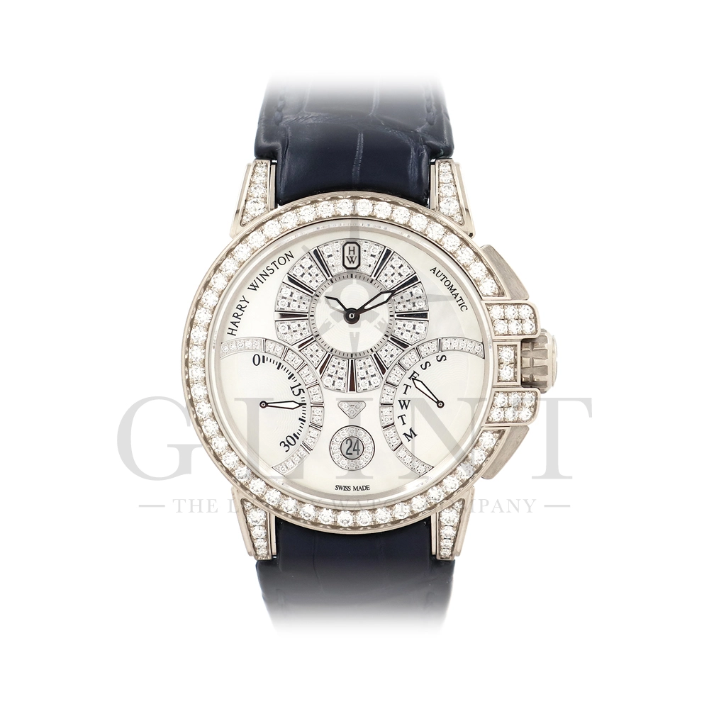 こちらはオーシャン・バイレトログラード オートマティック 42 純正ダイヤモンドモデルです。ケース素材には18Kホワイトゴールドを使用。ベゼルとケース、バックルには総計367個(約4.50カラット)のダイヤモンド、ホワイトシェルの文字盤には127個(約0.41カラット)のダイヤモンドがセッティングされており、ダイヤモンドの輝きと美しさが時計全体を華やかに演出してくれます。オフセンターで配置された時刻表示、レトログラード式の秒、曜日表示、6時位置には日付表示を装備し、実用性も抜群です。「キング・オブ・ダイヤモンド」と称され世界的に名高いハリーウィンストンらしい魅力が存分に詰まった最高峰のラグジュアリーウオッチです。