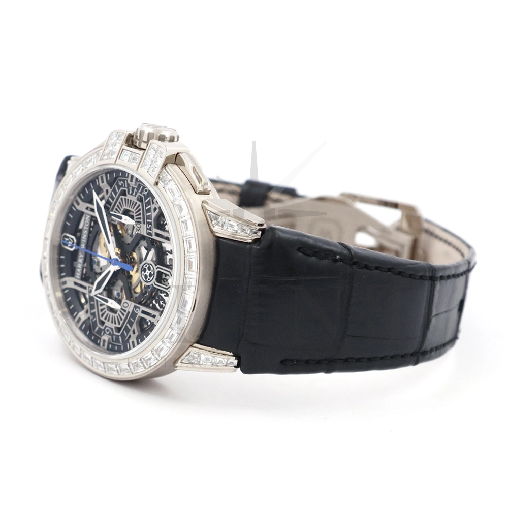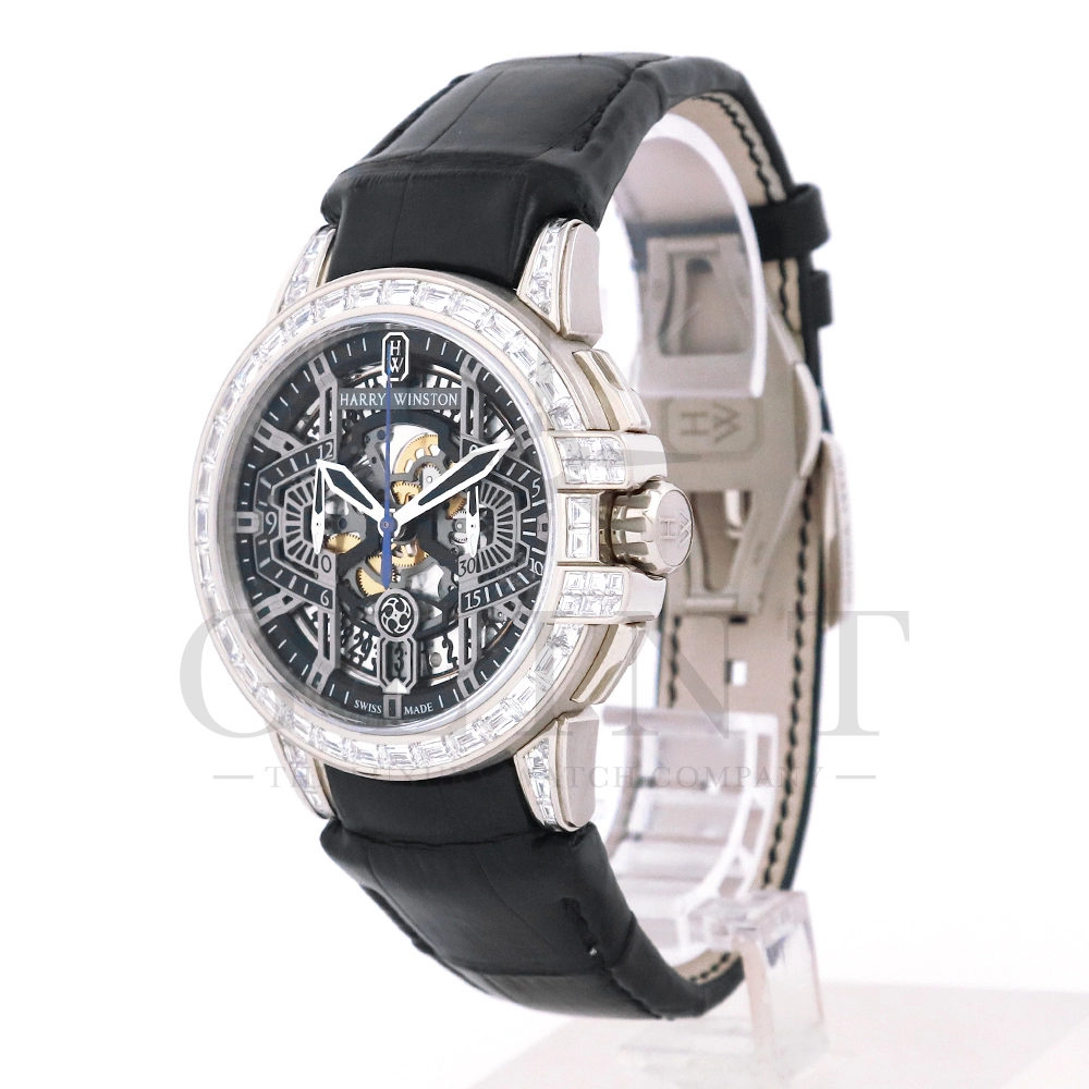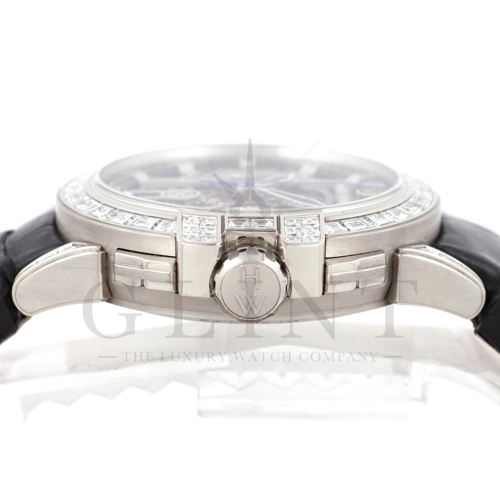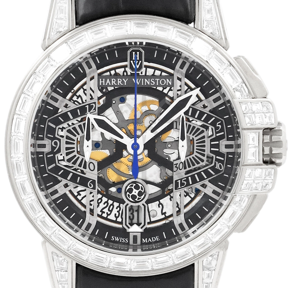 こちらはシリーズ9作目となる300本限定モデル「プロジェクトZ9」から派生し、ケース素材に18Kホワイトゴールドを採用したオーシャン・クロノグラフです。つい見とれてしまう程の美しい輝きを放つ最高級バゲットダイヤモンドをセッティングした定価1518万円もの値が付く世界限定20本モデル。幾何学模様を彷彿とさせるスケルトナイズされた文字盤に時計本来の美しさを感じさせつつも、バゲットダイヤモンドのまばゆい輝きが相乗効果をもたらし、時計の魅力を最大限に引き立ててくれるでしょう。ラグやバックルにもバゲットダイヤモンドを惜しみなくセッティングされており、ハリー・ウィンストンらしくディティールにこだわった珠玉の逸品となっております。お客様の腕元で至福の時間を刻んでくれる事は間違いありません。