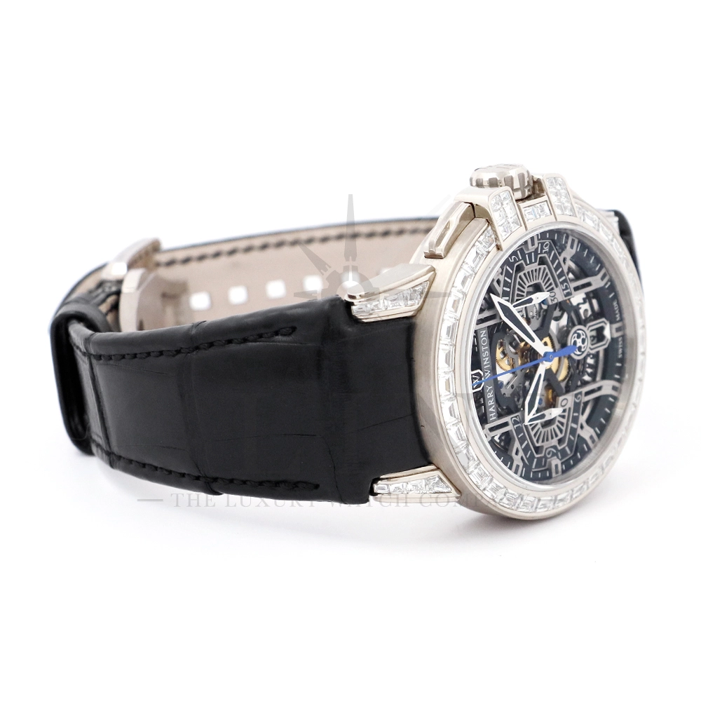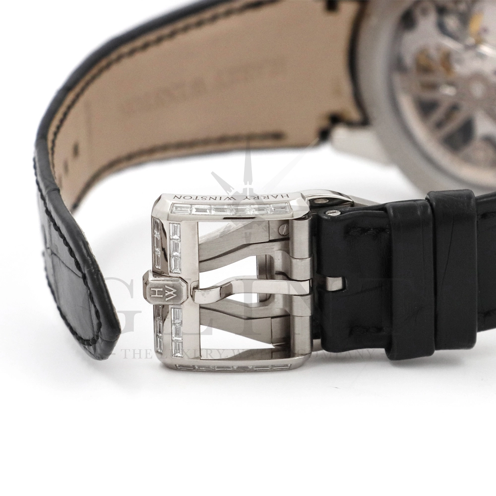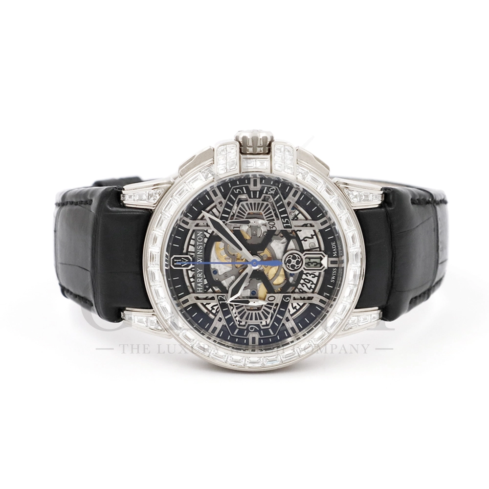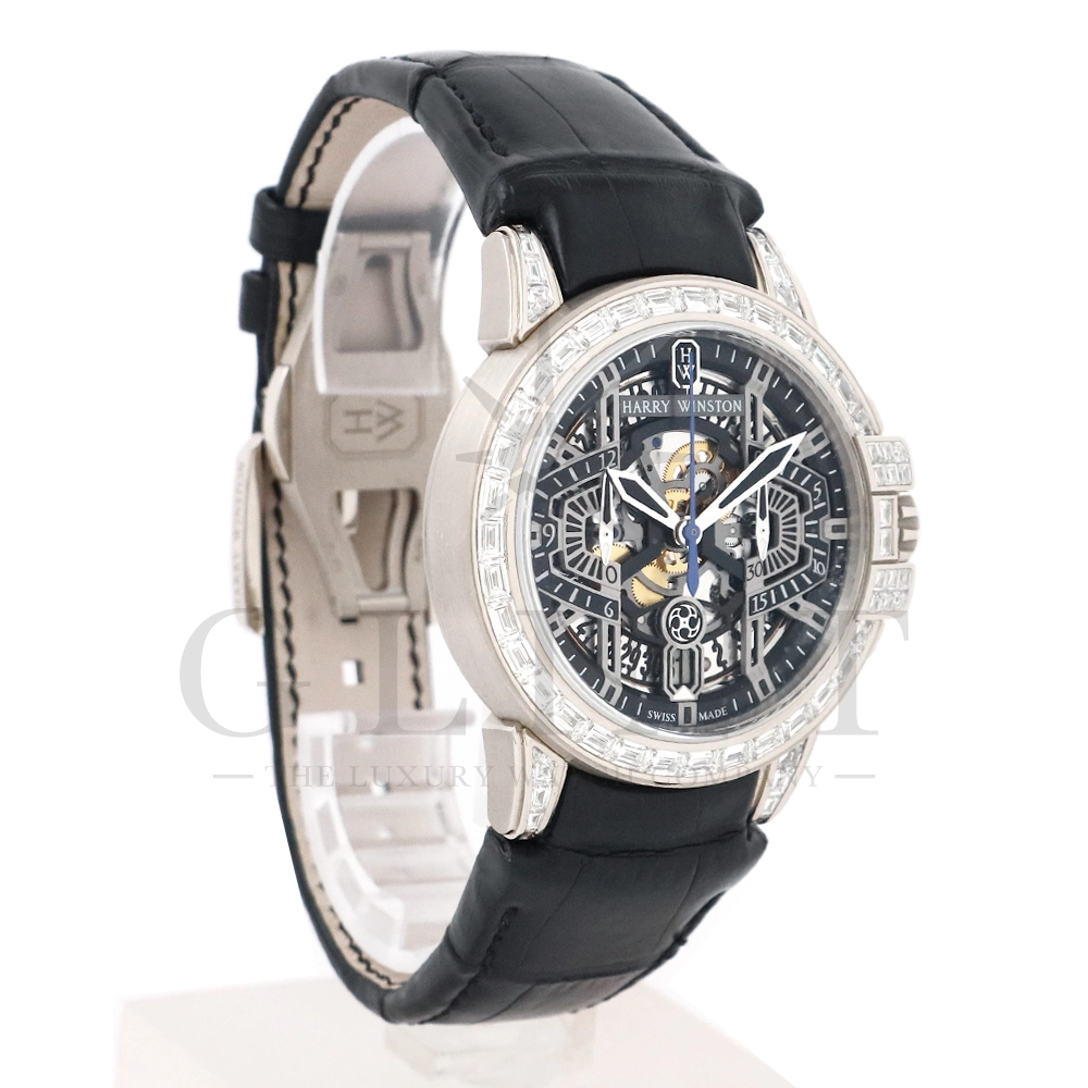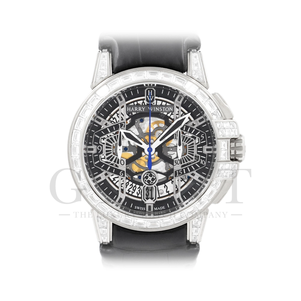 こちらはシリーズ9作目となる300本限定モデル「プロジェクトZ9」から派生し、ケース素材に18Kホワイトゴールドを採用したオーシャン・クロノグラフです。つい見とれてしまう程の美しい輝きを放つ最高級バゲットダイヤモンドをセッティングした定価1518万円もの値が付く世界限定20本モデル。幾何学模様を彷彿とさせるスケルトナイズされた文字盤に時計本来の美しさを感じさせつつも、バゲットダイヤモンドのまばゆい輝きが相乗効果をもたらし、時計の魅力を最大限に引き立ててくれるでしょう。ラグやバックルにもバゲットダイヤモンドを惜しみなくセッティングされており、ハリー・ウィンストンらしくディティールにこだわった珠玉の逸品となっております。お客様の腕元で至福の時間を刻んでくれる事は間違いありません。