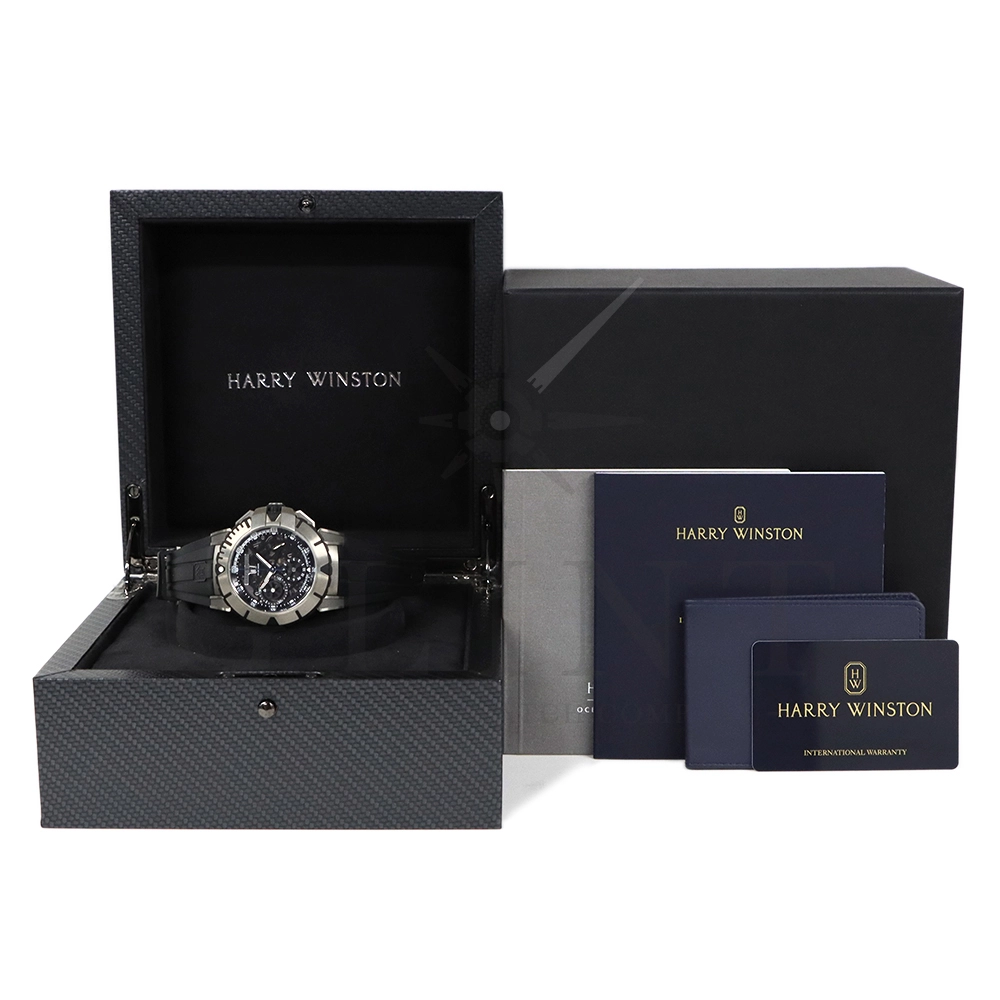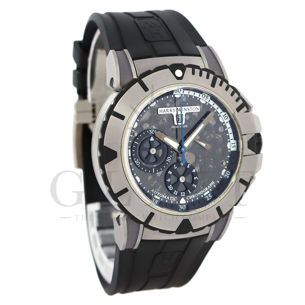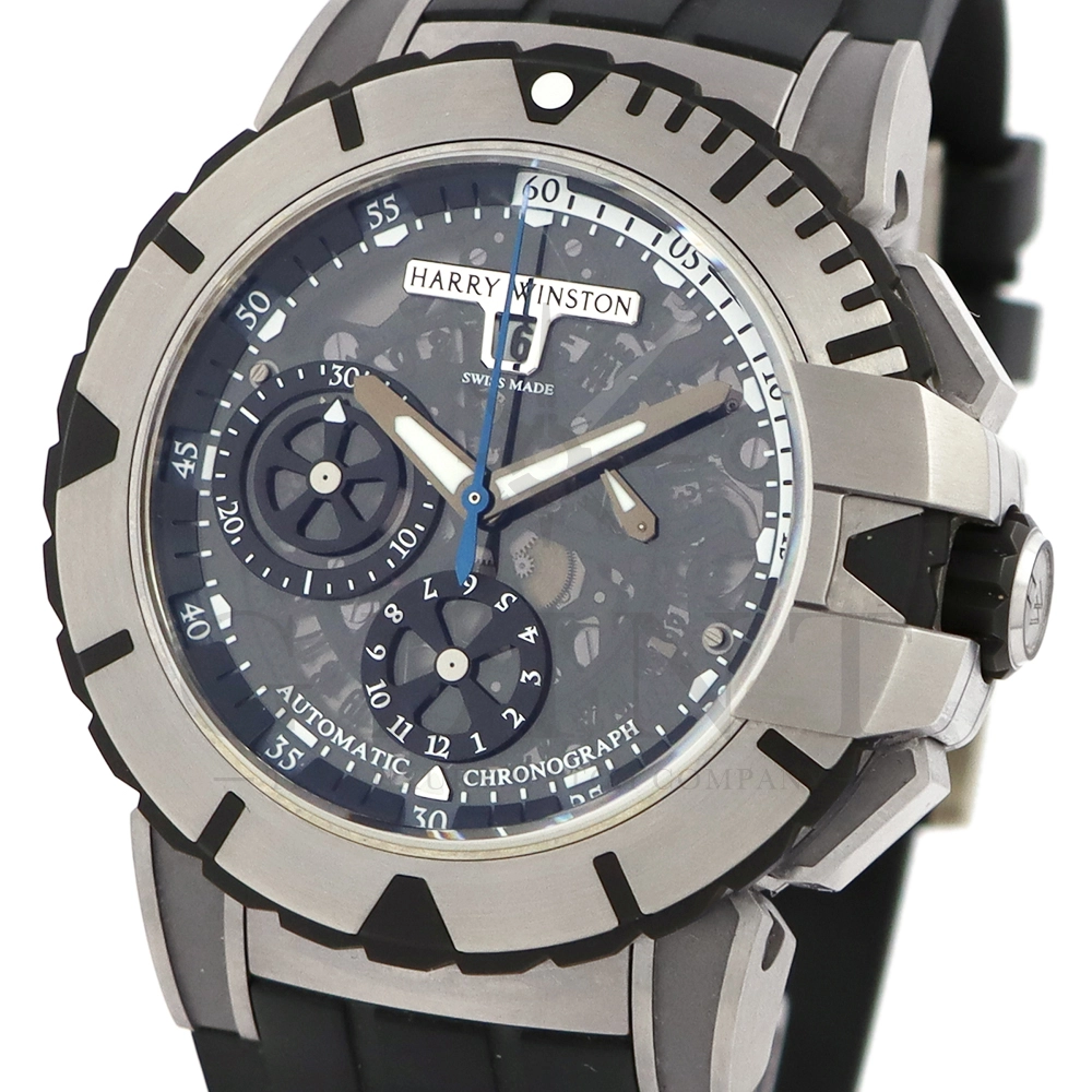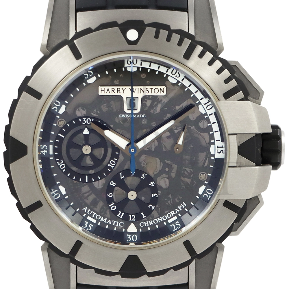 こちらはハリー・ウィンストン オーシャン スポーツ・クロノグラフです。素材にはハリー・ウィンストンが独自に開発したチタンより軽くて硬く、優れた耐アレルギー性と耐腐食性を持つジルコニウムが主成分のハイテク合金ザリウムを使用。見た目の印象とは違い、非常に軽くて、普段使いに最適です。スケルトナイズされた文字盤からは日付ディスクの動きやムーブメントの動きが眺められ、時計本来の魅力も存分に堪能する事が出来ます。ザリウム製の回転ベゼルにはDLC加工が施されており、ベゼルの耐久性を高めてくれるだけでは無く、よりスポーティで格好良い雰囲気を演出してくれるでしょう。200M防水にクロノグラフ、日付機能も備わった実用性が高い一本です。