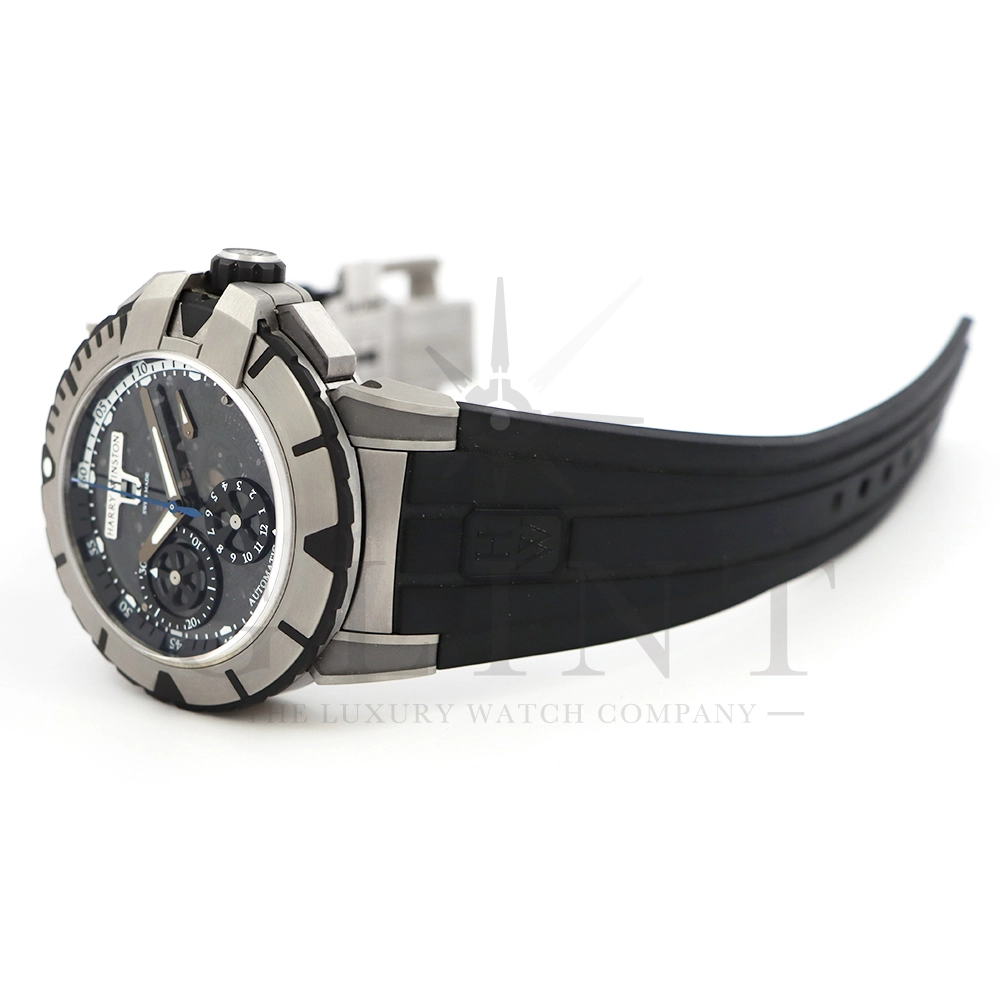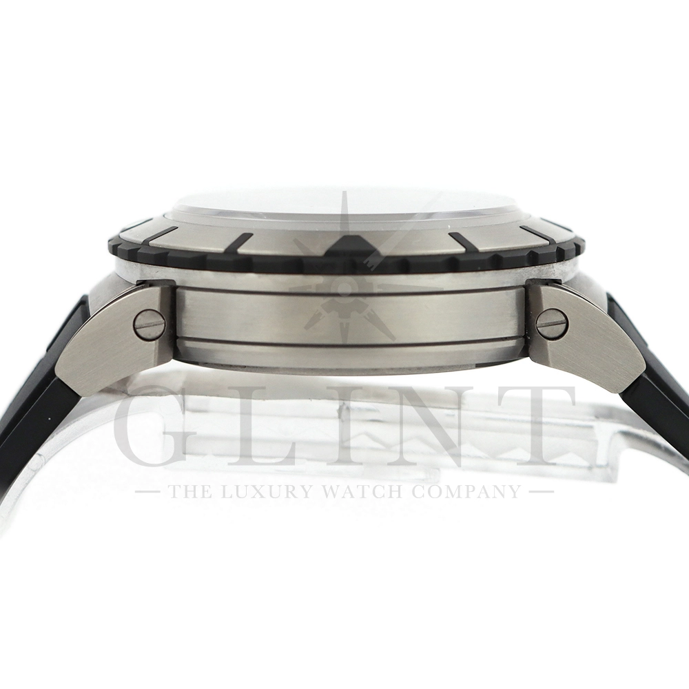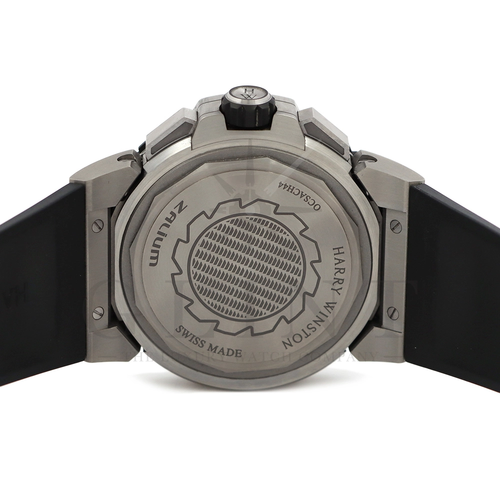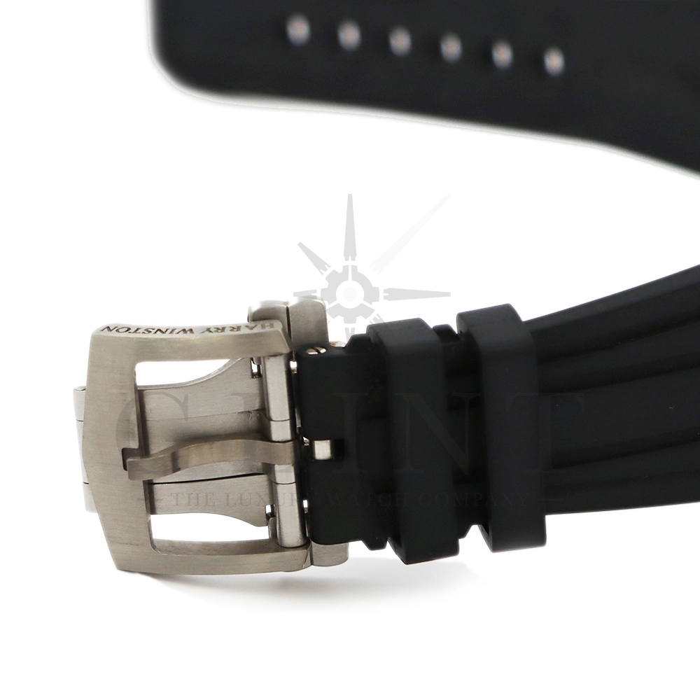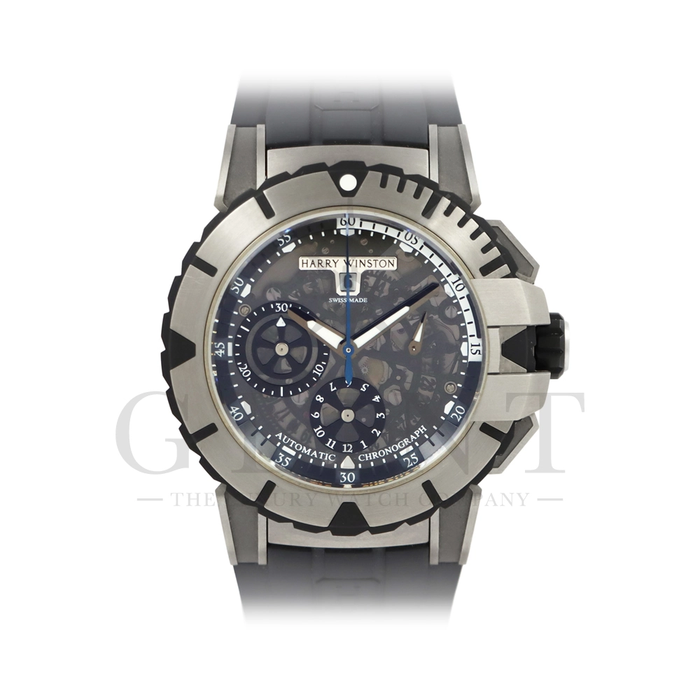 こちらはハリー・ウィンストン オーシャン スポーツ・クロノグラフです。素材にはハリー・ウィンストンが独自に開発したチタンより軽くて硬く、優れた耐アレルギー性と耐腐食性を持つジルコニウムが主成分のハイテク合金ザリウムを使用。見た目の印象とは違い、非常に軽くて、普段使いに最適です。スケルトナイズされた文字盤からは日付ディスクの動きやムーブメントの動きが眺められ、時計本来の魅力も存分に堪能する事が出来ます。ザリウム製の回転ベゼルにはDLC加工が施されており、ベゼルの耐久性を高めてくれるだけでは無く、よりスポーティで格好良い雰囲気を演出してくれるでしょう。200M防水にクロノグラフ、日付機能も備わった実用性が高い一本です。