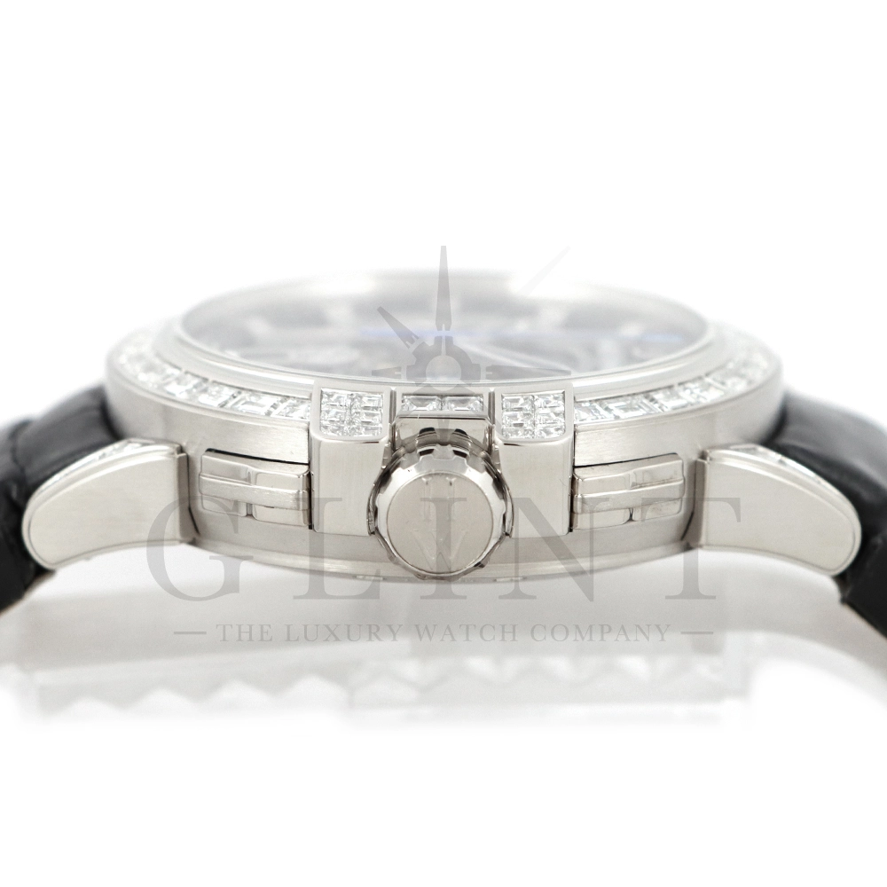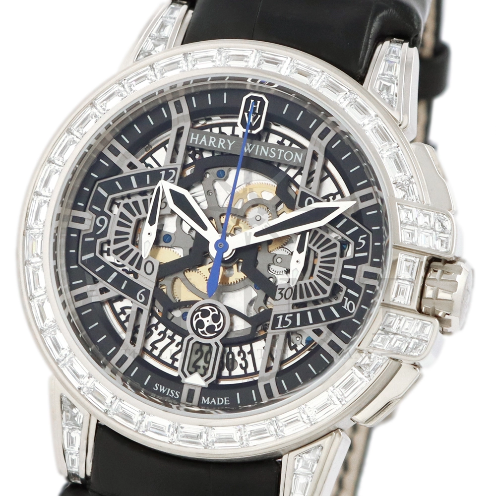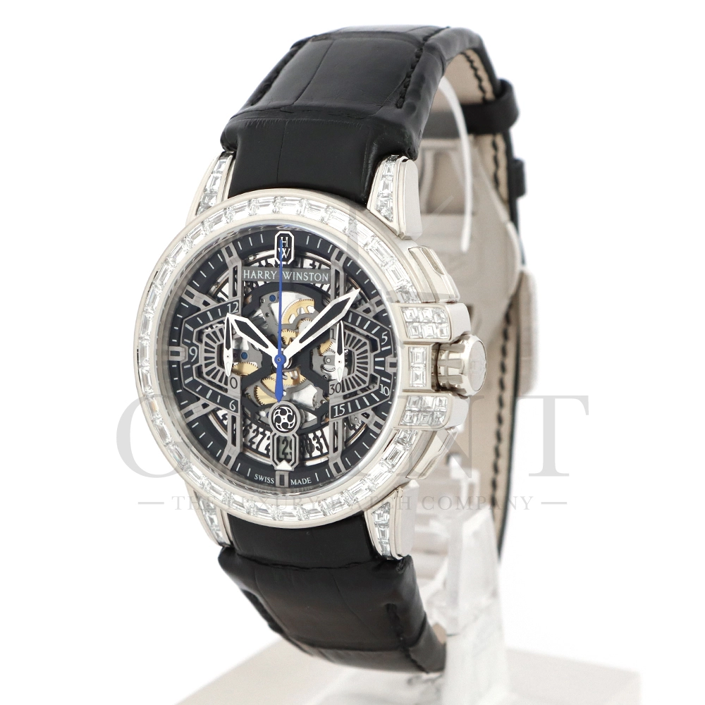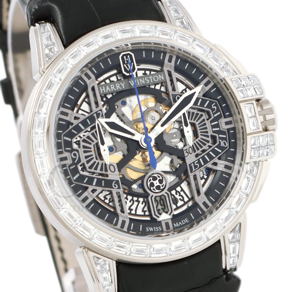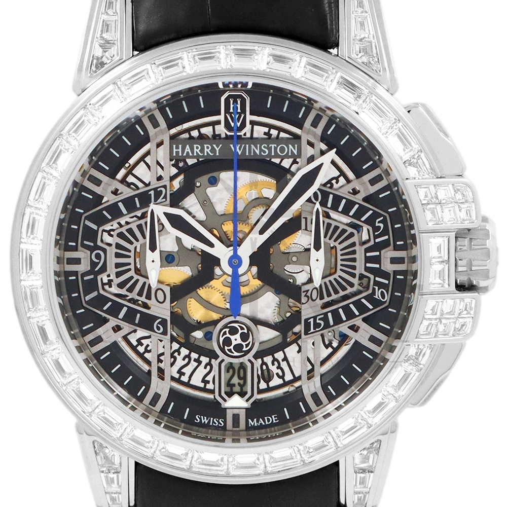 こちらはシリーズ9作目となる300本限定モデル「プロジェクトZ9」から派生し、ケース素材に18Kホワイトゴールドを採用したオーシャン・クロノグラフです。つい見とれてしまう程の美しい輝きを放つ最高級バゲットダイヤモンドをセッティングした定価1518万円もの値が付く世界限定20本モデル。幾何学模様を彷彿とさせるスケルトナイズされた文字盤に時計本来の美しさを感じさせつつも、バゲットダイヤモンドのまばゆい輝きが相乗効果をもたらし、時計の魅力を最大限に引き立ててくれるでしょう。ラグやバックルにもバゲットダイヤモンドを惜しみなくセッティングされており、ハリー・ウィンストンらしくディティールにこだわった珠玉の逸品となっております。お客様の腕元で至福の時間を刻んでくれる事は間違いありません。