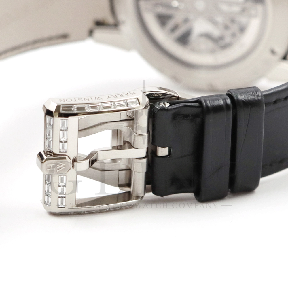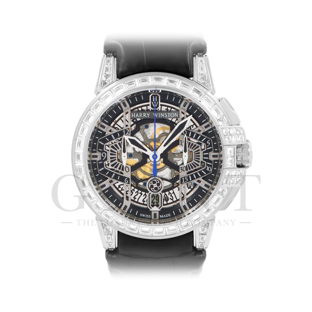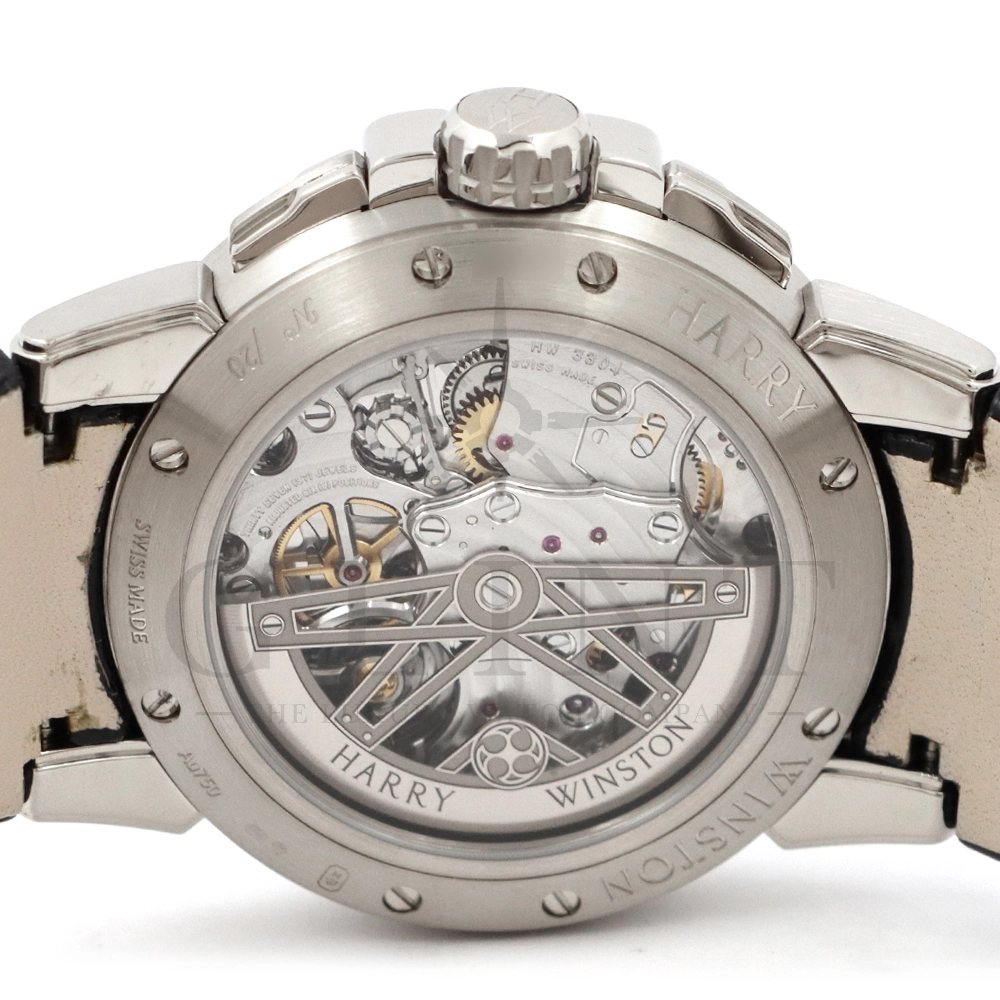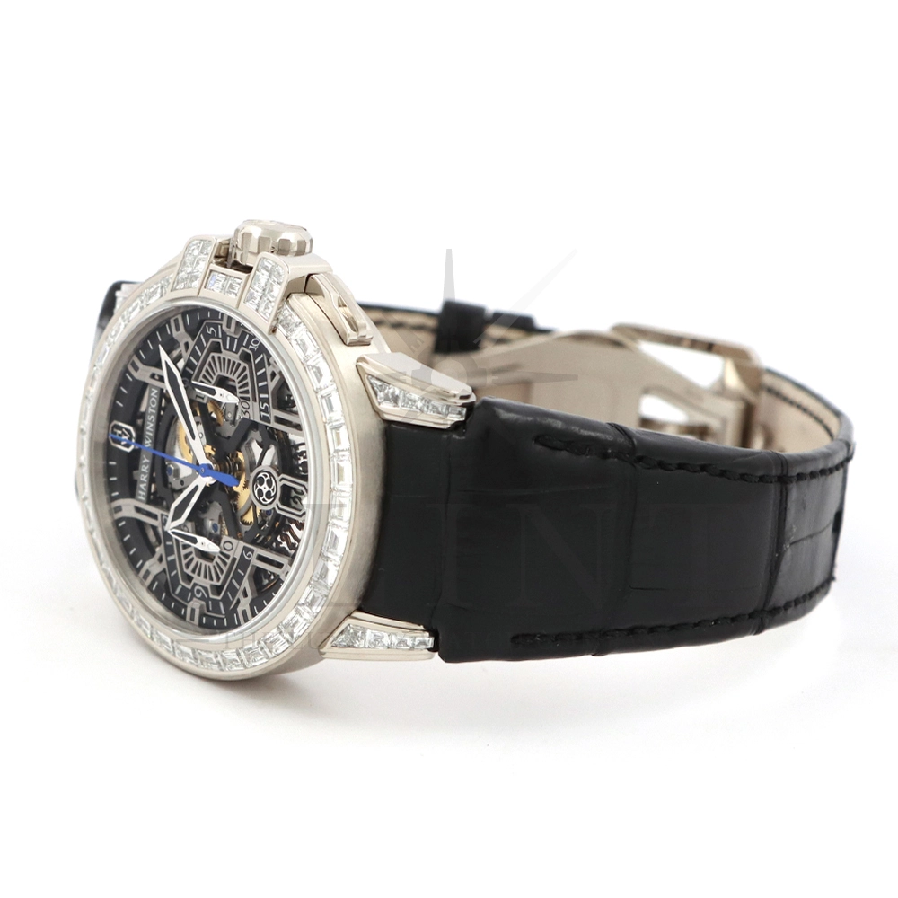 こちらはシリーズ9作目となる300本限定モデル「プロジェクトZ9」から派生し、ケース素材に18Kホワイトゴールドを採用したオーシャン・クロノグラフです。つい見とれてしまう程の美しい輝きを放つ最高級バゲットダイヤモンドをセッティングした定価1518万円もの値が付く世界限定20本モデル。幾何学模様を彷彿とさせるスケルトナイズされた文字盤に時計本来の美しさを感じさせつつも、バゲットダイヤモンドのまばゆい輝きが相乗効果をもたらし、時計の魅力を最大限に引き立ててくれるでしょう。ラグやバックルにもバゲットダイヤモンドを惜しみなくセッティングされており、ハリー・ウィンストンらしくディティールにこだわった珠玉の逸品となっております。お客様の腕元で至福の時間を刻んでくれる事は間違いありません。