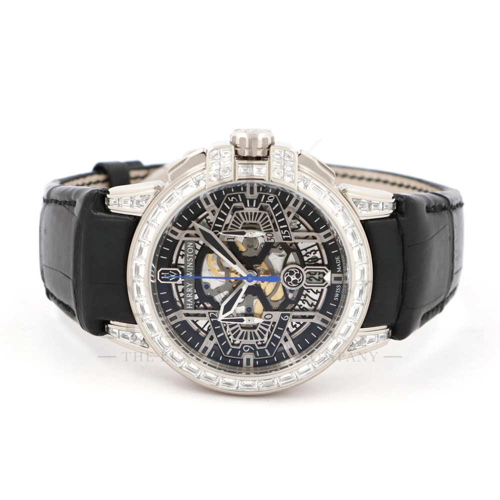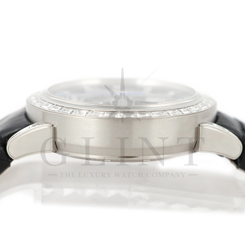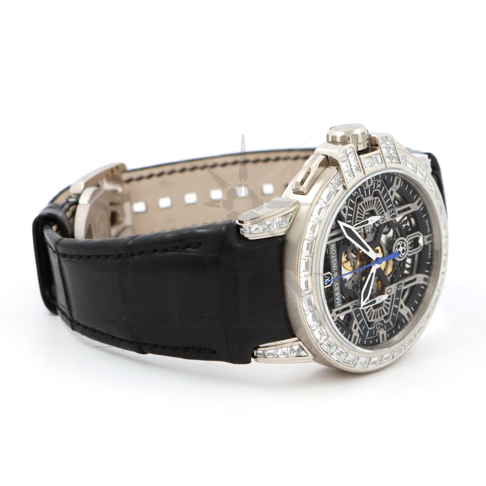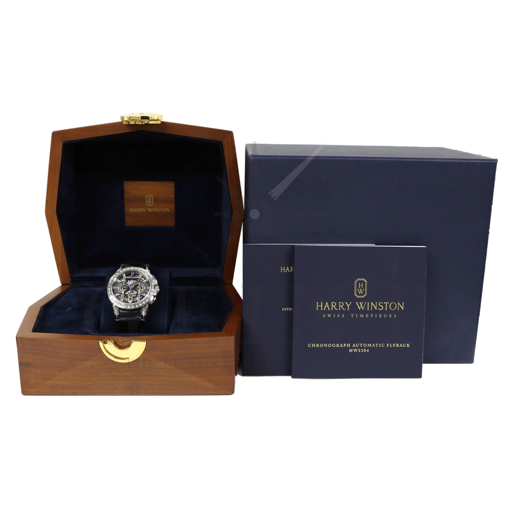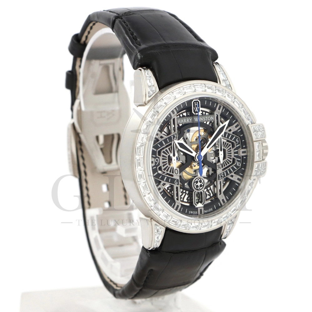 こちらはシリーズ9作目となる300本限定モデル「プロジェクトZ9」から派生し、ケース素材に18Kホワイトゴールドを採用したオーシャン・クロノグラフです。つい見とれてしまう程の美しい輝きを放つ最高級バゲットダイヤモンドをセッティングした定価1518万円もの値が付く世界限定20本モデル。幾何学模様を彷彿とさせるスケルトナイズされた文字盤に時計本来の美しさを感じさせつつも、バゲットダイヤモンドのまばゆい輝きが相乗効果をもたらし、時計の魅力を最大限に引き立ててくれるでしょう。ラグやバックルにもバゲットダイヤモンドを惜しみなくセッティングされており、ハリー・ウィンストンらしくディティールにこだわった珠玉の逸品となっております。お客様の腕元で至福の時間を刻んでくれる事は間違いありません。