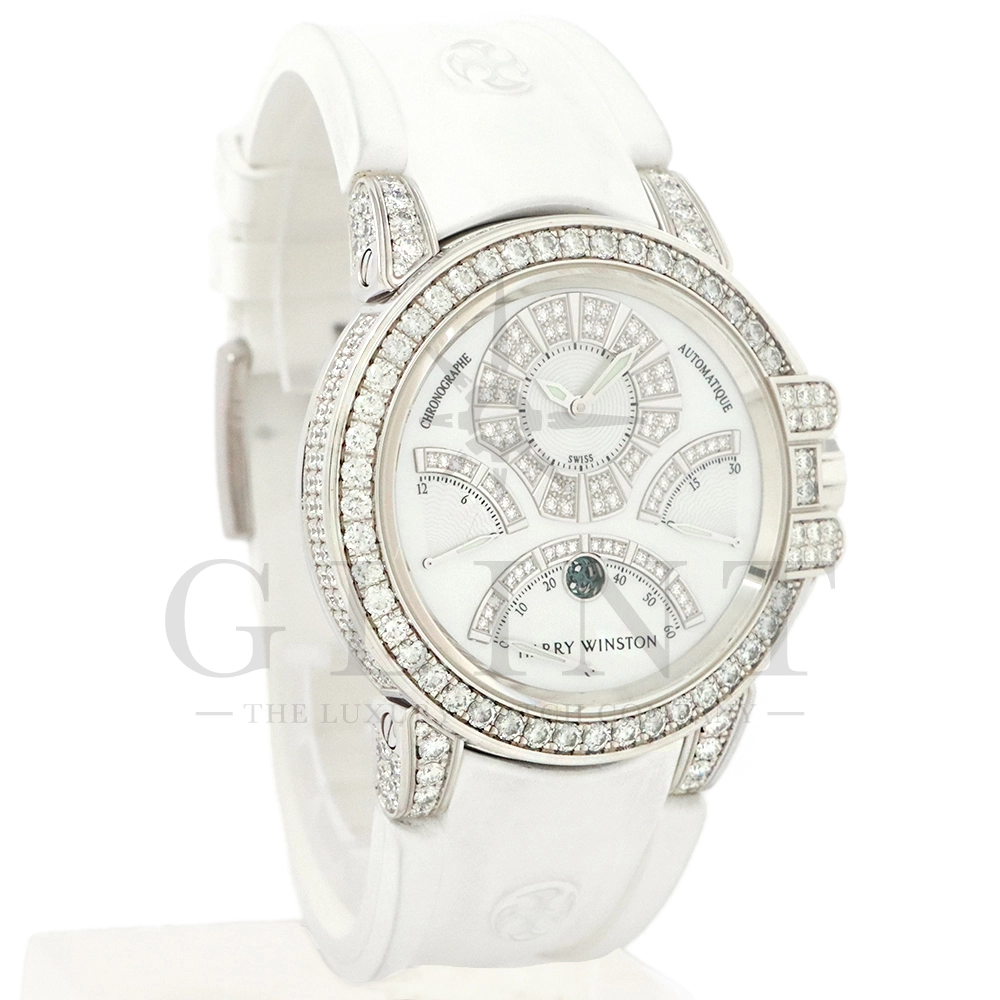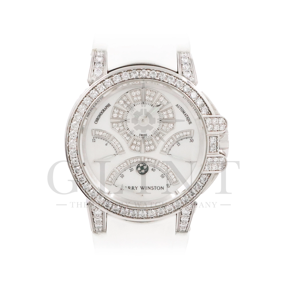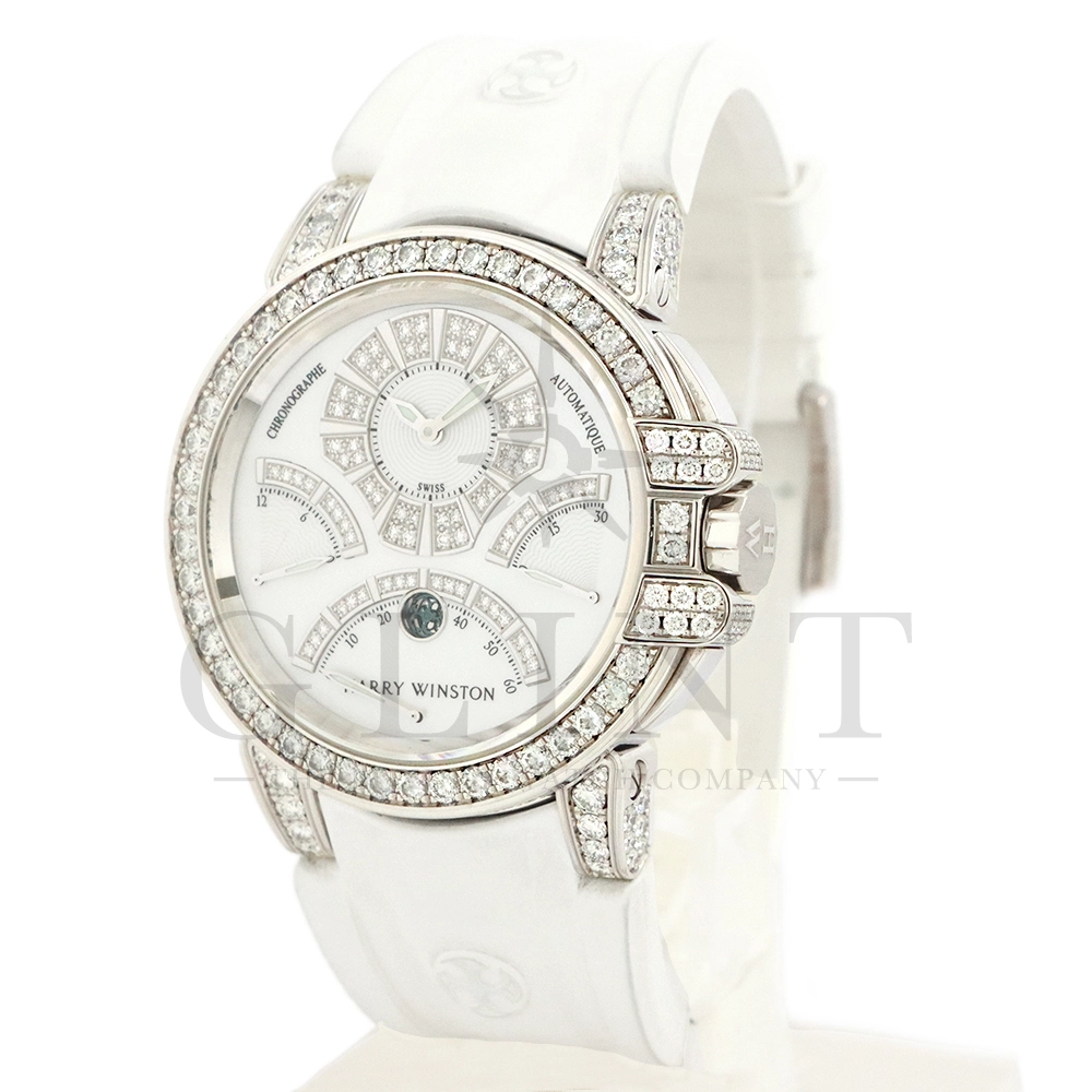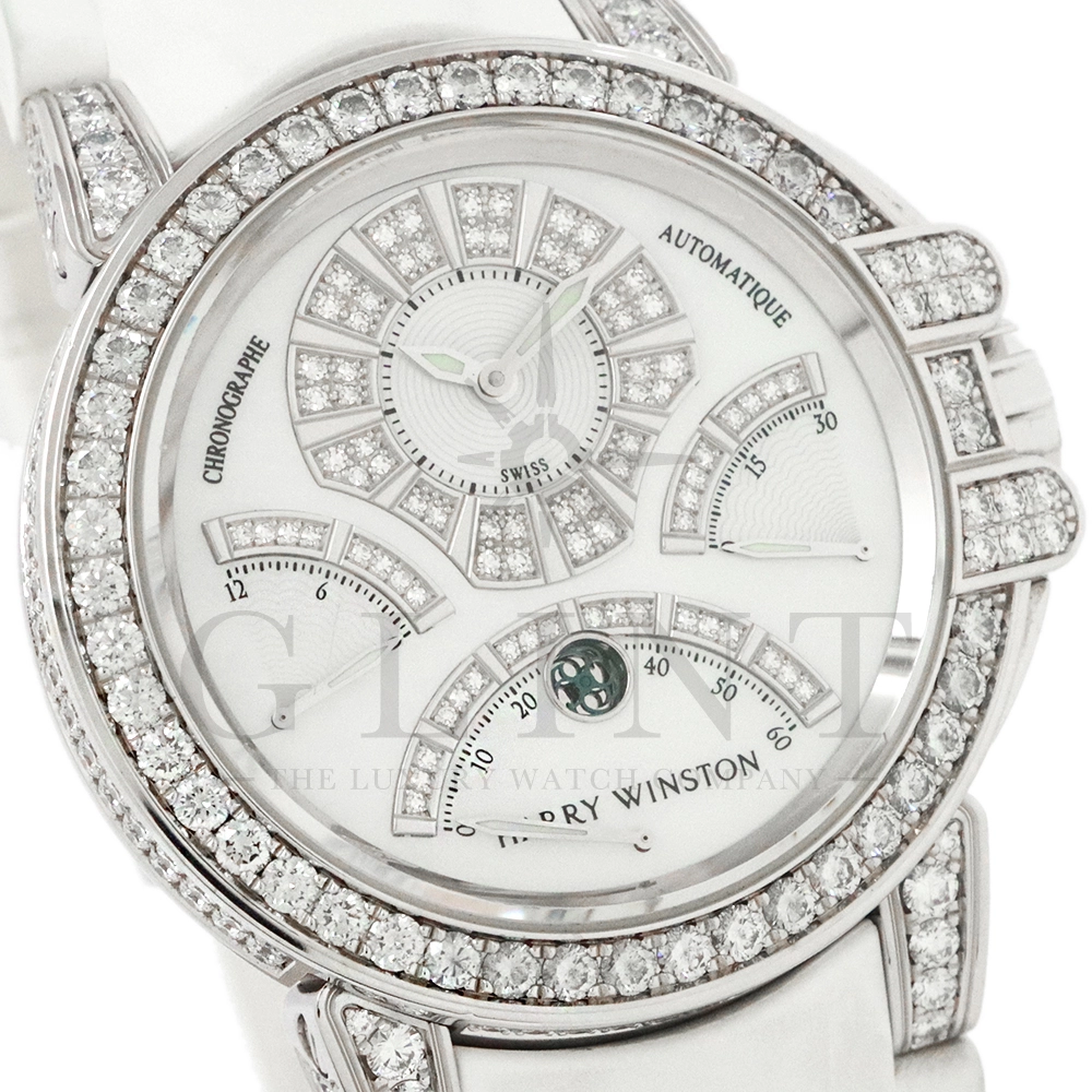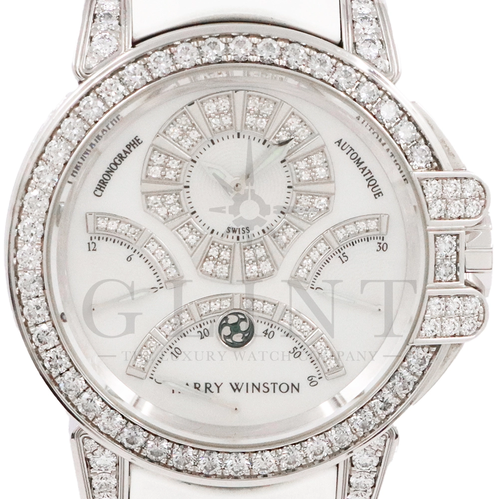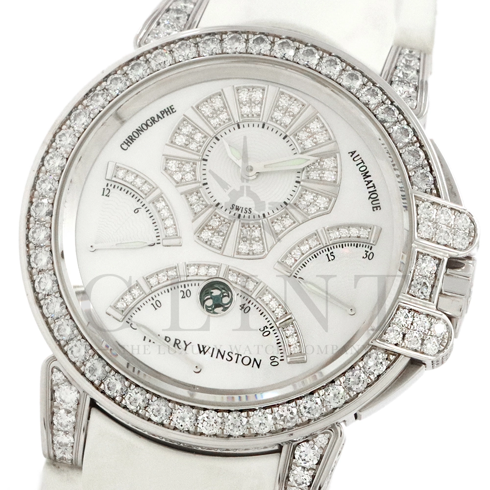 こちらはハリー・ウィンストン オーシャン トリレトロ クロノグラフです。ハリーウィンストン純正ダイヤモンドを贅沢に使用した大変人気の高いモデル。ケースサイドやラグ部分にまでダイヤモンドがセッティングされており、圧倒的な存在感を放ちます。角度や光加減によって様々な美しい表情を見せるホワイトシェル文字盤が高級感を更に後押ししてくれるでしょう。ディティールにこだわったハリーウィンストンらしい独創的なデザインと機能美を実現した最高級のジュエリーウォッチ。圧倒的な存在感でお客様のご満足度を高めてくれる逸品です。