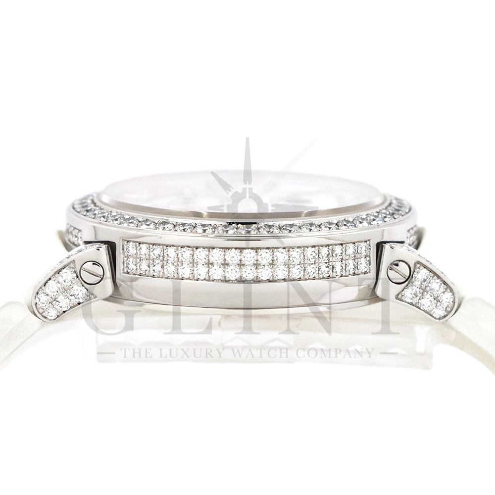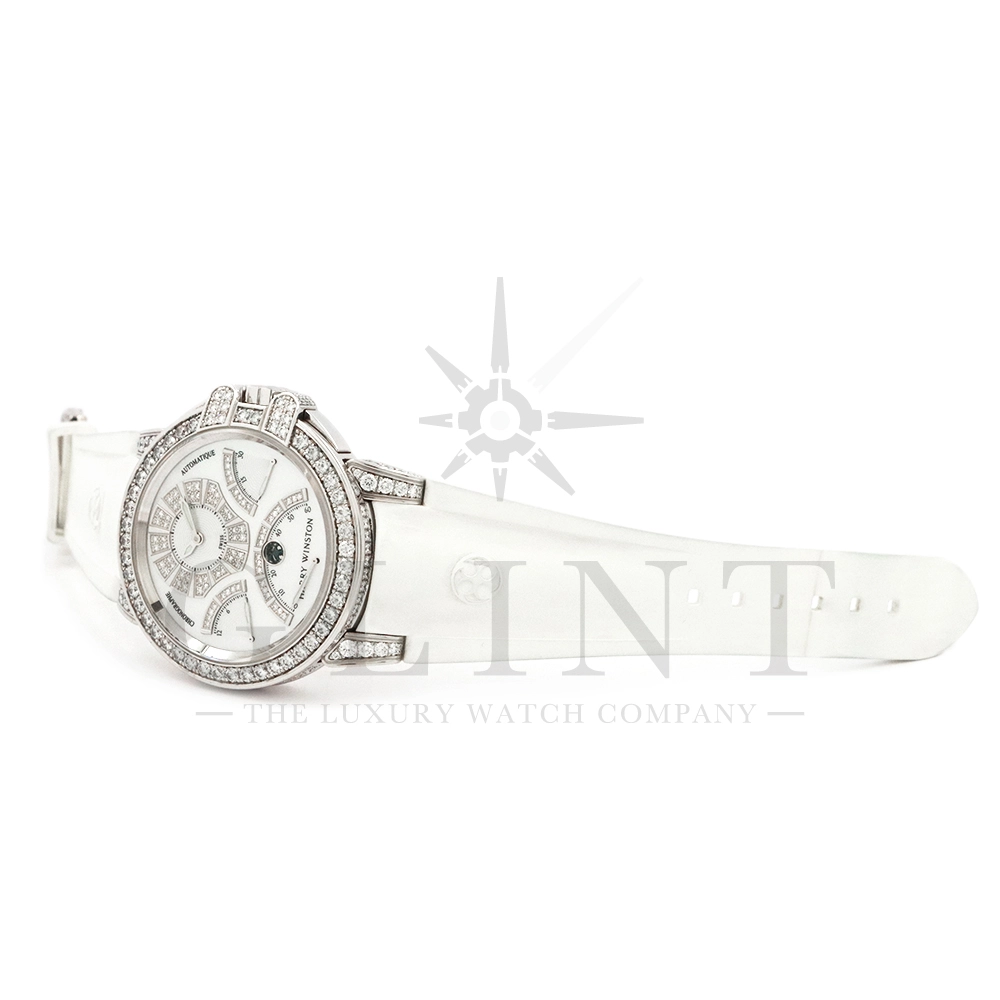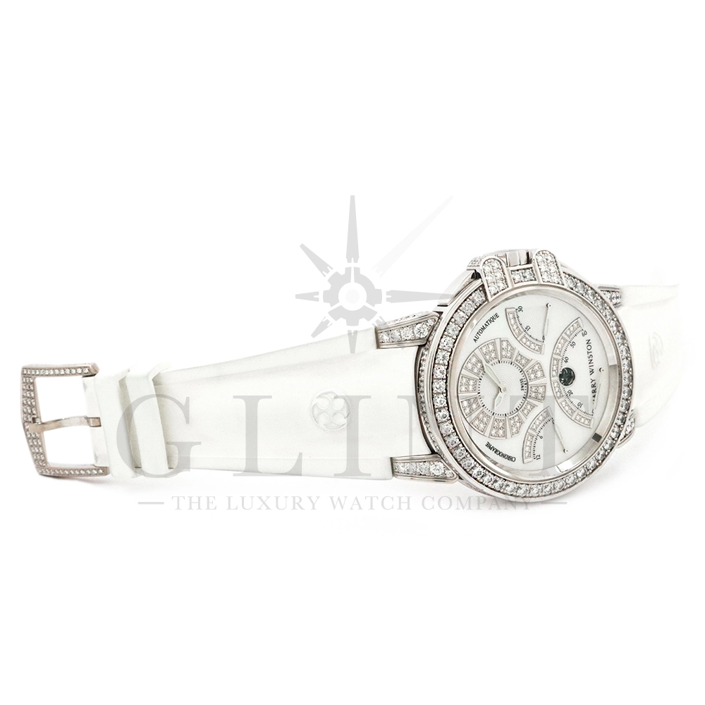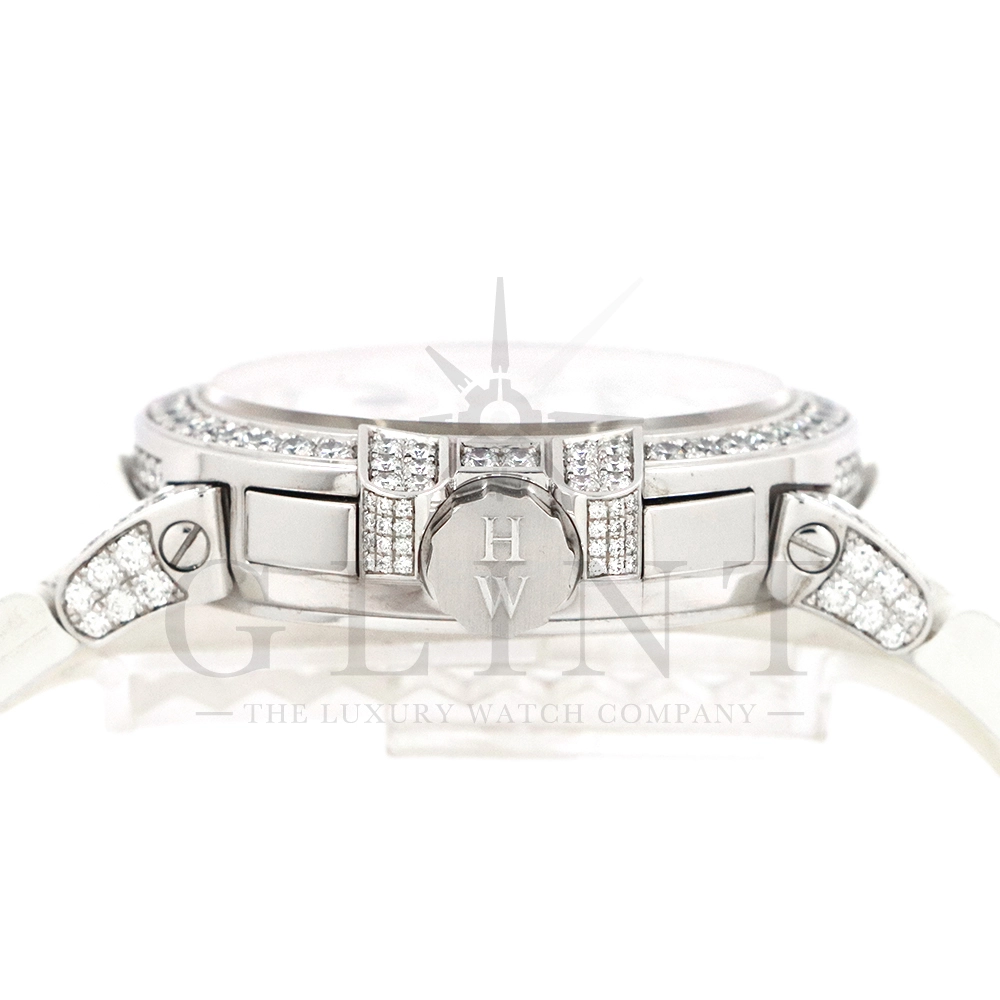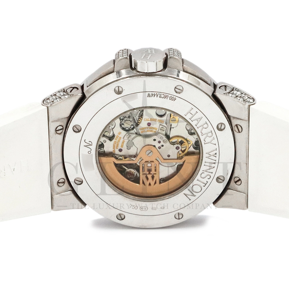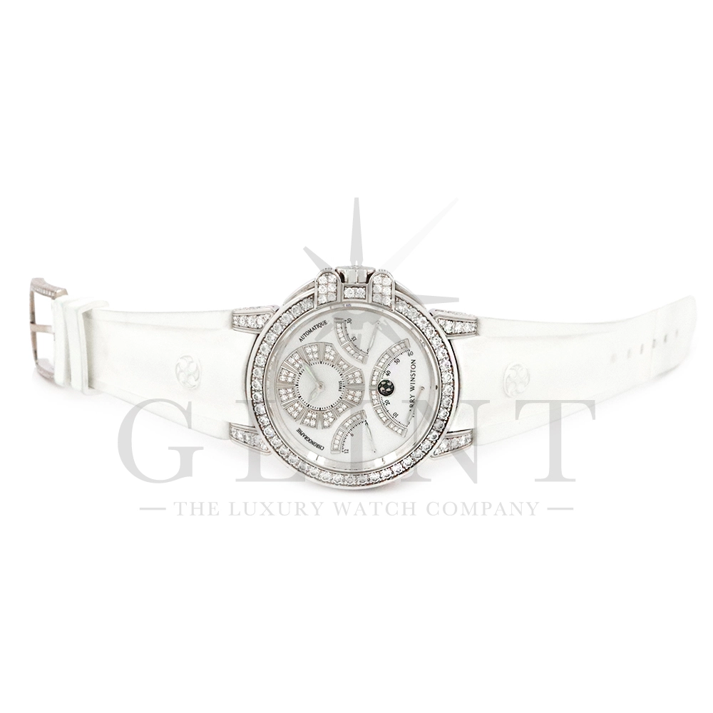 こちらはハリー・ウィンストン オーシャン トリレトロ クロノグラフです。ハリーウィンストン純正ダイヤモンドを贅沢に使用した大変人気の高いモデル。ケースサイドやラグ部分にまでダイヤモンドがセッティングされており、圧倒的な存在感を放ちます。角度や光加減によって様々な美しい表情を見せるホワイトシェル文字盤が高級感を更に後押ししてくれるでしょう。ディティールにこだわったハリーウィンストンらしい独創的なデザインと機能美を実現した最高級のジュエリーウォッチ。圧倒的な存在感でお客様のご満足度を高めてくれる逸品です。