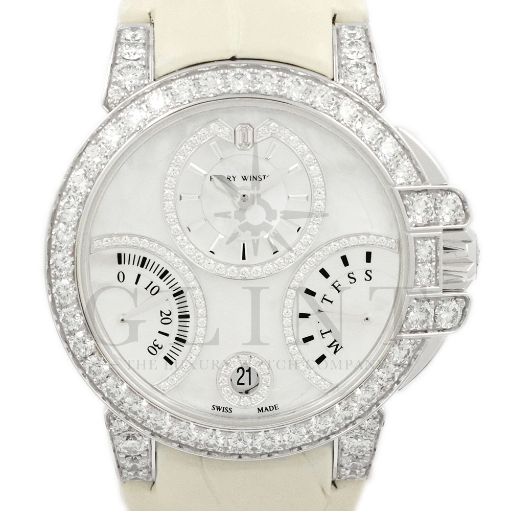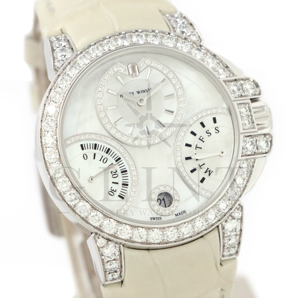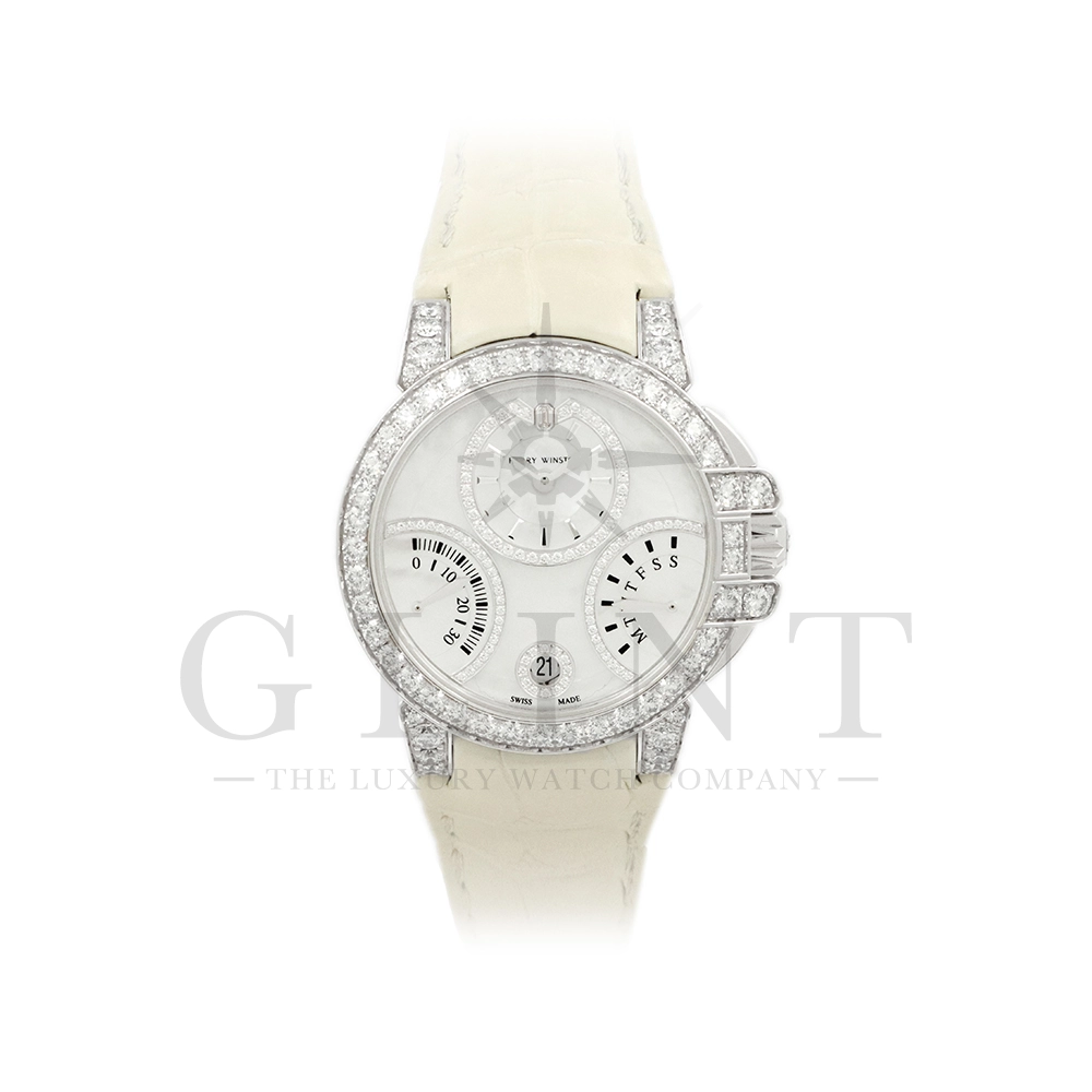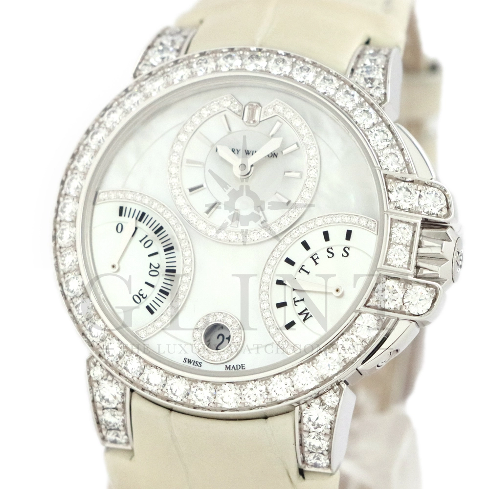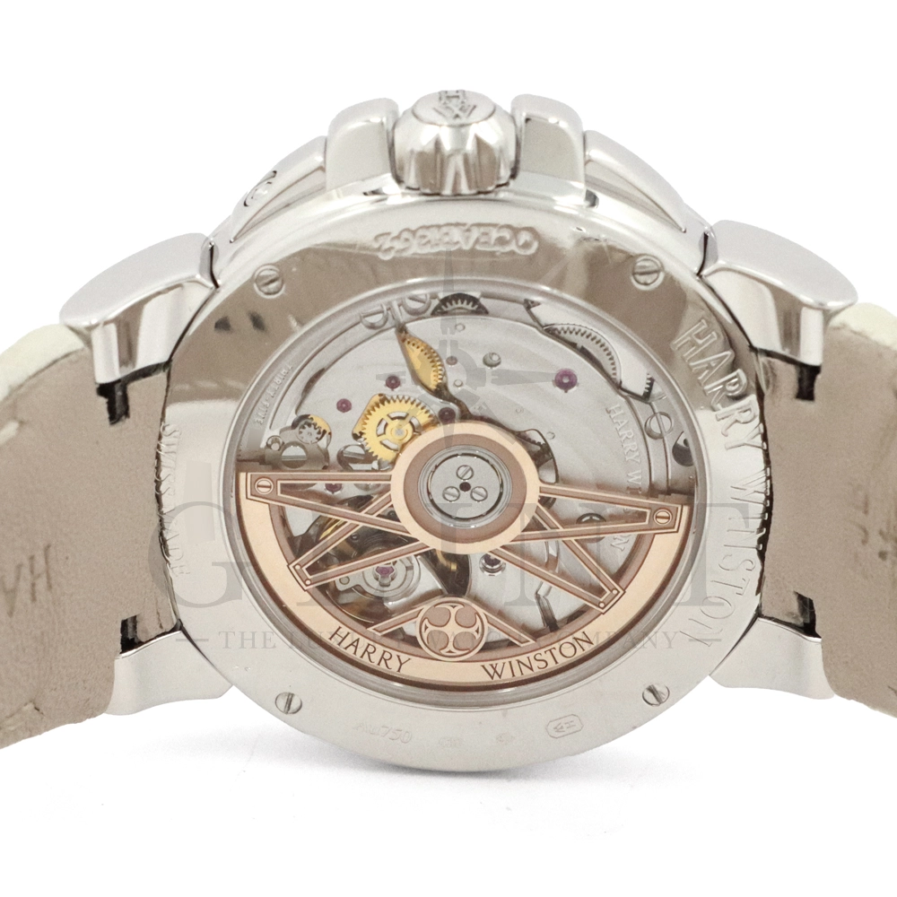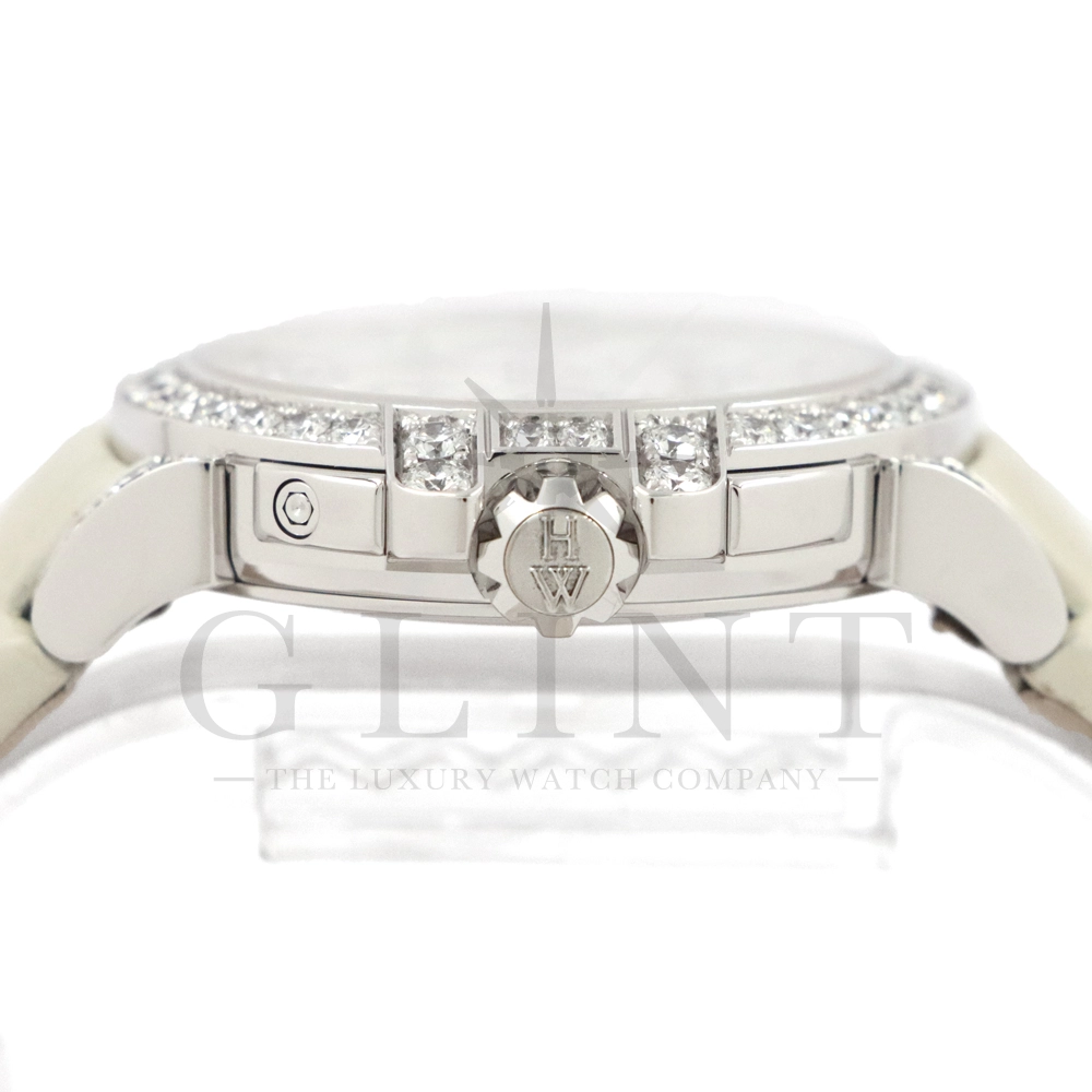 こちらはハリーウィンストン オーシャン バイレトログラード オートマティックです。ラウンド型のケース素材には18Kホワイトゴールドを採用しており、ケース上部やラグ、文字盤、尾錠には“キング・オブ・ダイヤモンド”の異名を持つハリー・ウィンストンが厳選する大粒の純正ホワイトダイヤモンドを贅沢にセッティング。エレガントでラグジュアリーな印象を際立たせてくれるとても美しい極上の逸品です。独創的なデザインとなるオフセンターの時刻表示に、秒と曜日を2本のレトログラード針で表示するバイレトログラード機構を搭載しており、実用性にも特化したハリー・ウィンストンの高度な時計製造技術を垣間見る事が出来るでしょう。唯一無二のスタイルを持つ美しく華麗なクリエイションを創造する世界的トップジュエラーが提案する究極のタイムピースをぜひご堪能下さい。