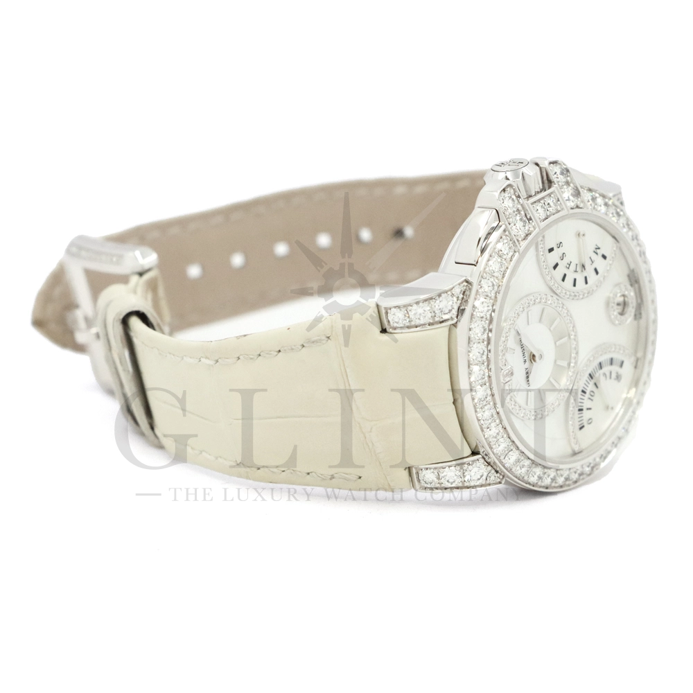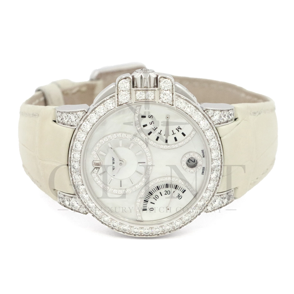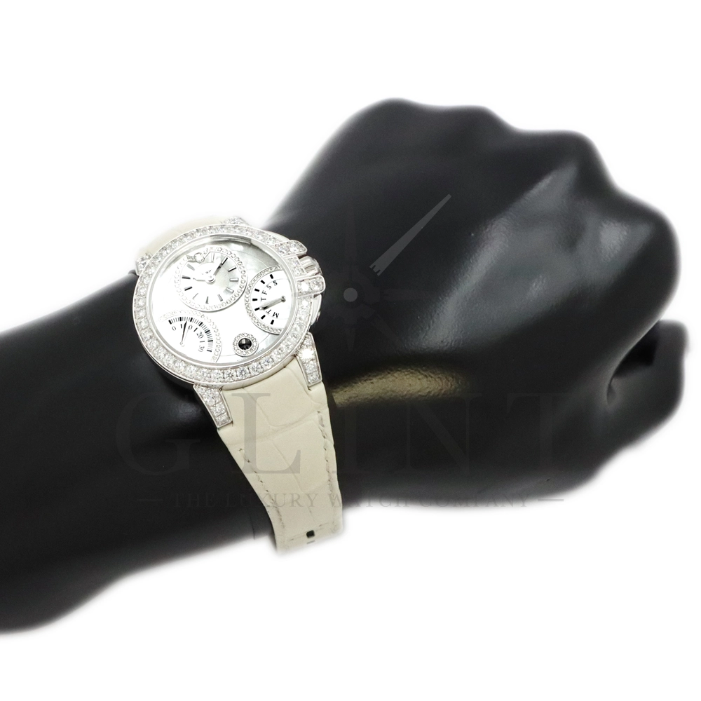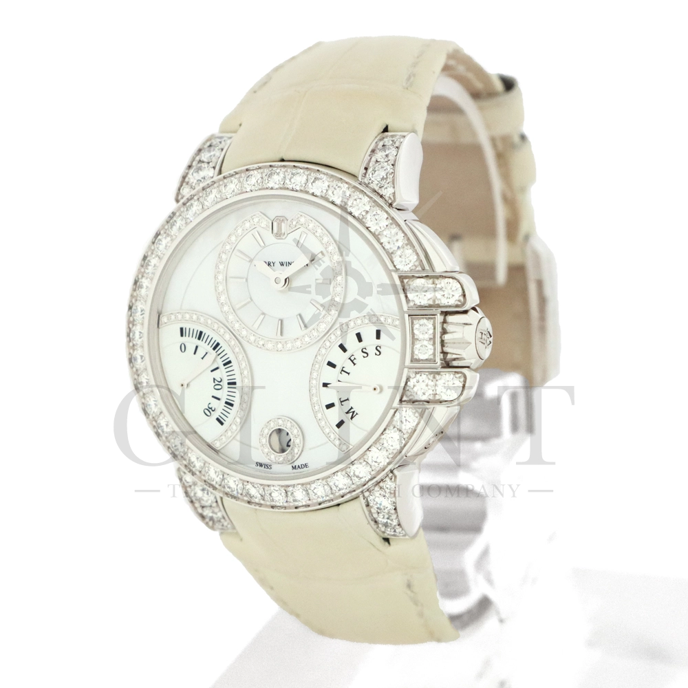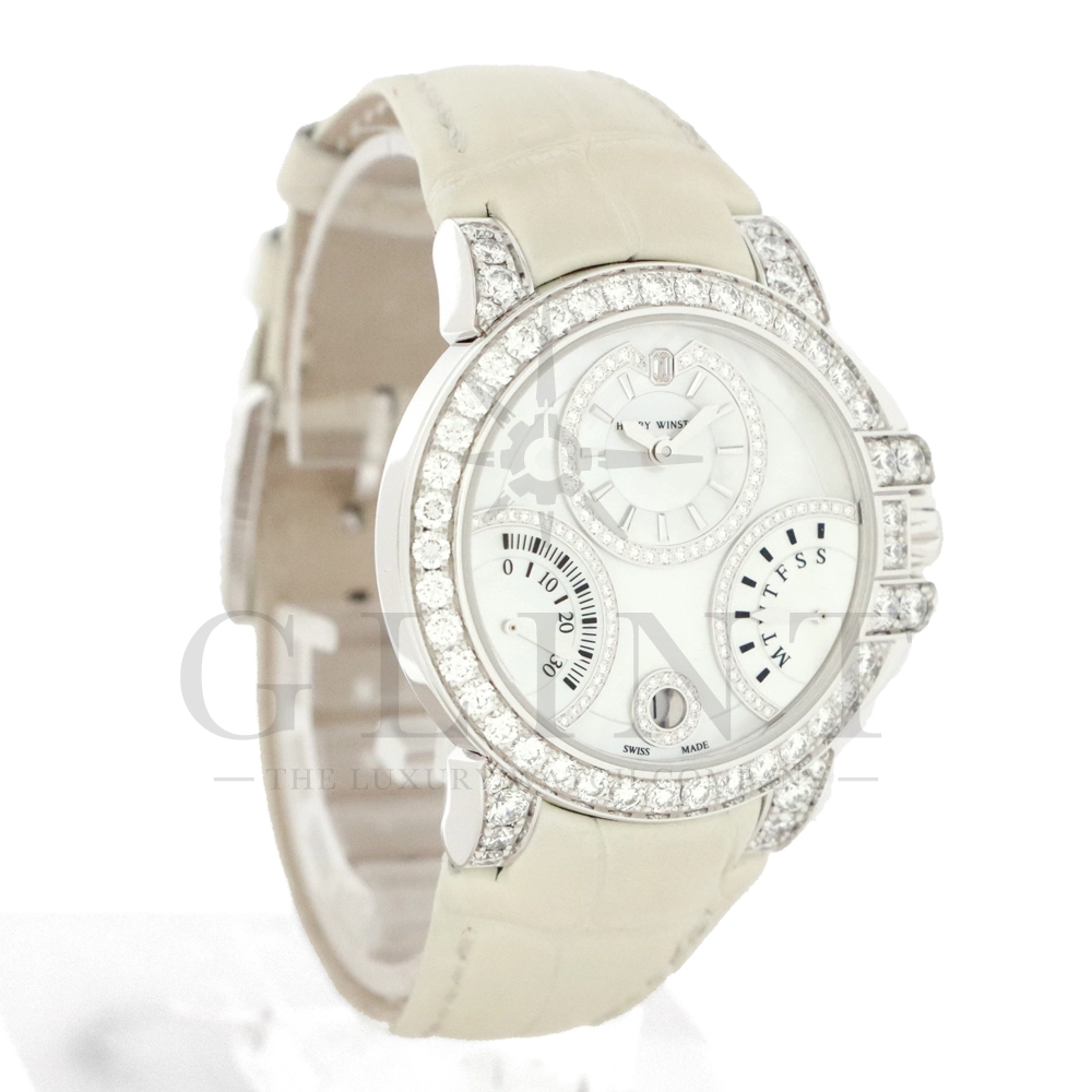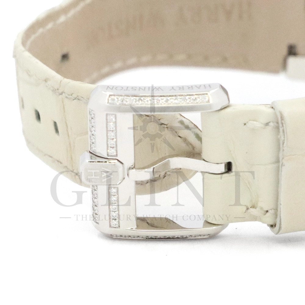 こちらはハリーウィンストン オーシャン バイレトログラード オートマティックです。ラウンド型のケース素材には18Kホワイトゴールドを採用しており、ケース上部やラグ、文字盤、尾錠には“キング・オブ・ダイヤモンド”の異名を持つハリー・ウィンストンが厳選する大粒の純正ホワイトダイヤモンドを贅沢にセッティング。エレガントでラグジュアリーな印象を際立たせてくれるとても美しい極上の逸品です。独創的なデザインとなるオフセンターの時刻表示に、秒と曜日を2本のレトログラード針で表示するバイレトログラード機構を搭載しており、実用性にも特化したハリー・ウィンストンの高度な時計製造技術を垣間見る事が出来るでしょう。唯一無二のスタイルを持つ美しく華麗なクリエイションを創造する世界的トップジュエラーが提案する究極のタイムピースをぜひご堪能下さい。