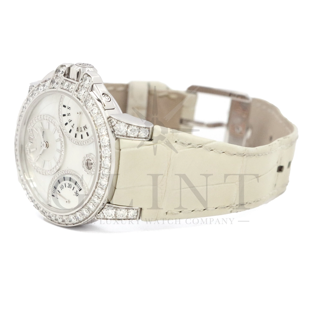 文字盤:ホワイト マザー・オブ・パール 99個のラウンド・ブリリアントカット・ダイヤモンド 1個のエメラルドカット・ダイヤモンド