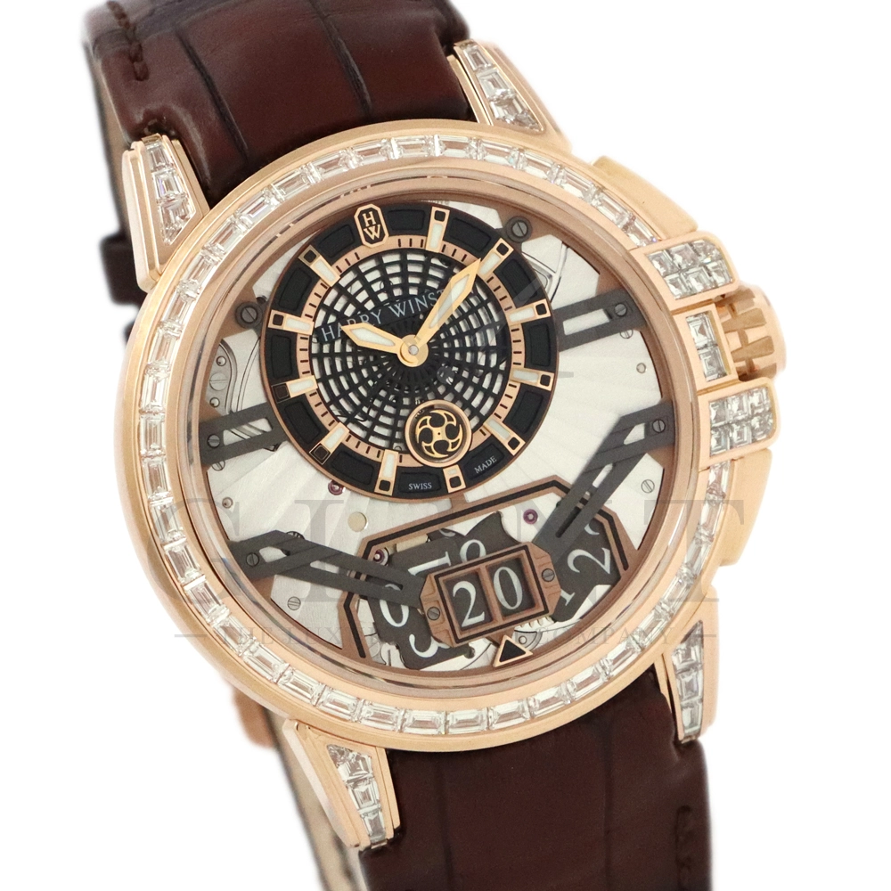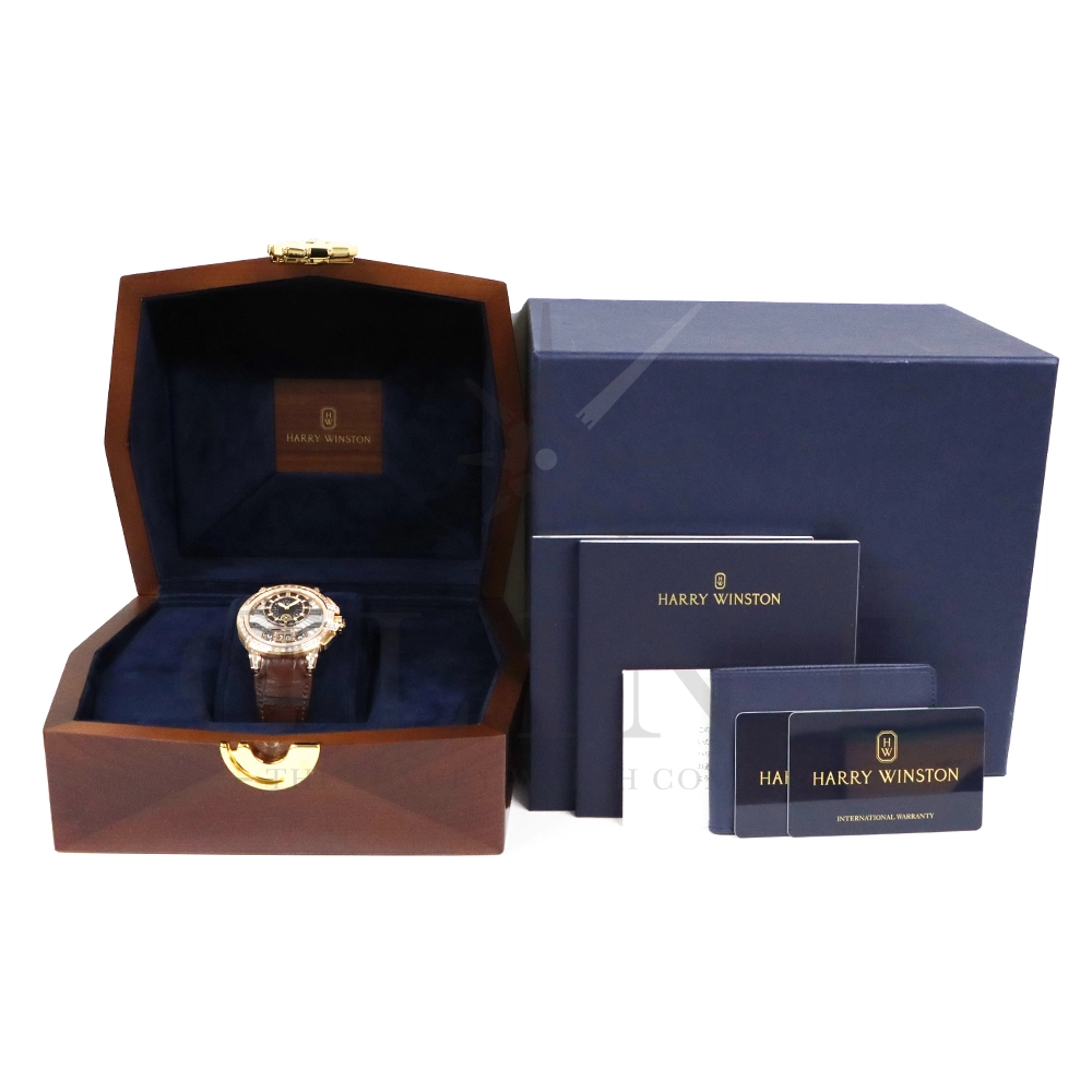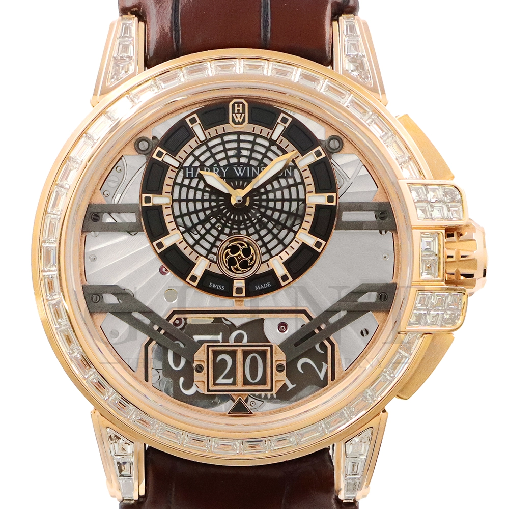 ハリー・ウィンストンが革新的な技術や素材、伝統的な時計作りの技を融合させる事で新たな個性を創造する意味を込められた限定生産シリーズ「プロジェクト Z」。こちらはハリーウィンストン本店を構えるニューヨークの建造物をモチーフとした「プロジェクト Z11」のデザインを継承し、素材に18Kローズゴールドを採用したオーシャン・ビッグデイト・オートマティック 42mmです。モダンにデザインされたラウンドケースにオフセンター配置の時・分表示を搭載したモデル。そして6時位置には立体的なフレームを使用したビッグデイト表示となっており、宙に浮かんでいるかのような立体感で迫力溢れる仕上がりになっております。さらにこちらは、ハリーウィンストン純正バゲットダイヤモンドがセッティングされた世界限定20本のみしか生産されていない超希少モデルとなっており、圧倒的な輝きで腕元を華やかに演出してくれる事でしょう。世界トップジュエリーブランドらしく、他ブランドでは味わえない洗練された雰囲気を感じさせてくれる極上の一本です。