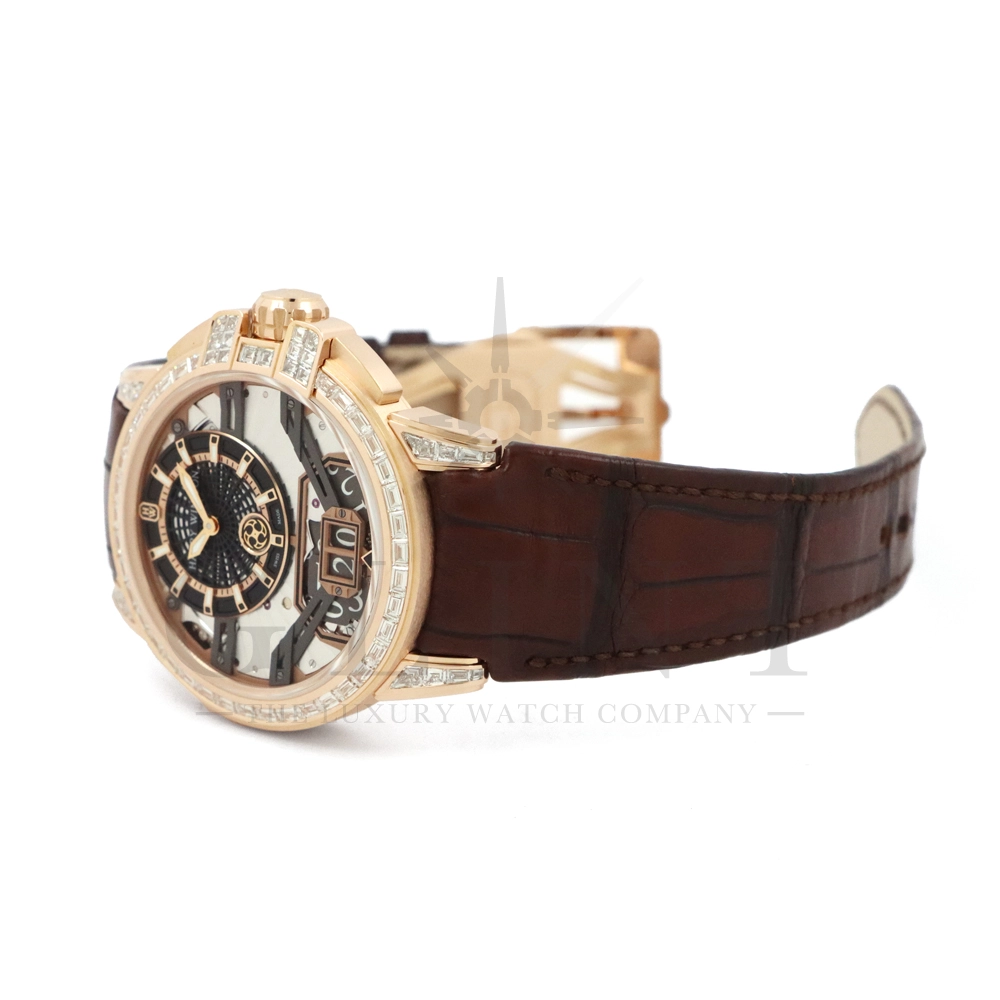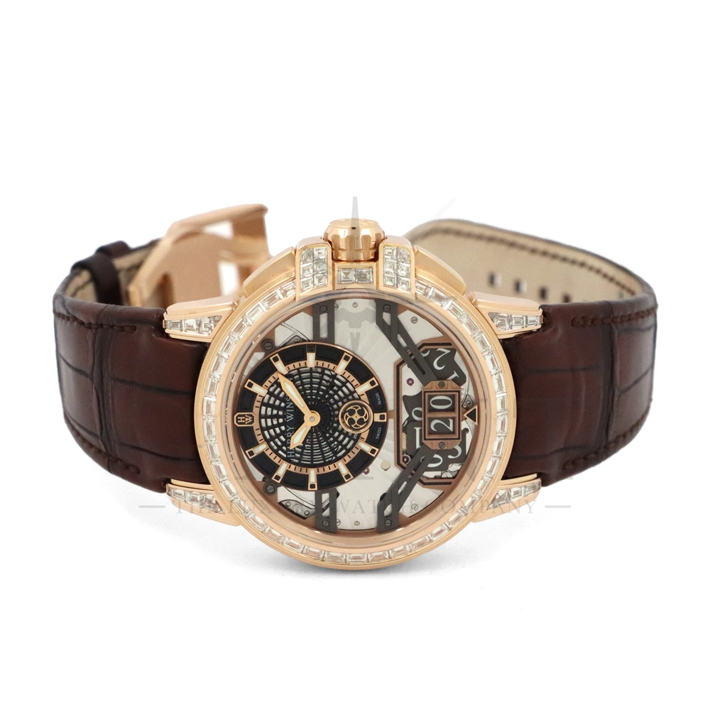 文字盤:オープンワークのダイヤル、フレームにロジウムメッキを施したオフセンターダイヤル、蛍光素材でコーティングを施した18Kゴールド製マーカー、ブラックグリッド、18Kゴールド製ロゴ