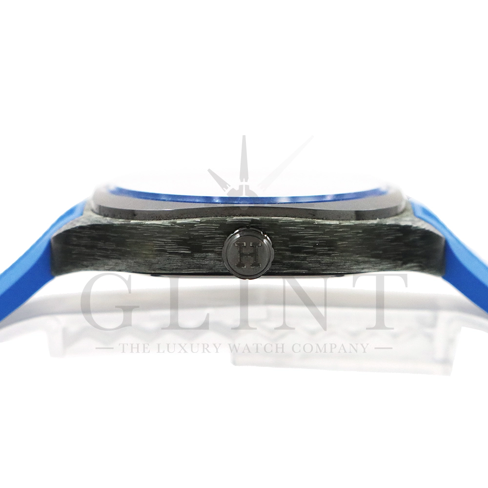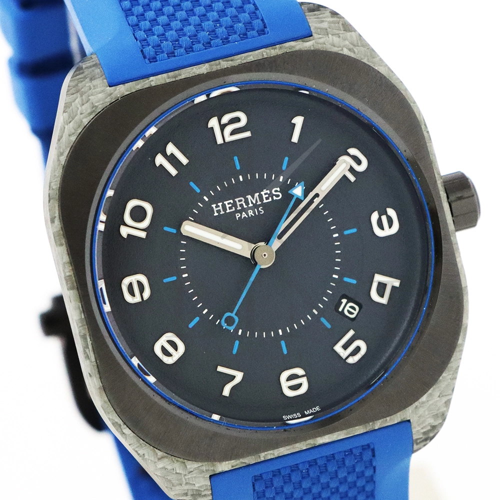 こちらは「Watches & Wonders 2021」で発表されたエルメス H08。ケース素材にDLCチタンを使用し、モダンでスポーティーなデザインによってエルメスのラグジュアリースポーツウォッチとして位置付けられるモデルです。搭載されたムーブメントCal.H1837はパワーリザーブ約50時間、防水性能は10気圧と十分なスペックを有し、このムーブメントはパルミジャーニフルリエのムーブメント部門として知られるヴォーシェ・マニュファクチュール・フルリエのCal.3002をベースとしてエルメス専用に製造されたもので、シースルーバックより美しいムーブメントをご堪能いただけます。文字盤のインデックスには、ケースのフォルムに合わせた丸みを帯びたフォント配置されており、時計全体の統一感を生み出しています。ストラップは軽量なラバーが採用され、スポーティでありながら上品さを兼ね備えています。エルメスが細部にまでこだわった、非常に高い完成度を誇るラグジュアリースポーツウォッチであることは間違いございません。